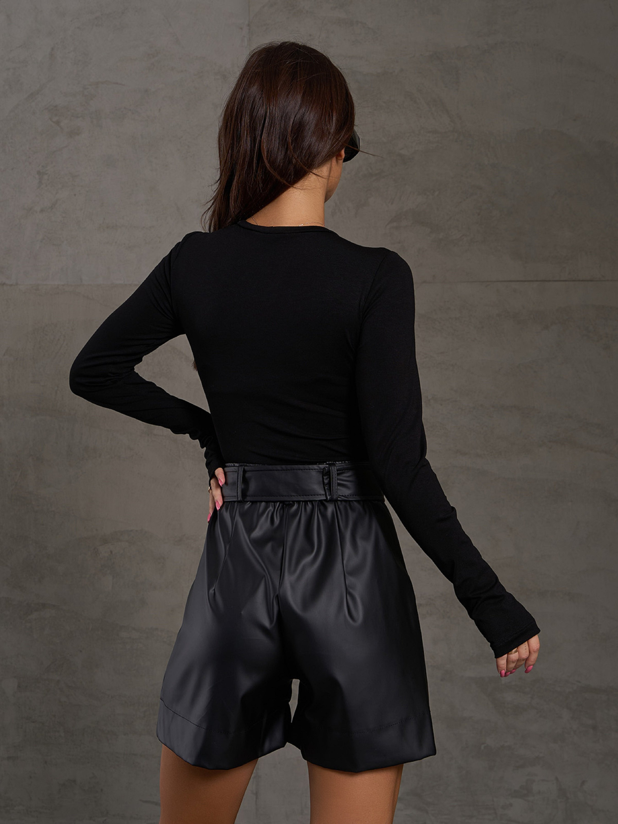 Облягаючий демісезонний лонгслів з вирізами для великих пальців. Модель з довгими рукавами та закритою О-подібною горловиною. Виріб виконаний із еластичної однотонної віскози чорного базового кольору. Напівобхват: Груди: S(36), M(38), L(40), XL(42), Довжина виробу - 52, Рукав - 60, Тканина: Висока еластичність.