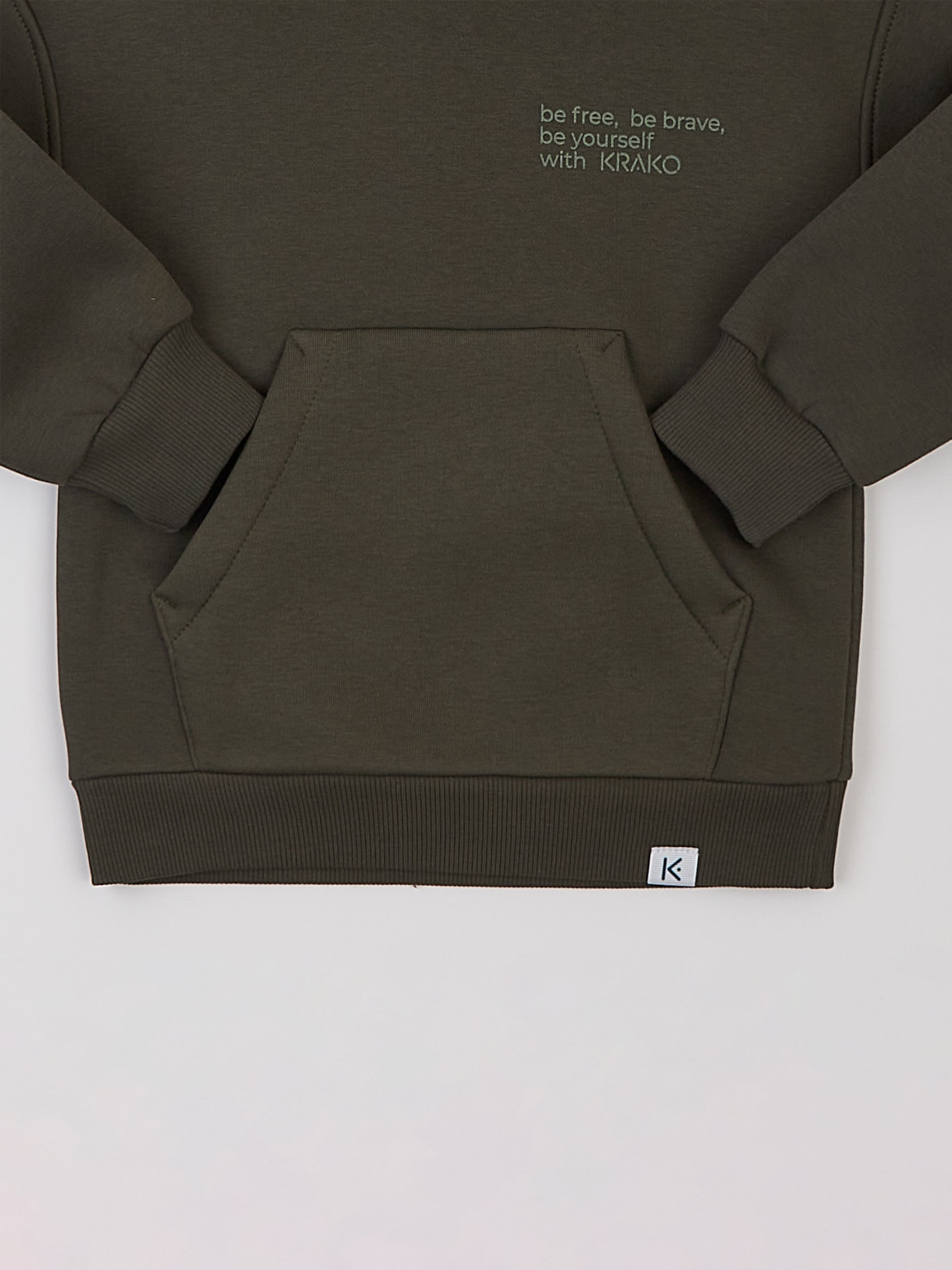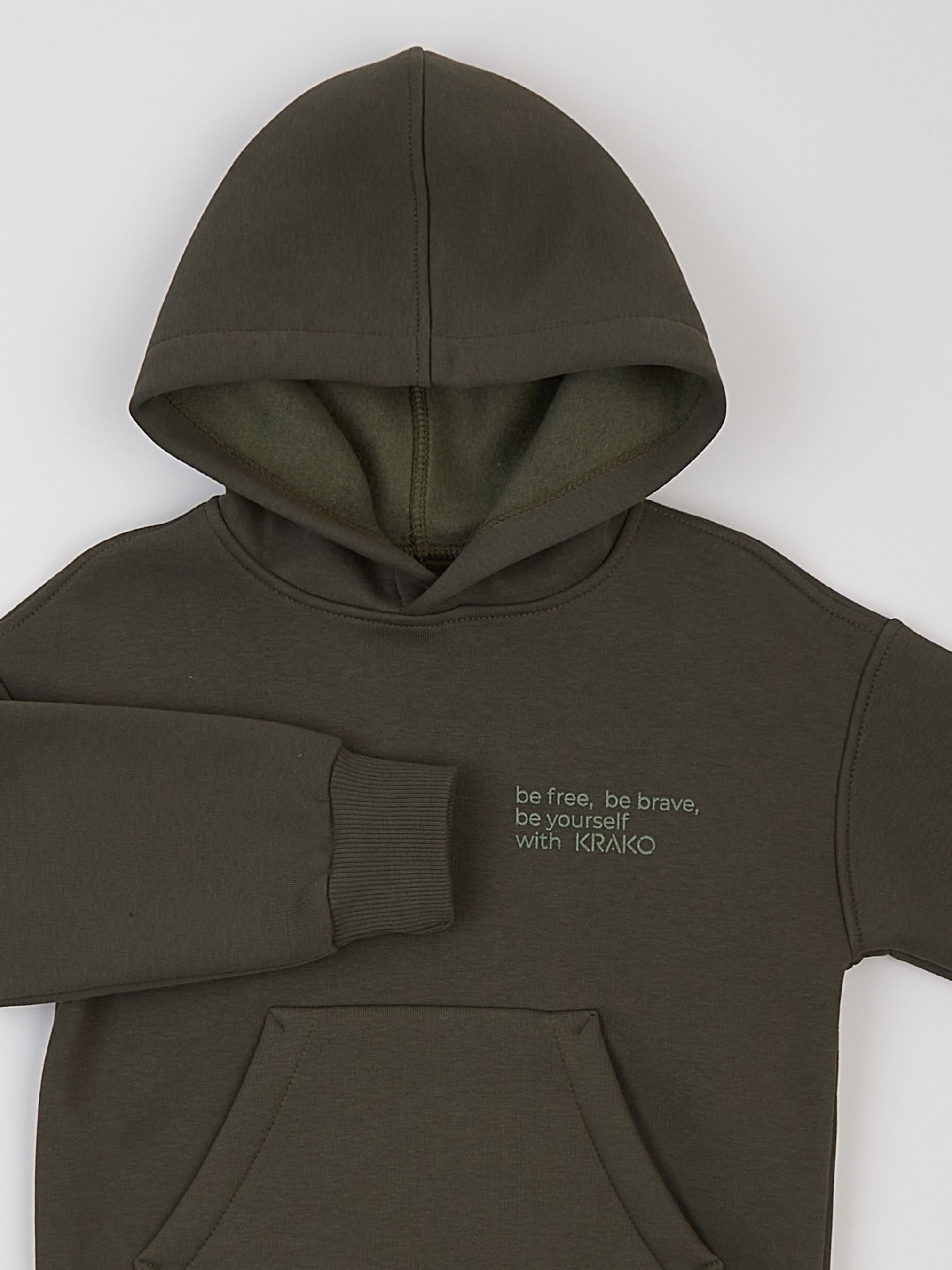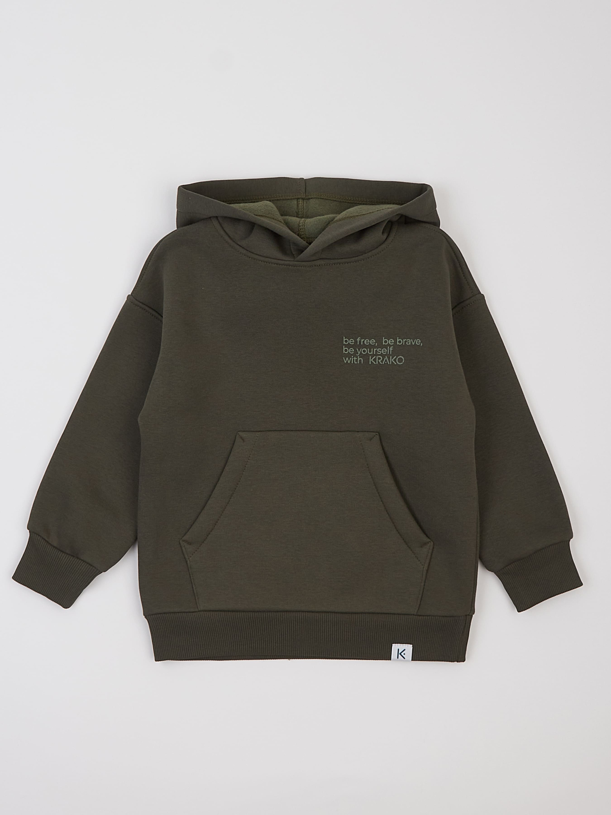 Практичне утеплене дитяче худі кольору хакі стане чудовим вибором для прохолодної погоди. Воно створює відчуття затишку та тепла, а його стильний дизайн неодмінно сподобається як дітям, так і їхнім батькам. Капюшон забезпечує додатковий захист від холоду й вітру, додаючи комфорту навіть у найхолодніші дні. Простора передня кишеня — це ідеальне місце для зігрівання рук чи зберігання необхідних дрібниць. Зручний та продуманий крій дозволяє дитині рухатися вільно, роблячи худі ідеальним для активних ігор. Завдяки утепленій тканині худі відмінно зберігає тепло, тому стане незамінним у гардеробі на осінньо-зимовий сезон. Колір хакі додає практичності й легко комбінується з іншими елементами одягу. Оригінальний напис на передній частині надає виробу особливого характеру, даруючи позитивний настрій та надихаючи оточуючих. Сертифікат OEKO TEX Standard 100; Вид тканини: футер (трикотаж з начосом); Склад: 70% бавовна, 30% поліестер; Колір основної тканини: хакі.