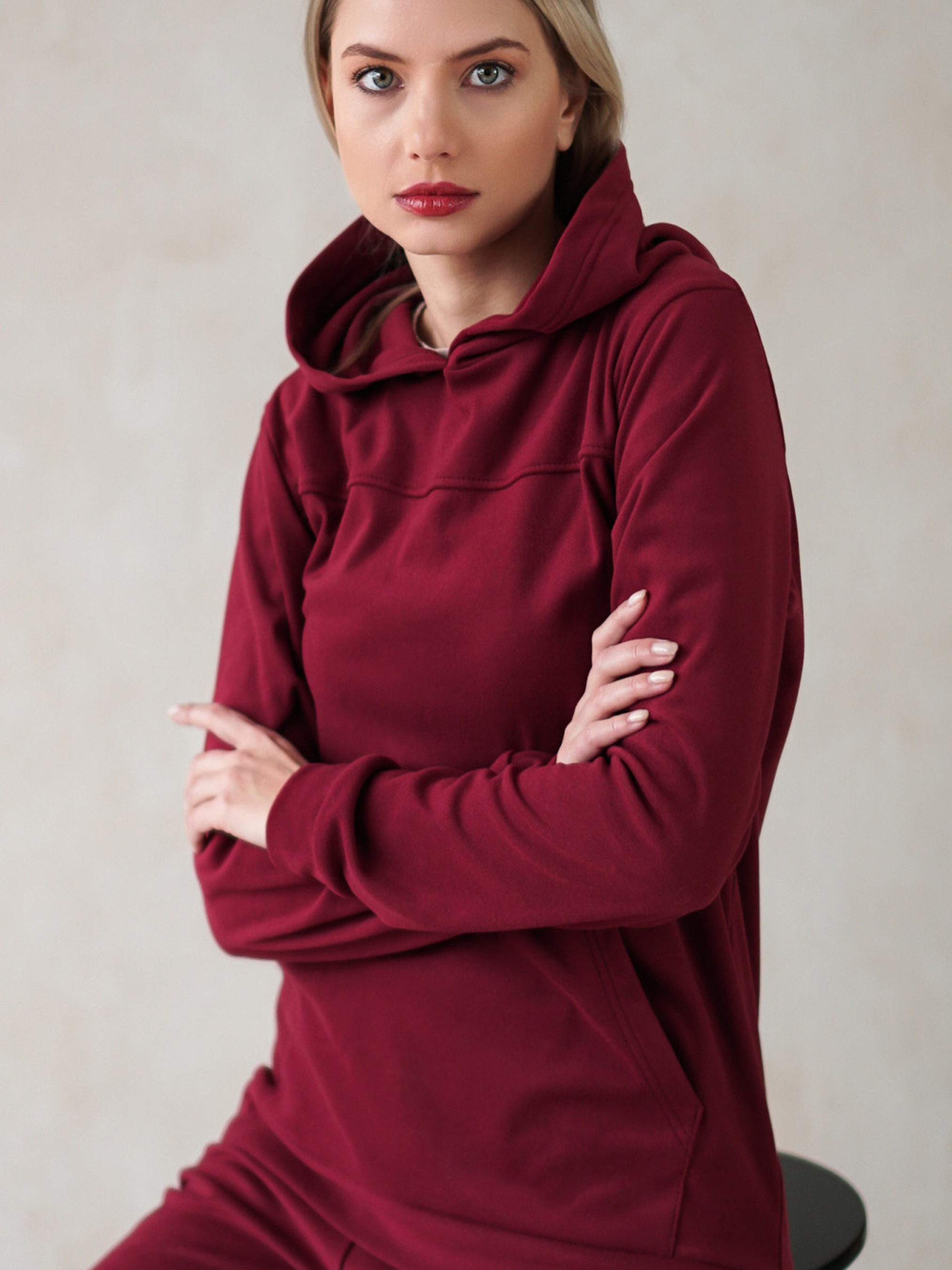 Жіноче бордове худі з манжетами, кишенями та прямим кроєм Стильне та комфортне бордове худі – ідеальний вибір для повсякденного гардероба. Його м'яка тканина, зручний крій та практичні деталі роблять цю модель чудовим доповненням до будь-якого образу. Основні характеристики Приємний до тіла матеріал – забезпечує комфорт на весь день Класичний прямий крій – підходить для будь-якого типу фігури Зручні кишені – для рук або дрібних речей Манжети на рукавах і внизу виробу – утримують тепло та додають стилю Формат "через голову" – легко вдягати та знімати Як носити Бордове худі чудово поєднується з джинсами, спортивними штанами та спідницями. Для стильного casual-образу доповніть його кросівками та рюкзаком. Якщо хочете створити затишний лук, оберіть легінси та зручні кеди. Ця модель стане улюбленим елементом гардероба, додаючи тепла, комфорту та стилю в будь-яку пору року.