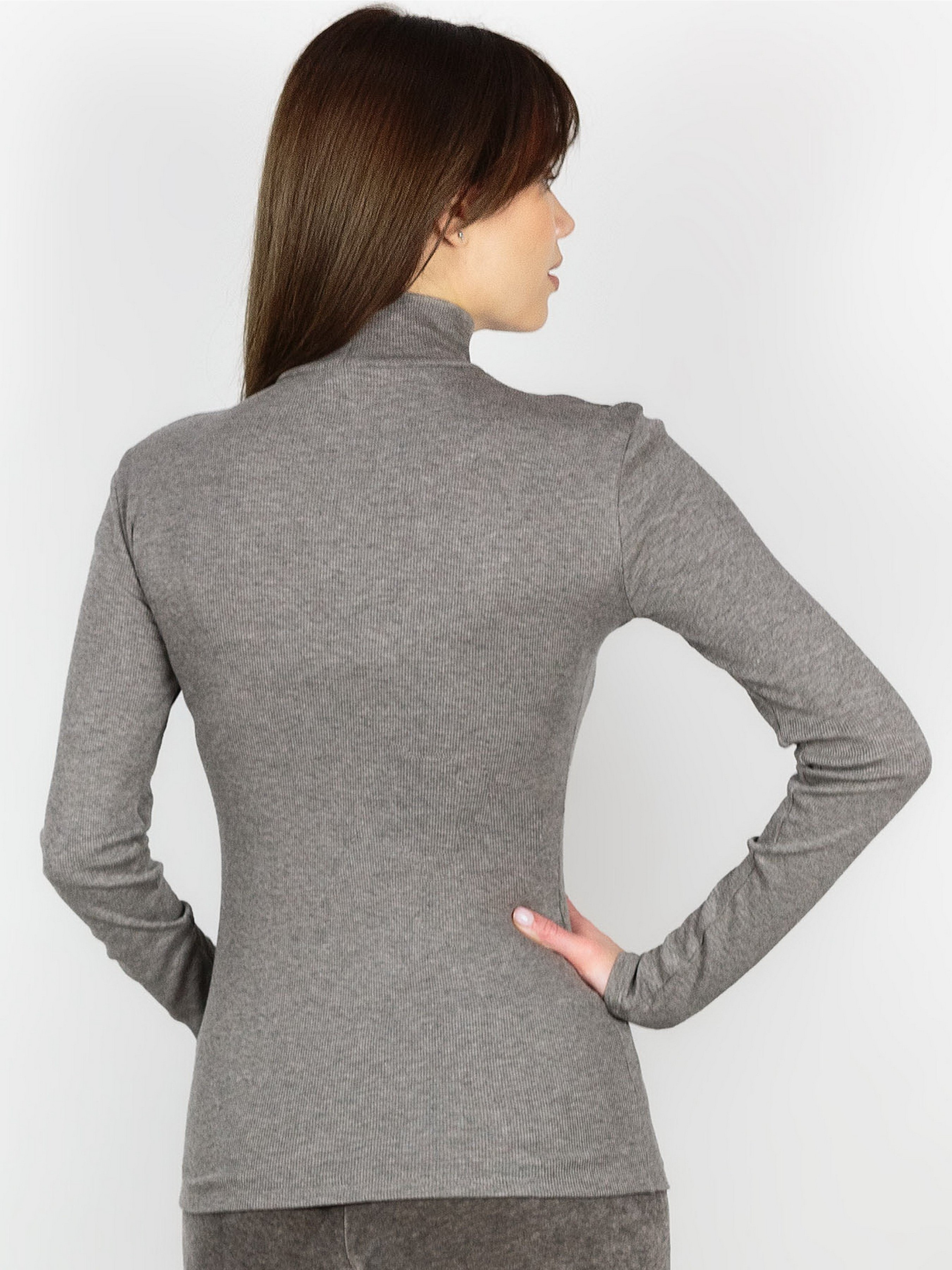 Гольф виготовлений з м'якої тканини сірого кольору, який надає йому особливого шарму та елегантності. Він може бути чудовим доповненням до вашого повсякденного гардеробу або стати затишним домашнім одягом для холодних вечорів. Незалежно від того, як ви оберете його носити, гольф забезпечить комфорт і стиль, а також підійде для багатьох сезонів завдяки своїй універсальності. Виріб виконано у прилеглому силуеті, рукав довгий, комір високий.