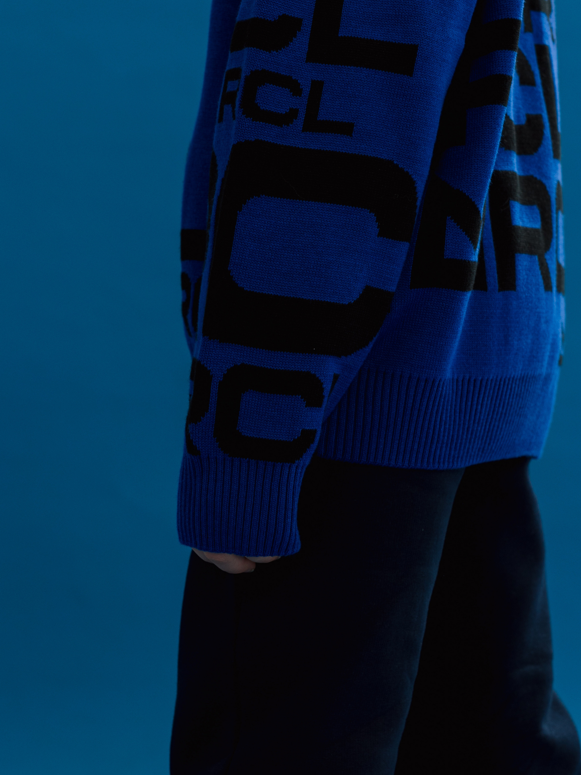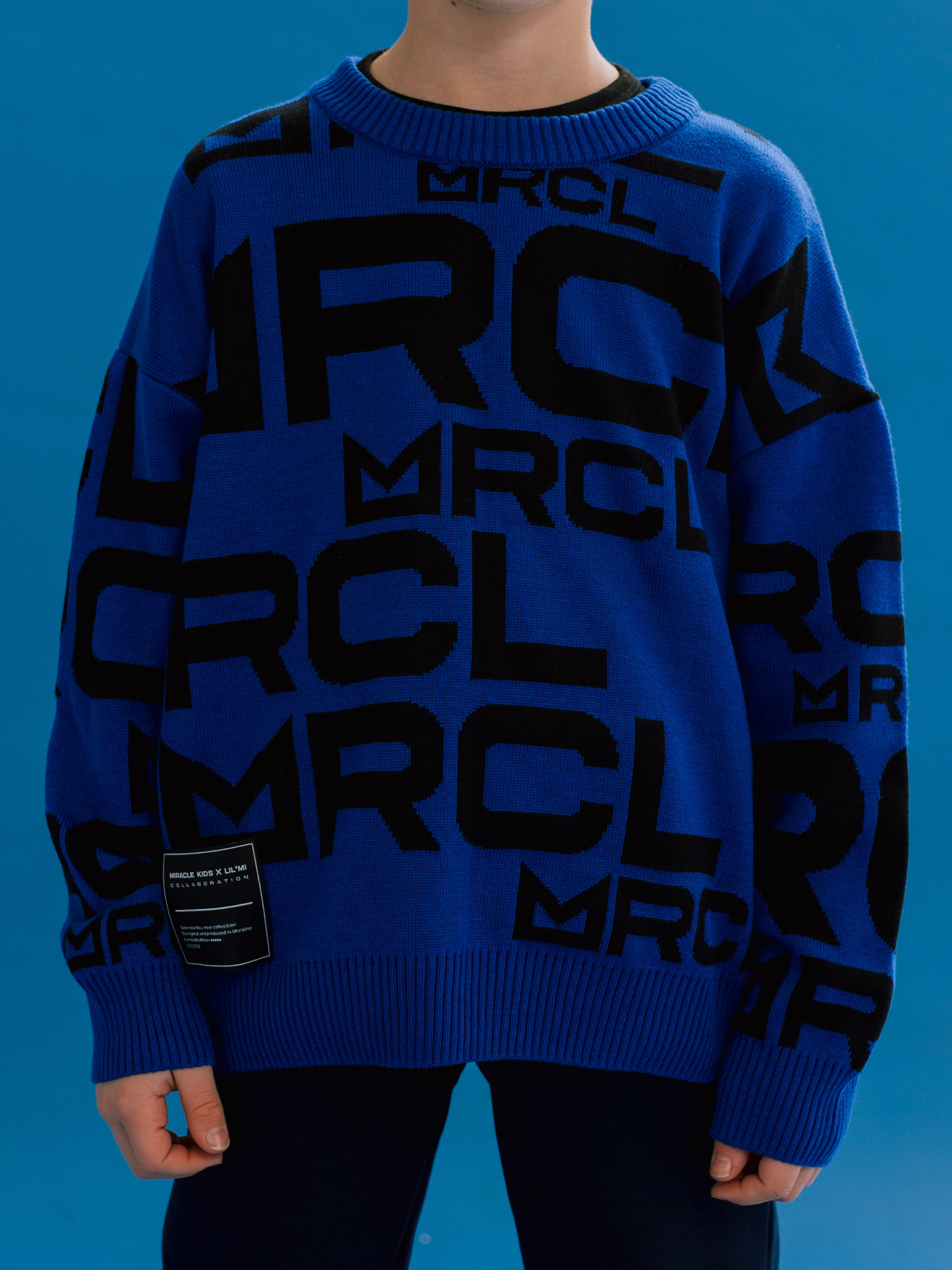 Синій дитячий джемпер з контрасним чорним брендуванням.