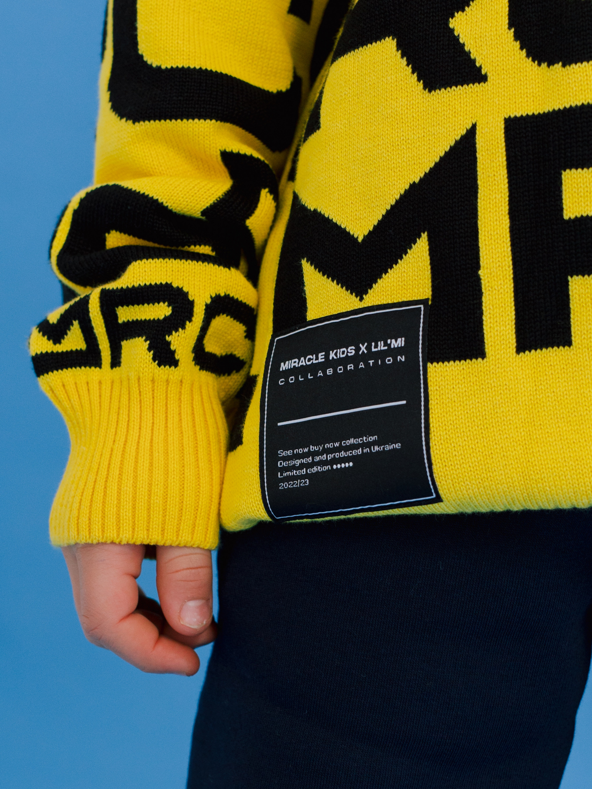 Жовтий дитячий джемпер з контрасним чорним брендуванням.