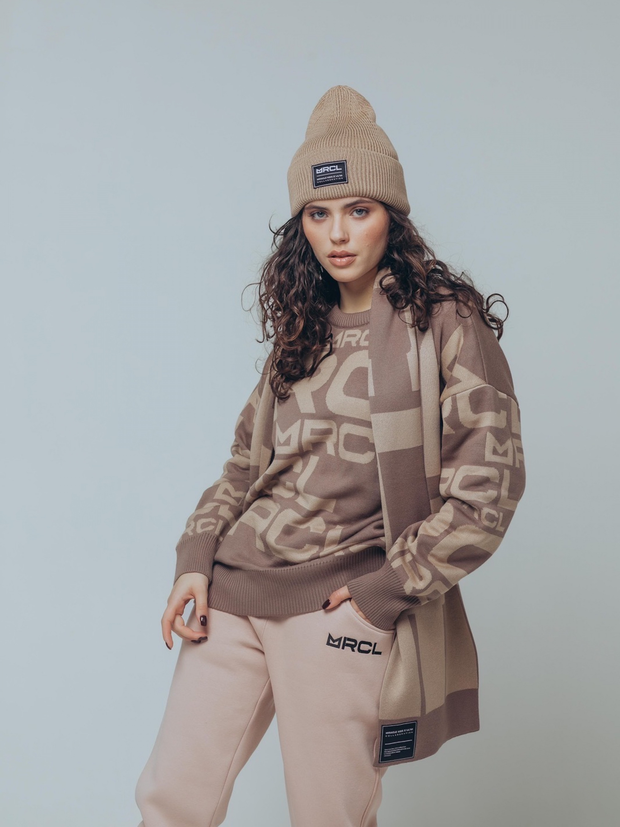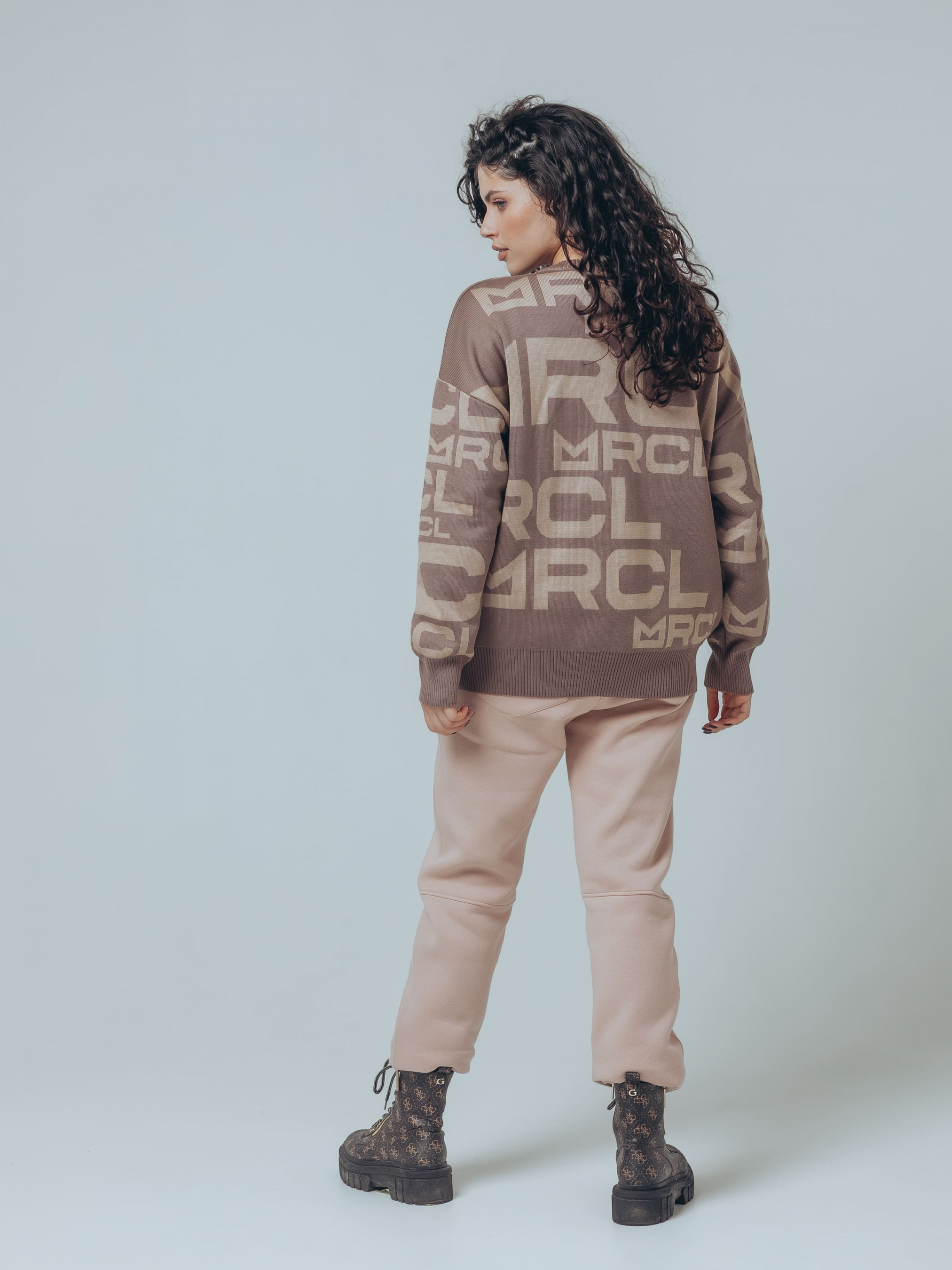 Дорослий джемпер кольору молочний шоколад з бежевим брендуванням.