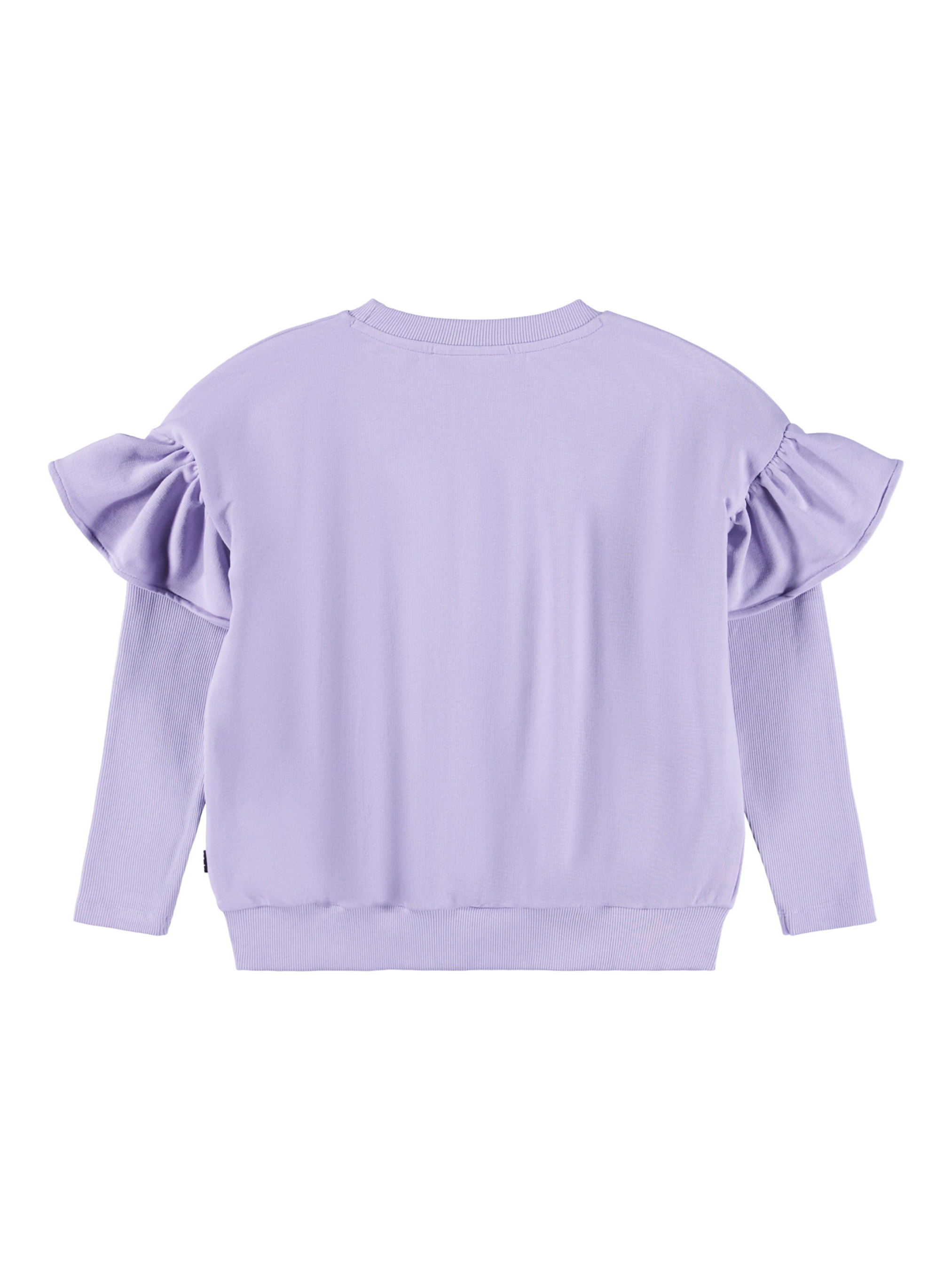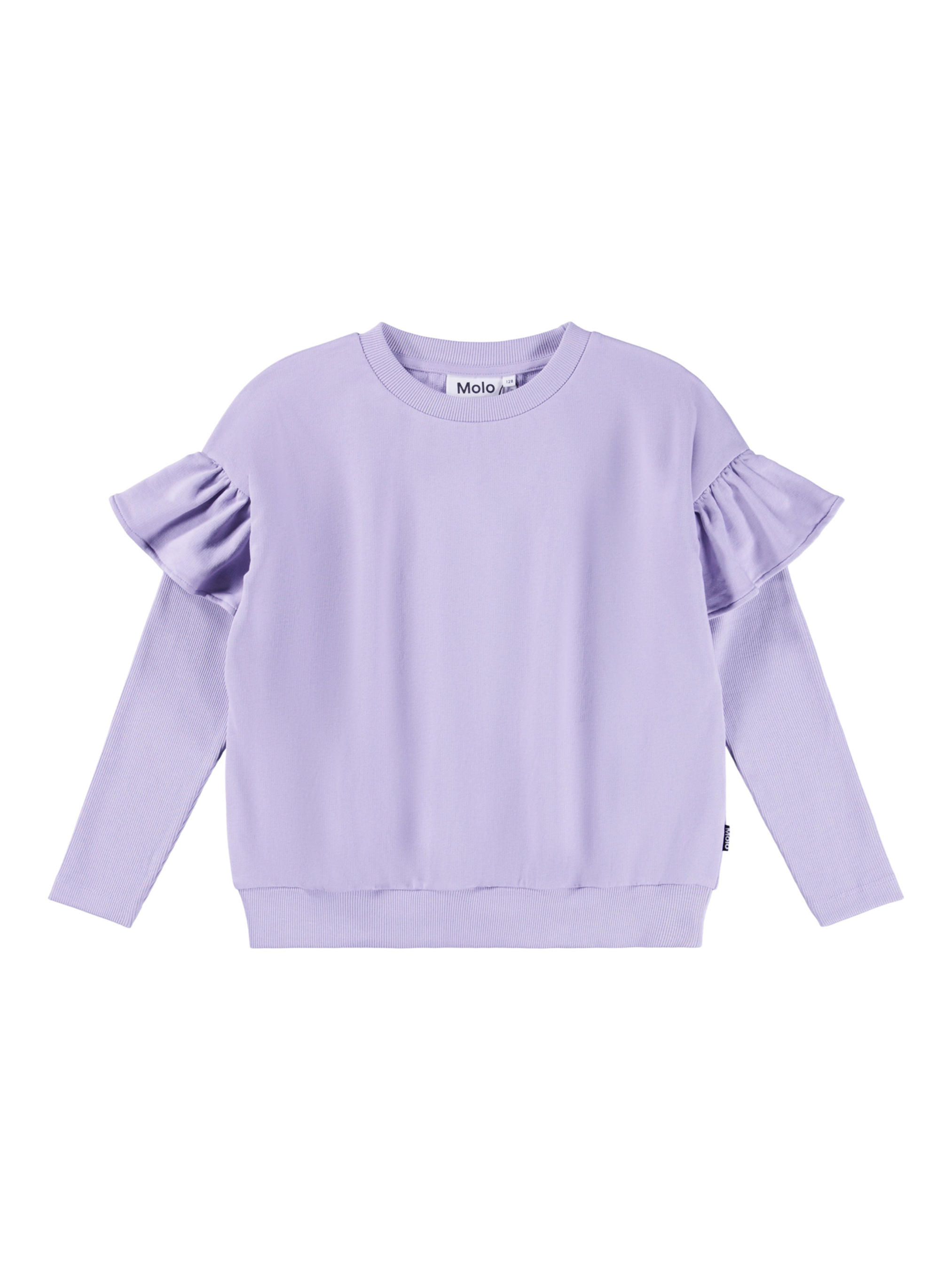Світшот Molo "Margit Faded Purple". Особливості: матеріал – organic cotton* з незначним додаванням еластану; сертифіковано GOTS** – виготовлено із сертифікованих органічних матеріалів; декорований оборками на рукавах; круглий виріз горловин; крій рукава – реглан; по низу еластичний ребристий манжет; ідеально поєднується зі штанами Molo Abbey Faded Purple.
