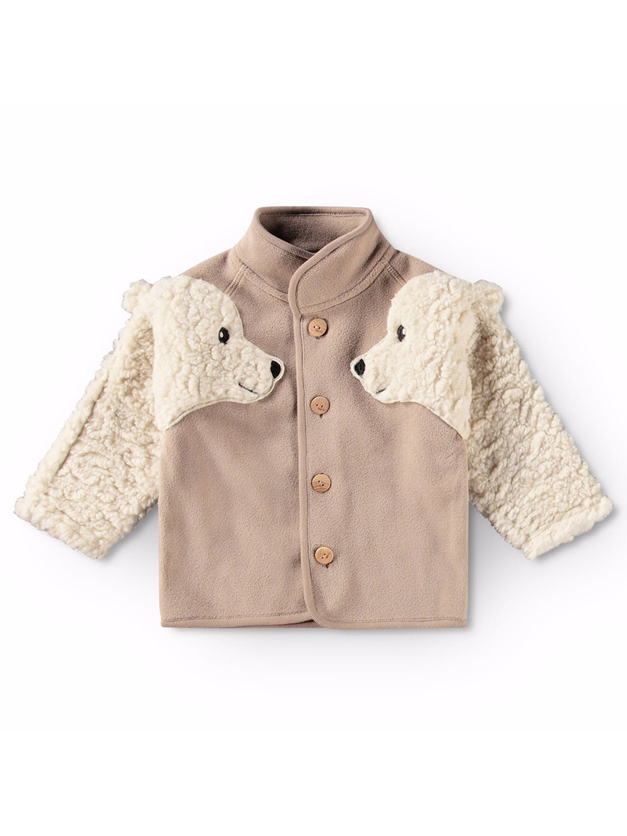 Флісова толстовка Molo "Uli Mocha".Особливості: містить не менше 50% поліестеру з перероблених матеріалів, сертифікованого GRS (Global Recycled Standard)* спереду застібається на гудзики високий комір рукави декоровано 3D деталями з Teddy флісу у вигляді білого ведмедя окантовка на комірі, спереду та по низу з ребристої тканини. *GRS – це міжнародний і добровільний стандарт, що перевіряє та відстежує перероблені матеріали від початкової сировини до кінцевого продукту.