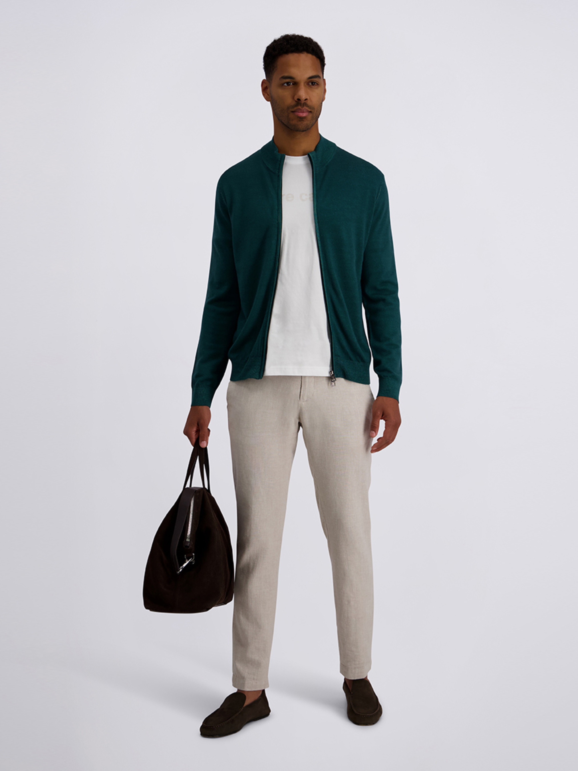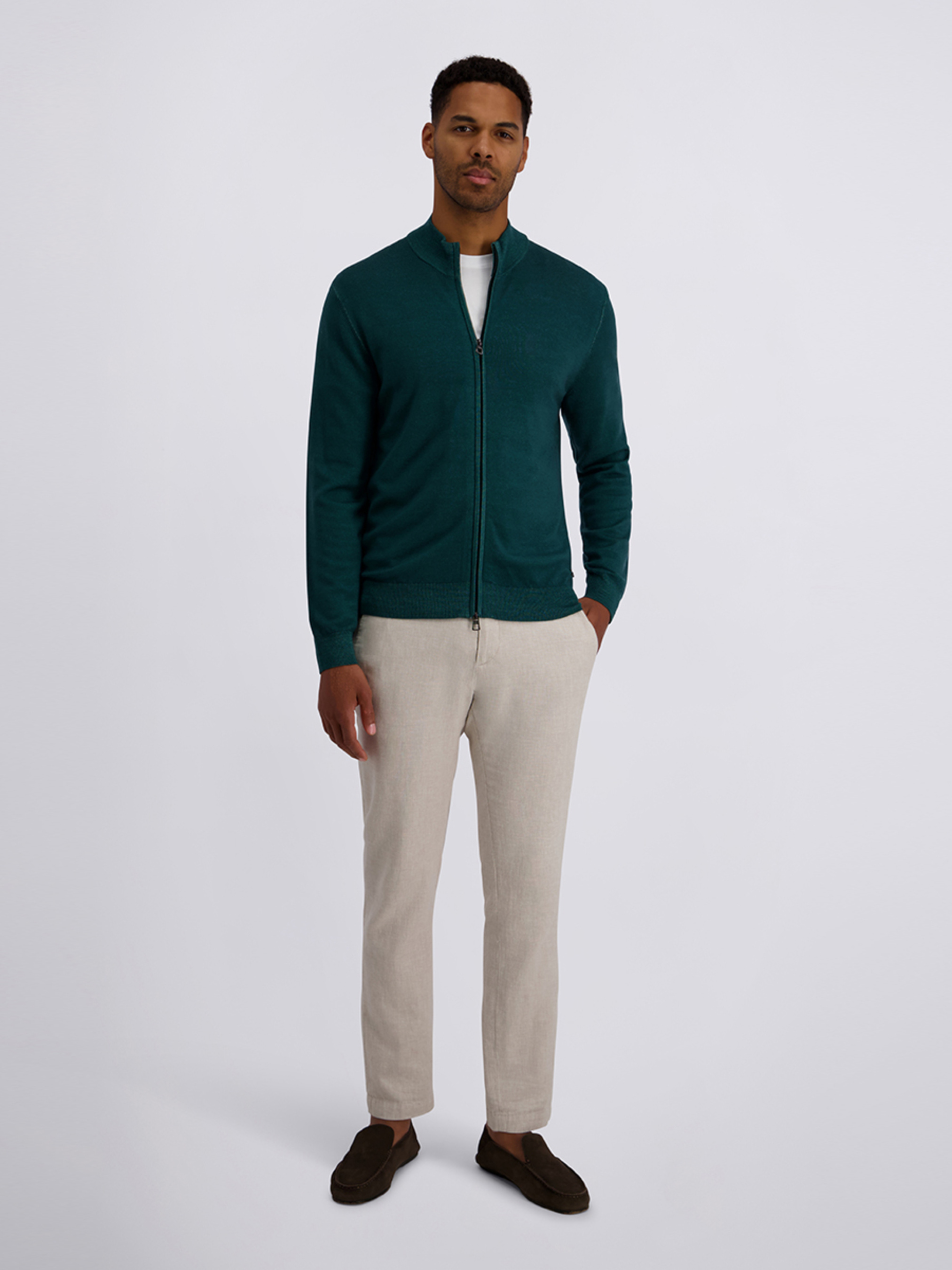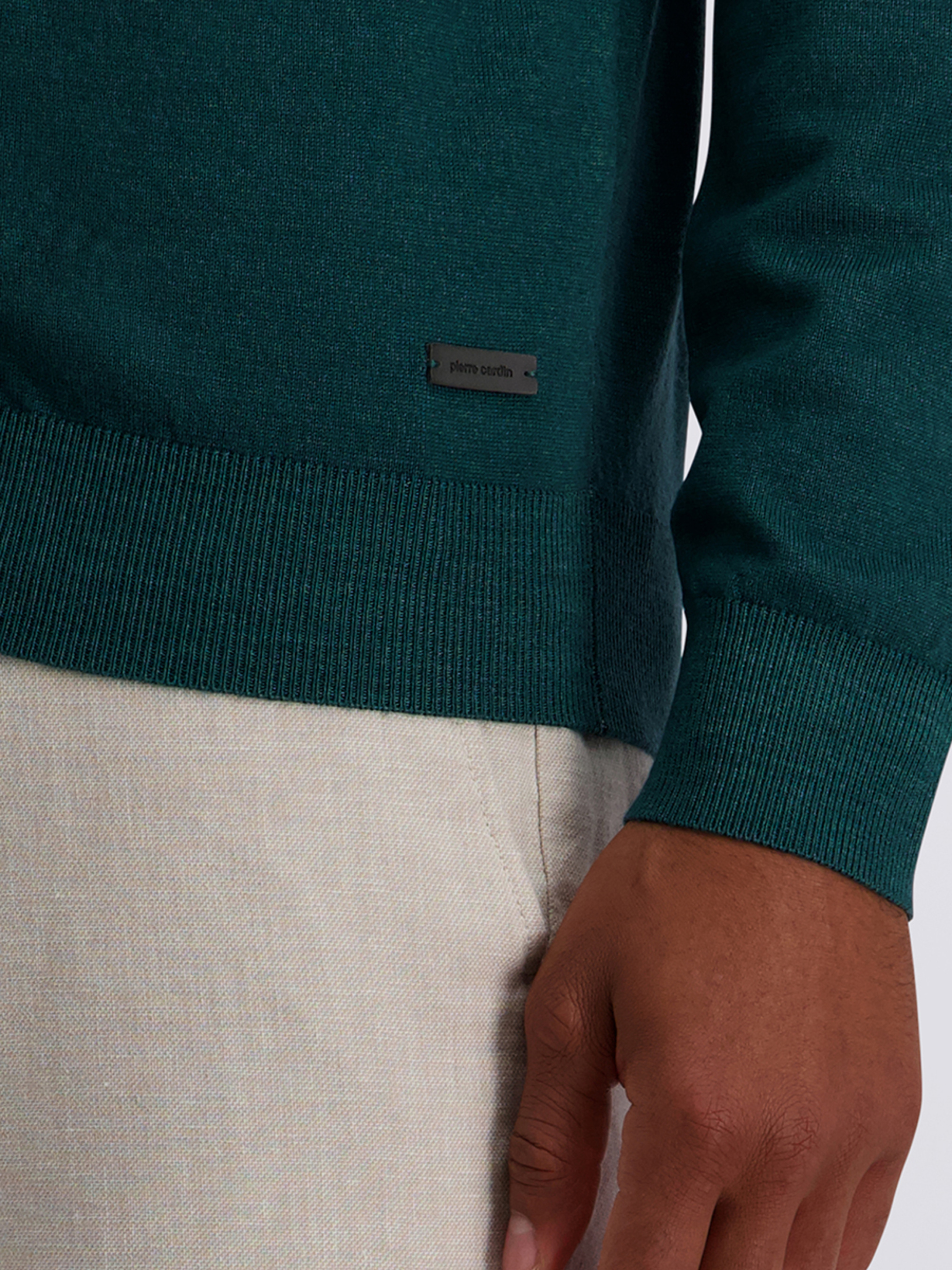 Стильний чоловічий кардиган Pierre Cardin насиченого смарагдового відтінку — чудовий вибір для прохолодної погоди й повсякденних образів. Виготовлений з якісної м’якої вовняної тканини, яка забезпечує тепло, комфорт і привабливий зовнішній вигляд. Модель має зручну блискавку-застібку, V-подібний виріз горловини та стійку-комір, що робить її універсальною й стильною. Практичні дві зовнішні бічні кишені ідеально підходять для дрібниць або зігрівання рук. Універсальний смарагдовий колір легко поєднується з брюками, джинсами та сорочками, додаючи яскравий акцент у чоловічий гардероб. Рекомендований догляд: делікатне прання, не відбілювати, не сушити в сушильній машині.