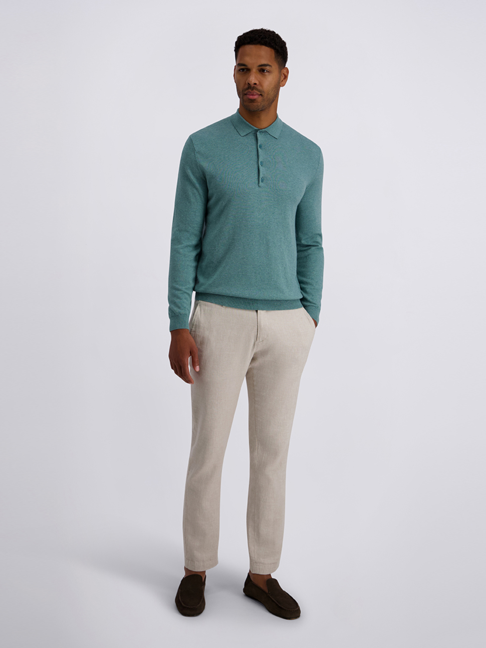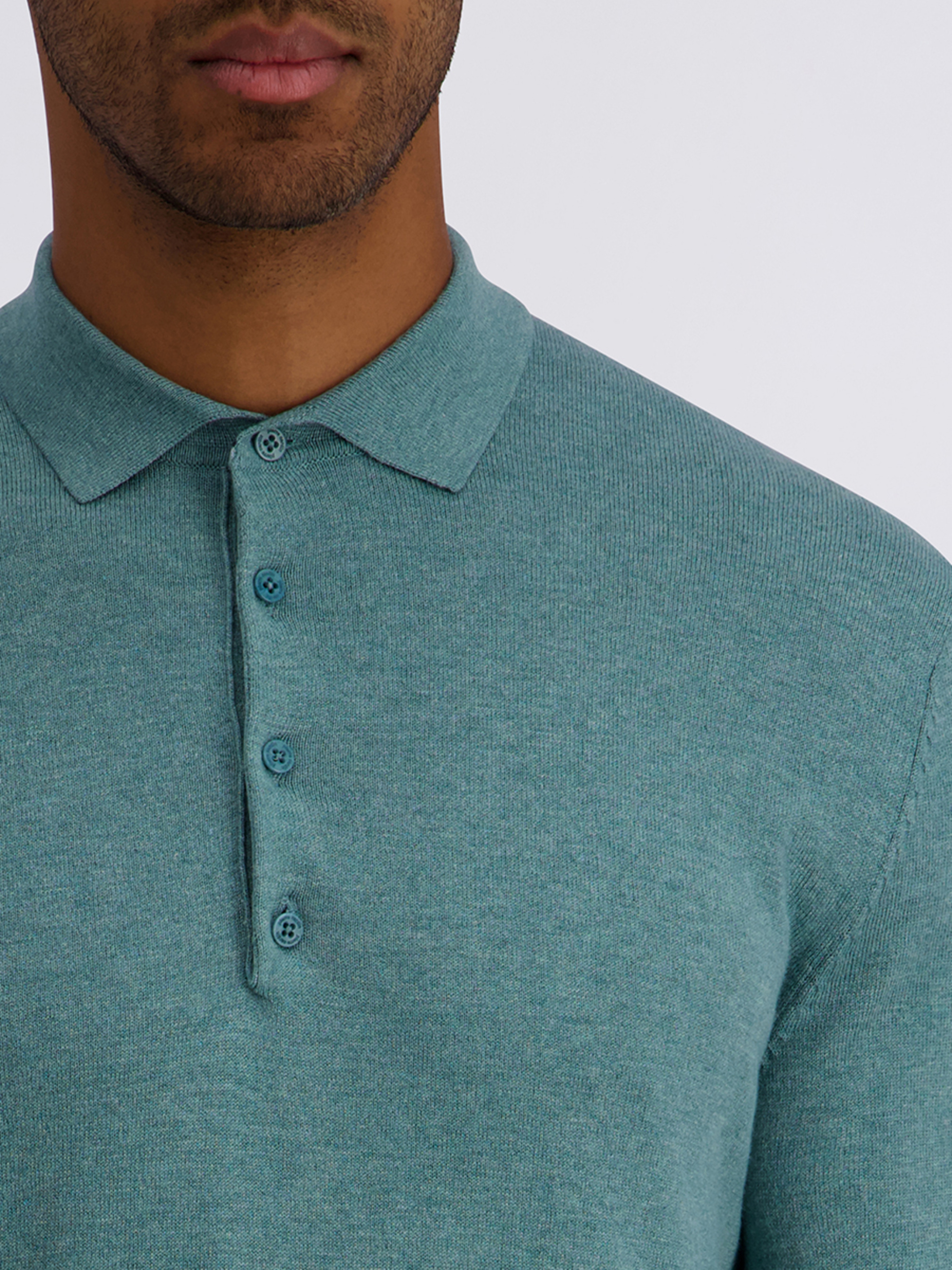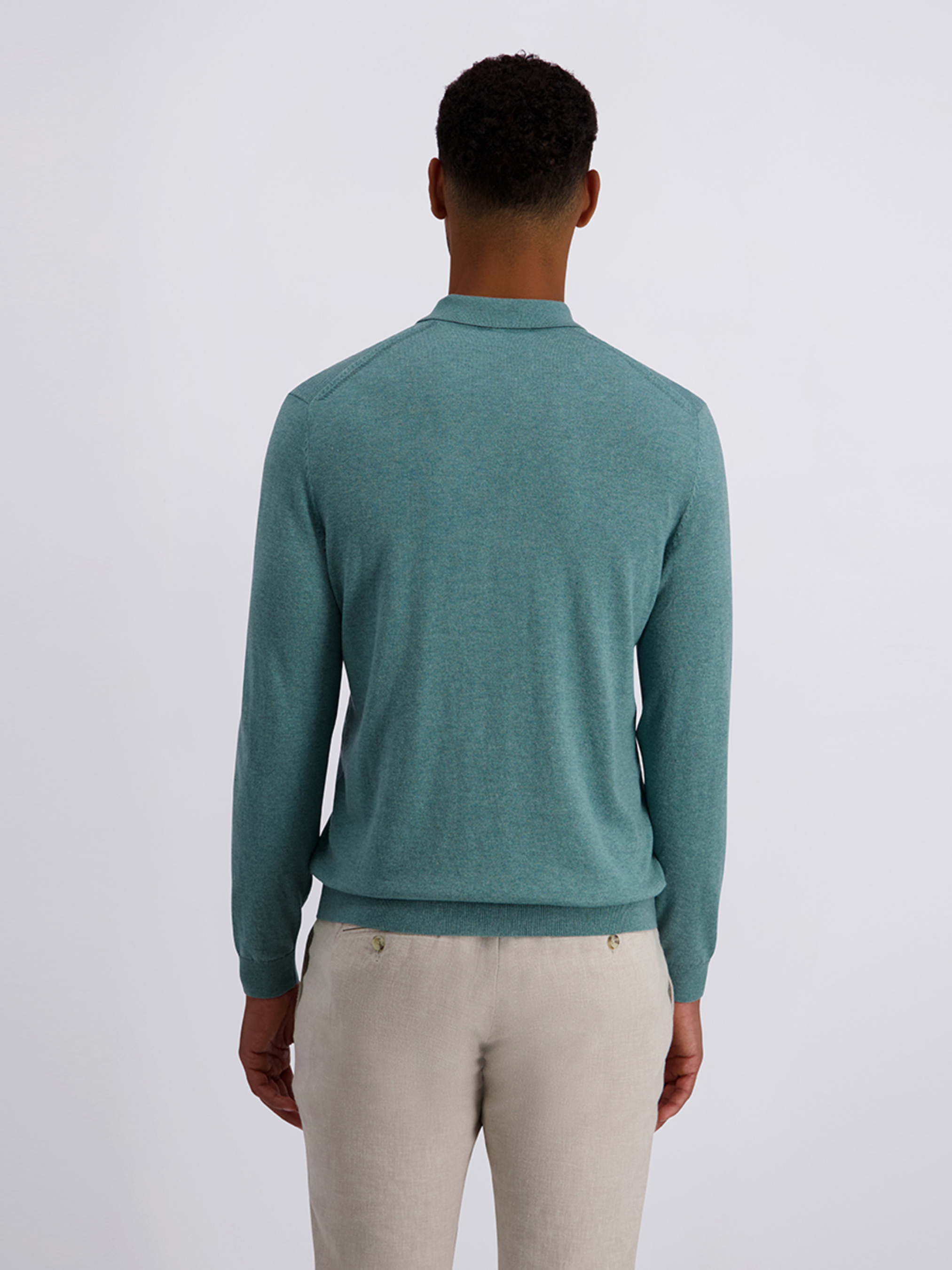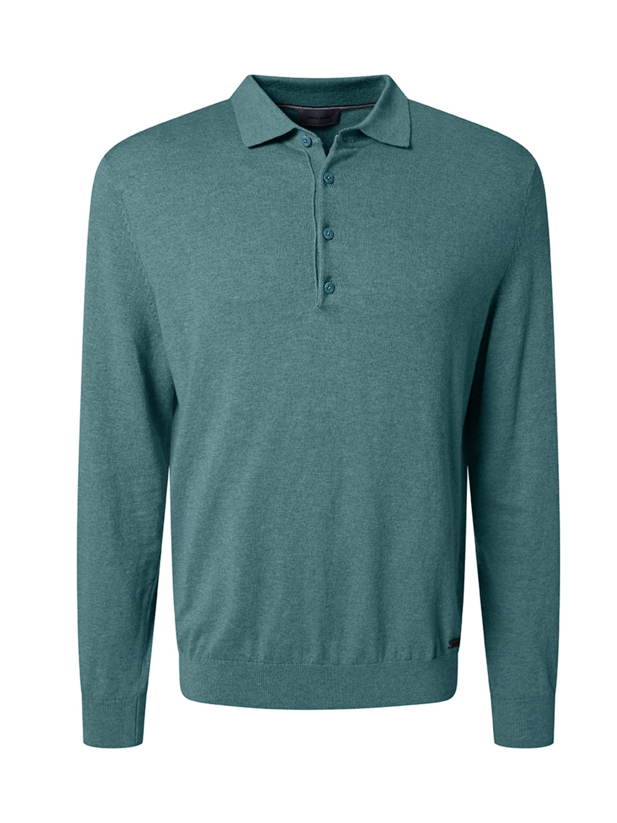 Поло з довгим рукавом Pierre Cardin у свіжому м’ятному кольорі — стильна та універсальна модель для повсякденного й smart-casual гардероба. Виріб виконаний у напівприталеному крої, що акуратно підкреслює силует і забезпечує комфорт під час носіння. Модель доповнена відкладним коміром і планкою на 4 ґудзики, що надає образу класичної елегантності. Манжети на рукавах та по низу виробу забезпечують охайну посадку й збереження форми. Поло виготовлене з якісної сумішевої тканини: 49% хлопок, 25% віскоза, 16% поліамід, 10% вовна, яка поєднує м’якість, повітропроникність, зносостійкість і легке тепло. Модель чудово поєднується з брюками, джинсами та чиносами, додаючи образу свіжий колірний акцент.