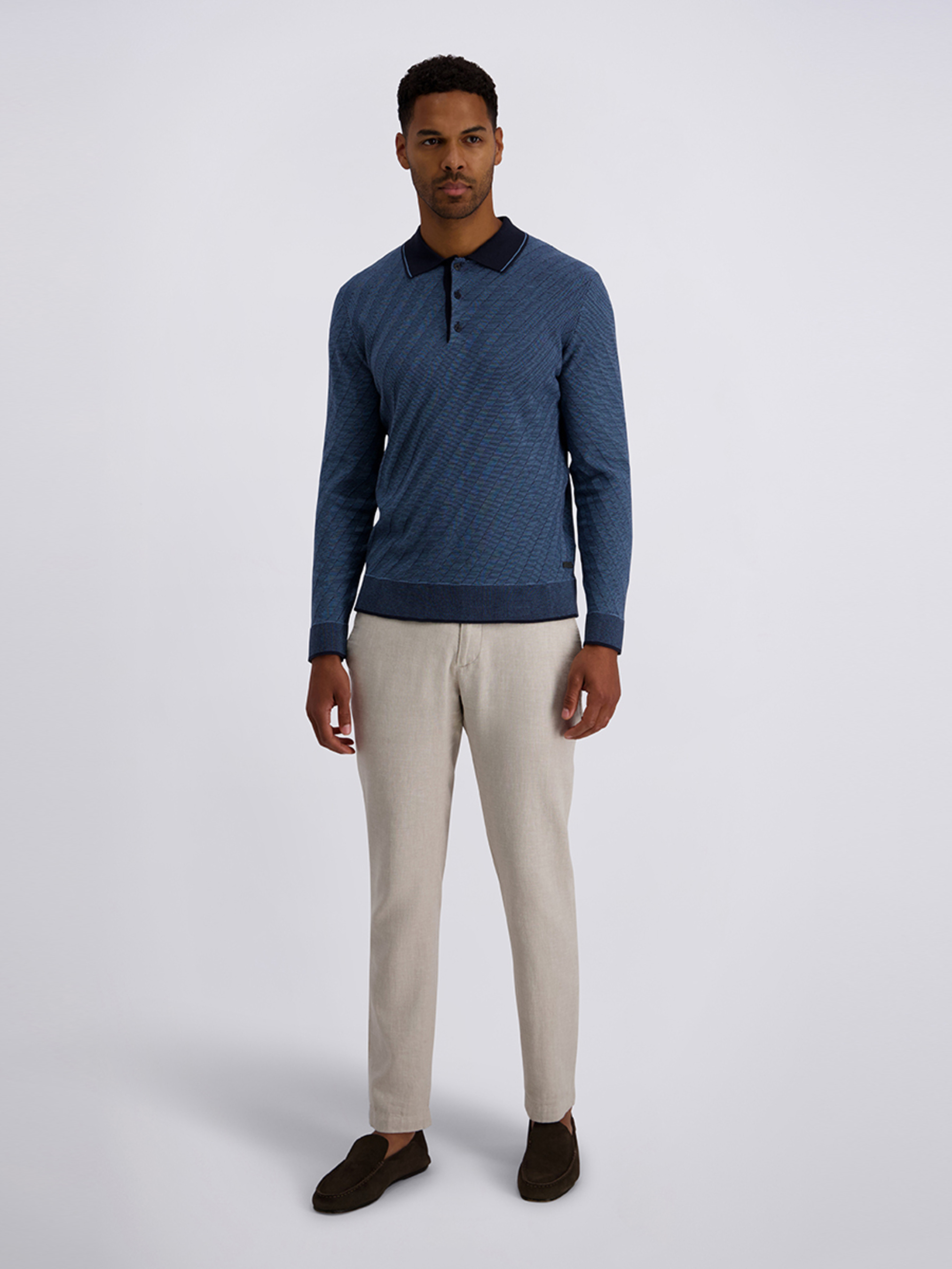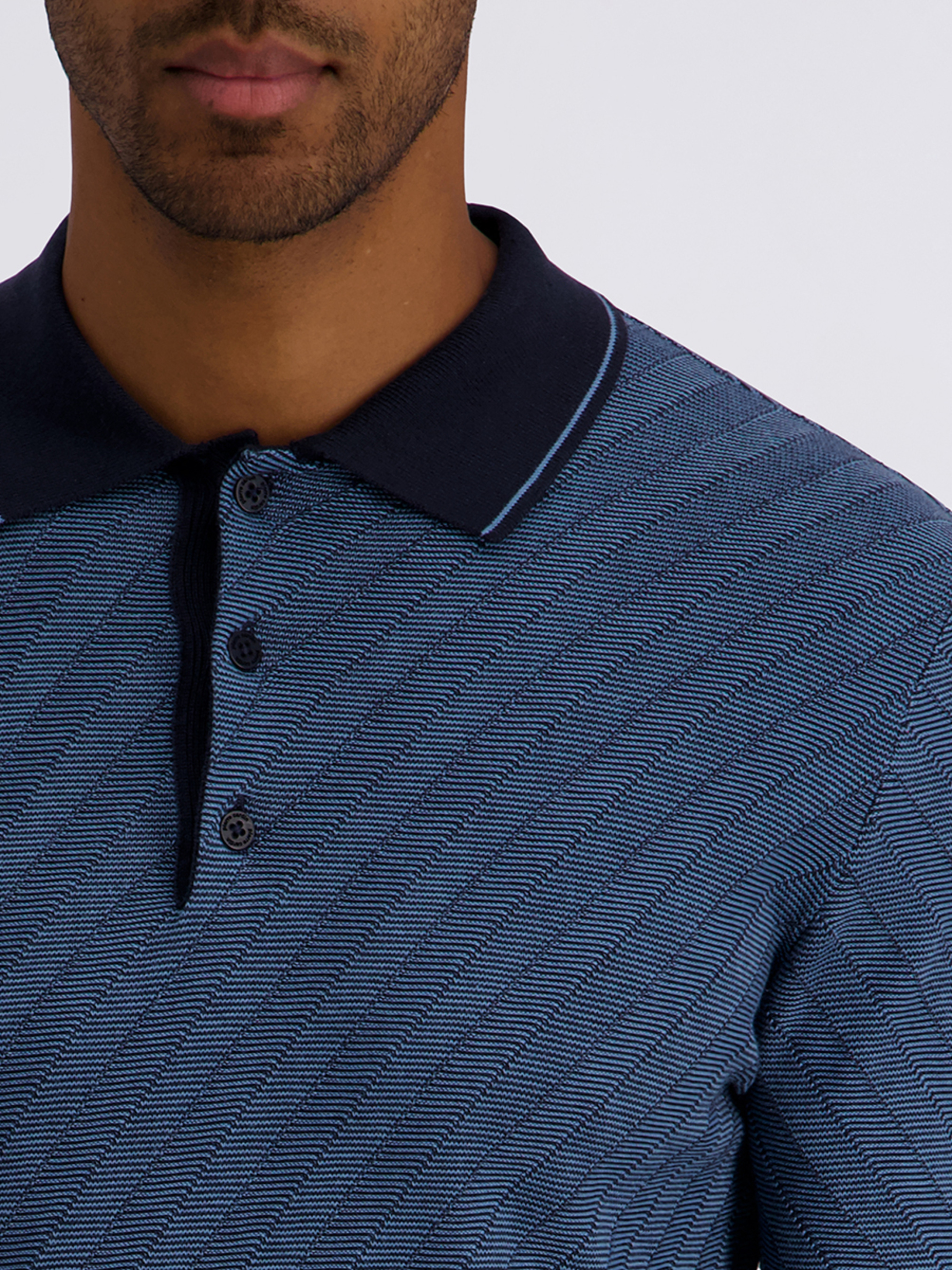 Поло на довгий рукав бренду Pierre Cardin із 100% бавовни – гармонійне поєднання стилю та комфорту. Напівприталений фасон м’яко підкреслює силует, а основний синій колір світлішого відтінку в текстуровану смужку надає виробу свіжості та елегантності. Манжети на рукавах та відкладний комір виконані в темно-синьому відтінку, створюючи вишуканий контраст і акцент на деталях. Низ виробу також оздоблений акуратною обробкою, що підкреслює якість та продуманість дизайну. Ідеальний варіант для стильного повсякденного образу, поєднуючи комфорт натуральної бавовни та витончений стиль Pierre Cardin.