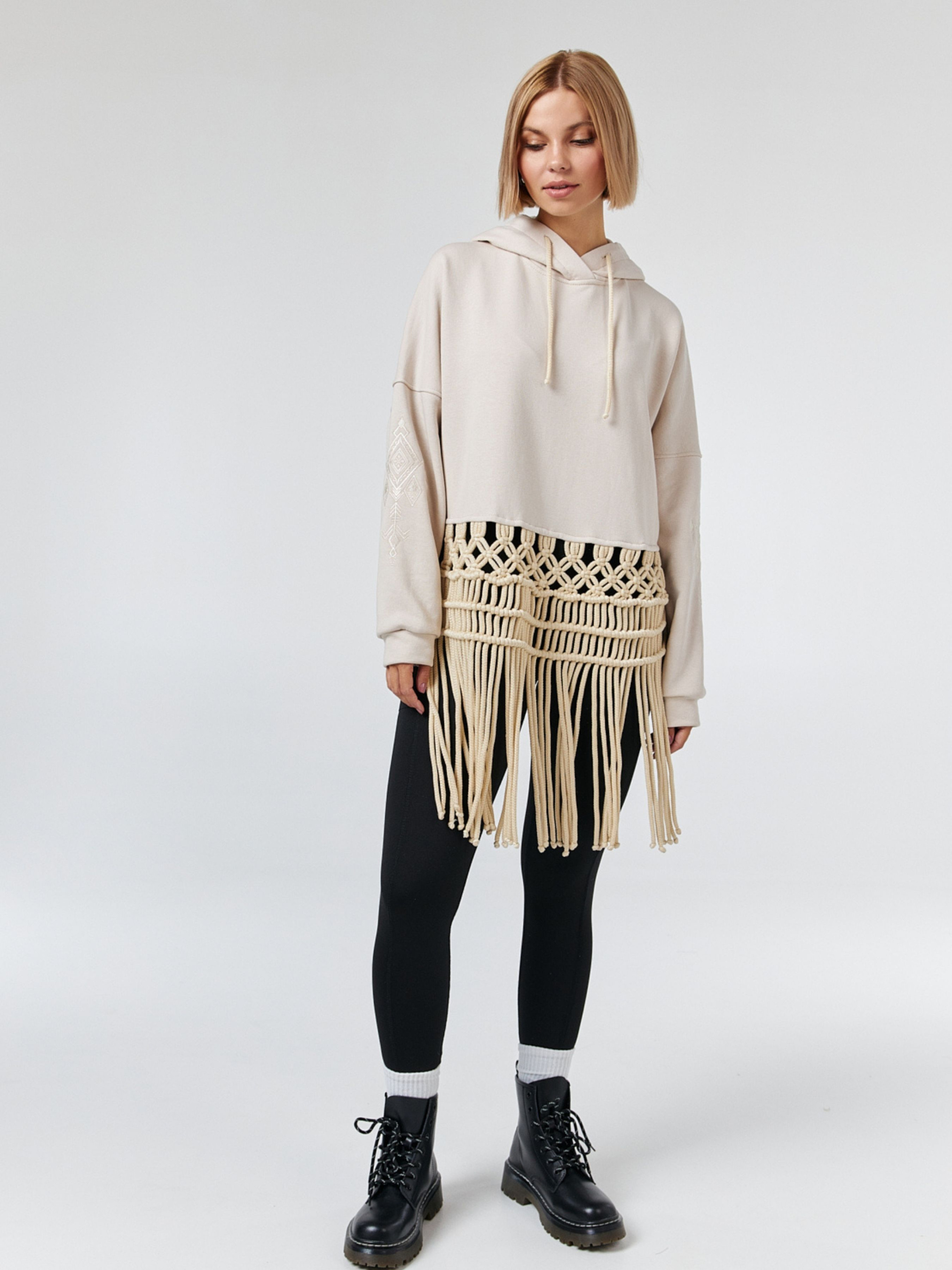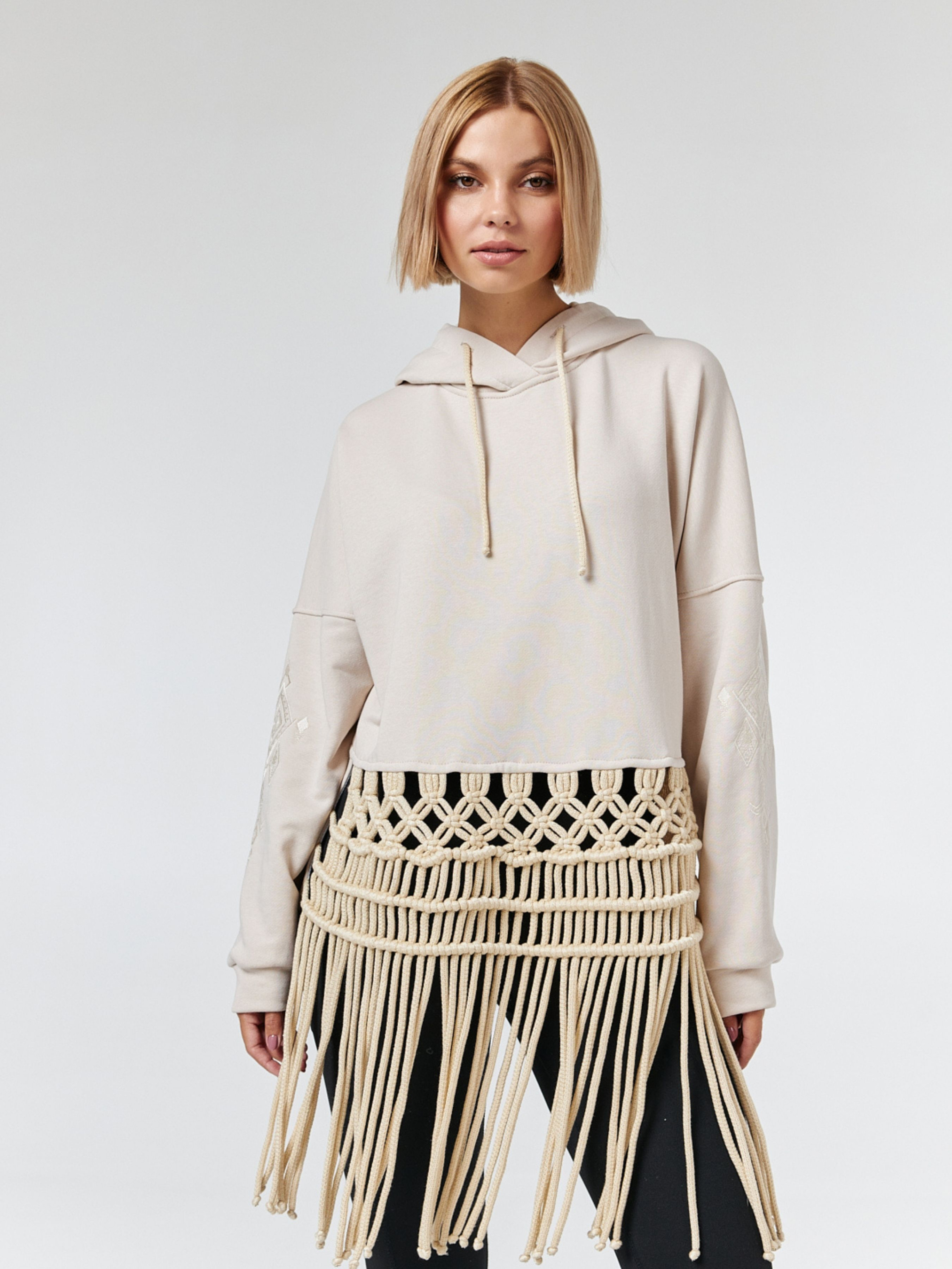 Стильний худі з декором ручної роботи. Бавовняна пряжа повторює візерунки з магічних оберігів та бахрома, що подовжує силует та додає динамічності образу. Рукави виробу прикрашені монохромною вишивкою в тон основної тканини. Силует худі не сковує рухів, капюшон додатково оздоблено сіткою. Натуральна бавовняна тканина.
