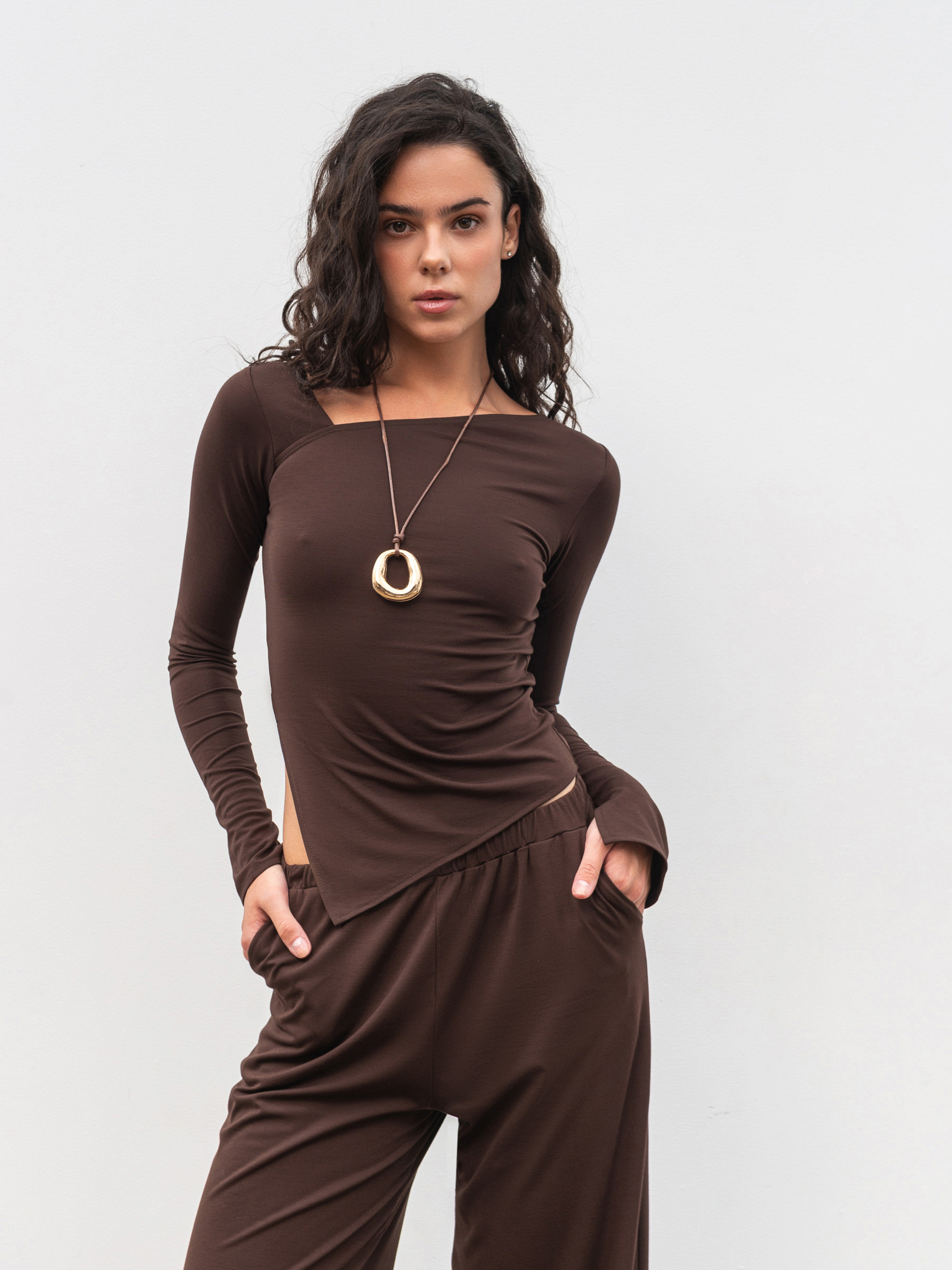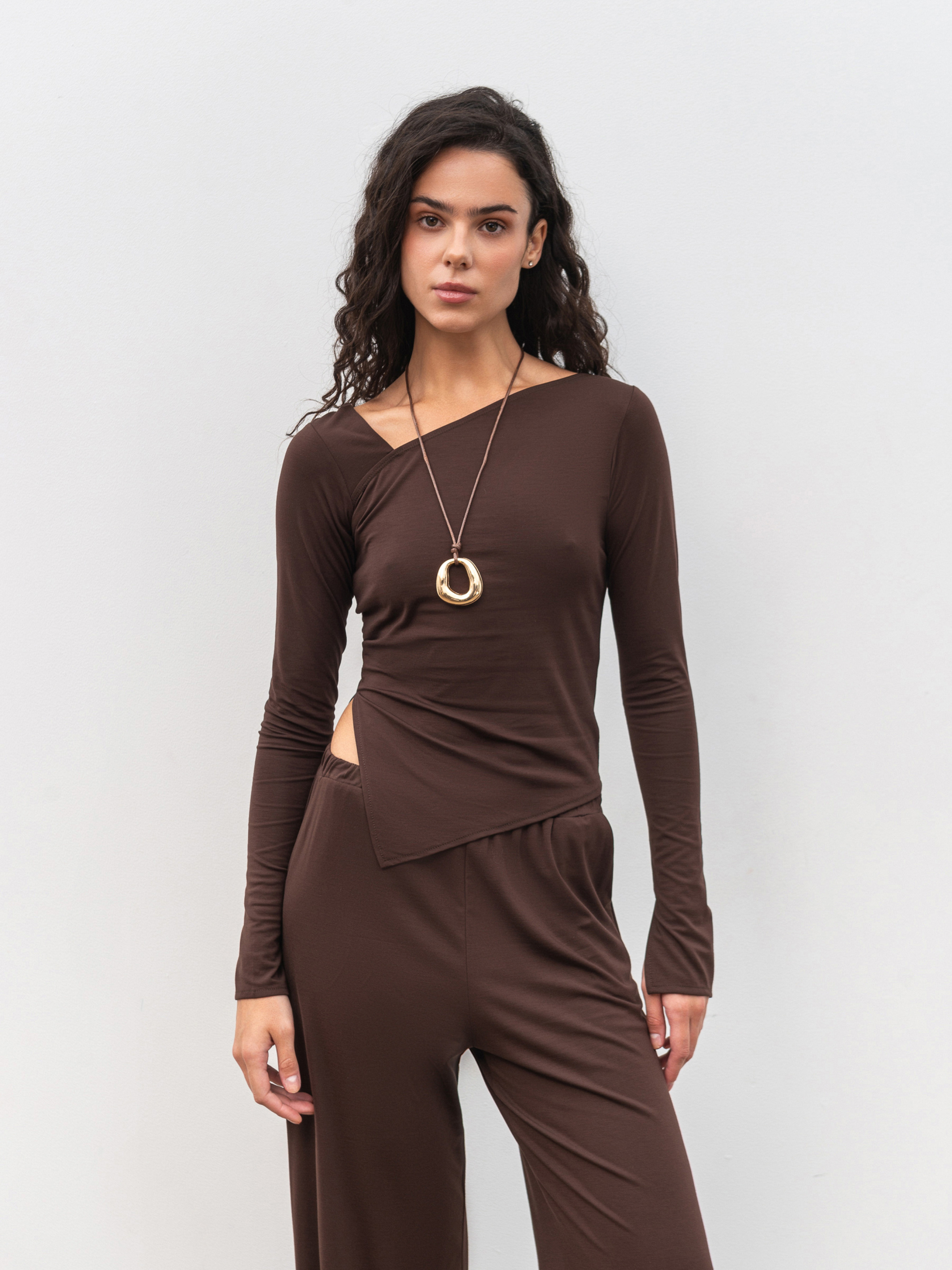 Базовий лонг прилеглого силуету з асиметричним краєм. Модель має розрізи по низу рукавів. Асиметрична горловина додасть цікавості образам. Виготовлена з приємного на дотик трикотажу, що добре тягнеться. Базовий лонг можна вдало поєднувати зі складнішими елементами, наприклад брюки-палацоо, джинси різних фасонів чи спідниця з фактурної тканини. XS|S Довжина по спині : 48 см, довжина рукава : 63 см, напівобхват грудей : 37 см Плечі : 31 см, напівобхват талії : 34 см. S|M Довжина по спині : 48 см, довжина рукава : 63 см, напівобхват грудей : 38 см, плечі: 33 см, напівобхват талії : 36 см. M|L Довжина по спині : 51 см, довжина рукава : 63 см, напівобхват грудей : 40 см, плечі : 34 см, напівобхват талії : 38 см