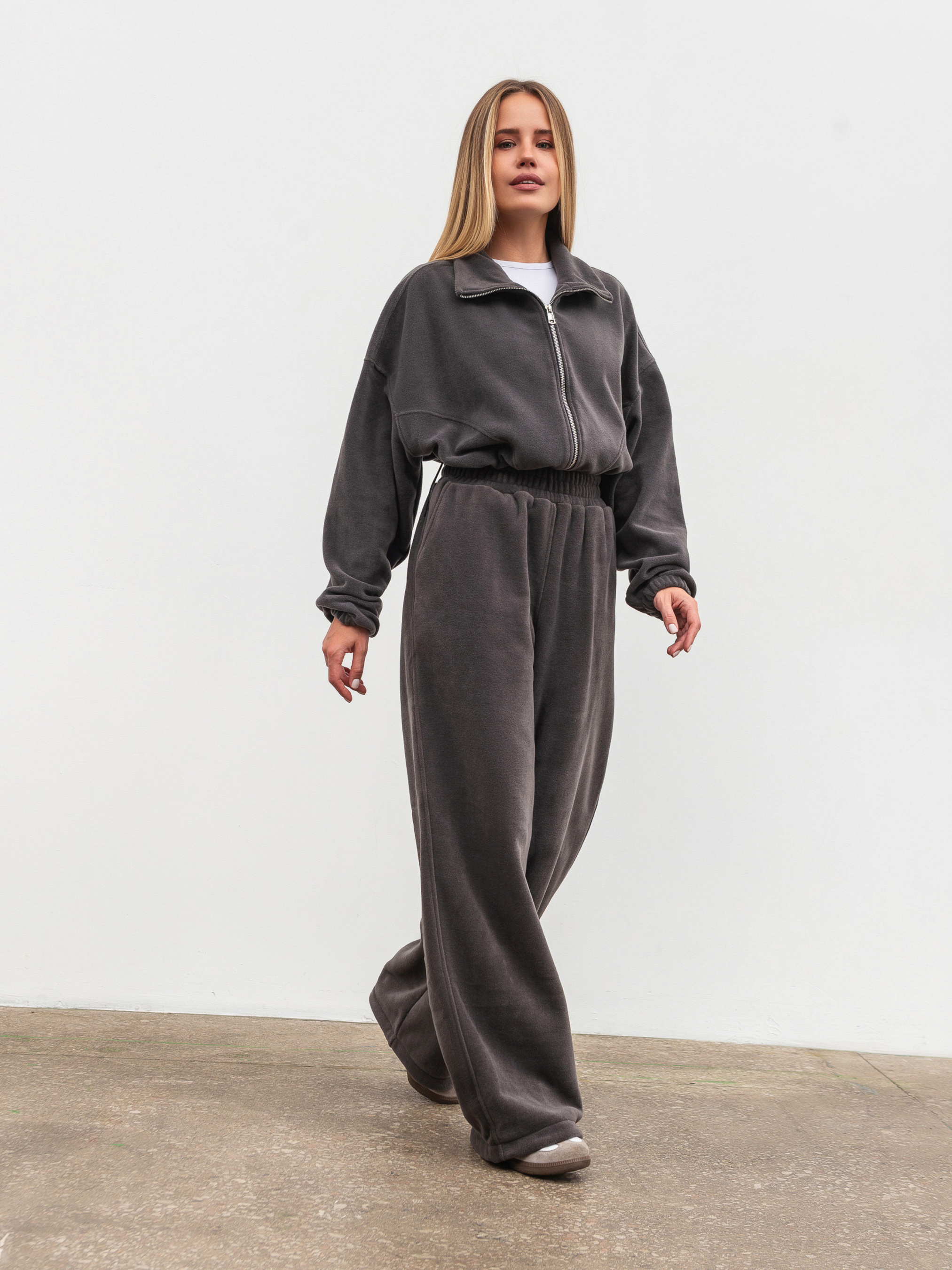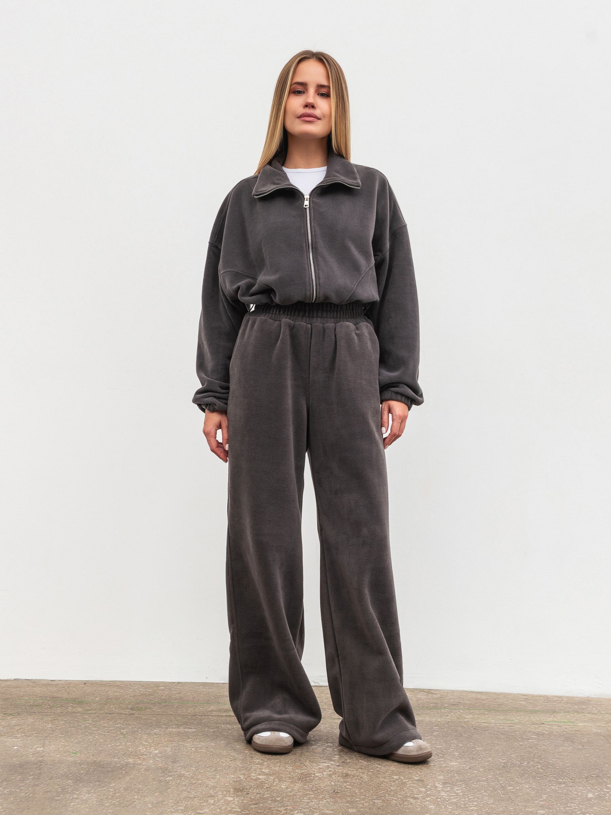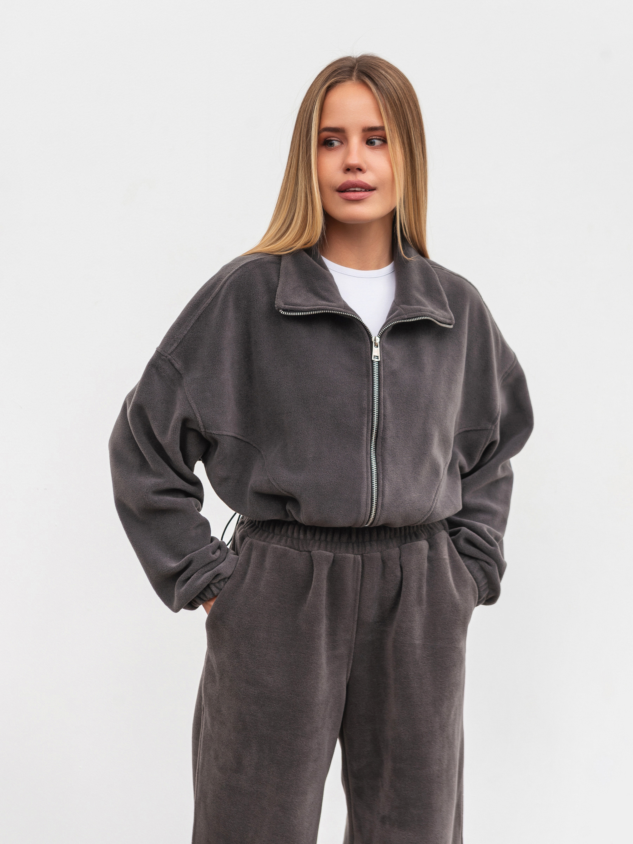 Затишний бомбер із м якого флісу тепла й стильна база для холодного сезону. Модель у вільному oversize-фасоні має спущене плече та регулюється кулісками знизу з обох боків, що дозволяє змінювати силует. Вкорочений крій робить бомбер універсальним у поєднанні з джинсами, легінсами чи спортивними штанами. Ідеально комбінується з джогерами з комплекту. Доступні кольори: коричневий, сірий, беж. XS-S Довжина по спині : 40 см Довжина рукава : 50 см Напівобхват грудей : 58 см Плечі : 62 см Напівобхват талії : 56 см S-M Довжина по спині : 40 см Довжина рукава : 50 см Напівобхват грудей : 60 см Плечі : 63 см Напівобхват талії : 57 см M-L Довжина по спині : 40 см Довжина рукава : 50 см Напівобхват грудей : 60 см Плечі : 65 см Напівобхват талії : 58 см