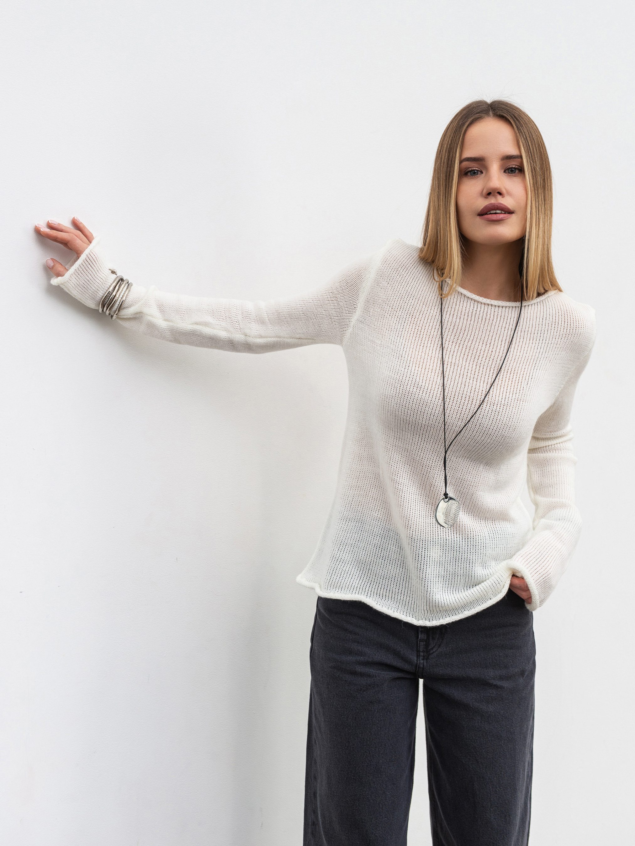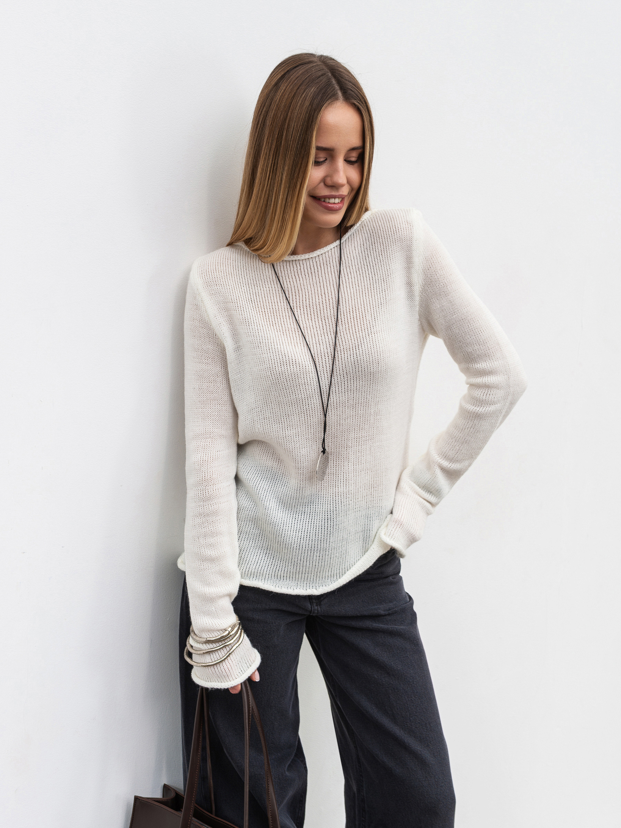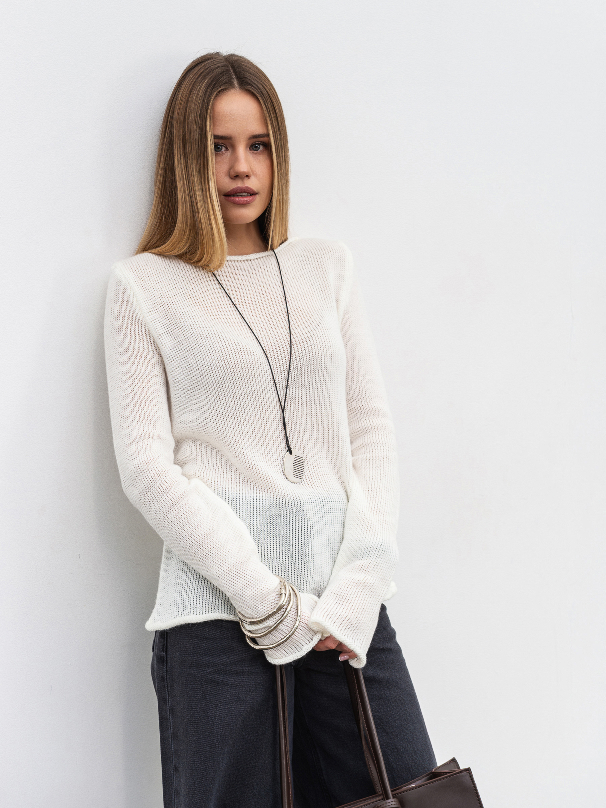 Легкий лонг із тонкої напівпрозорої в'язки - універсальний елемент базового гардероба. М який матеріал (60% акрил, 20% вовна, 20% поліамід) приємний до тіла, дихає та створює невагоме відчуття комфорту. Модель має виріз лодочкою і тонко оброблені краї манжетів та низу, що забезпечує делікатне завершення ліній без стягування. Ідеально поєднується з брюками, спідницями чи піджаком, створюючи базу для повсякденних образів. Доступні кольори: молочний, чорний. Довжина по спині : 57 см Довжина рукава : 64 см Напівобхват грудей : 42 см Плечі : 36 см Напівобхват талії : 43 см