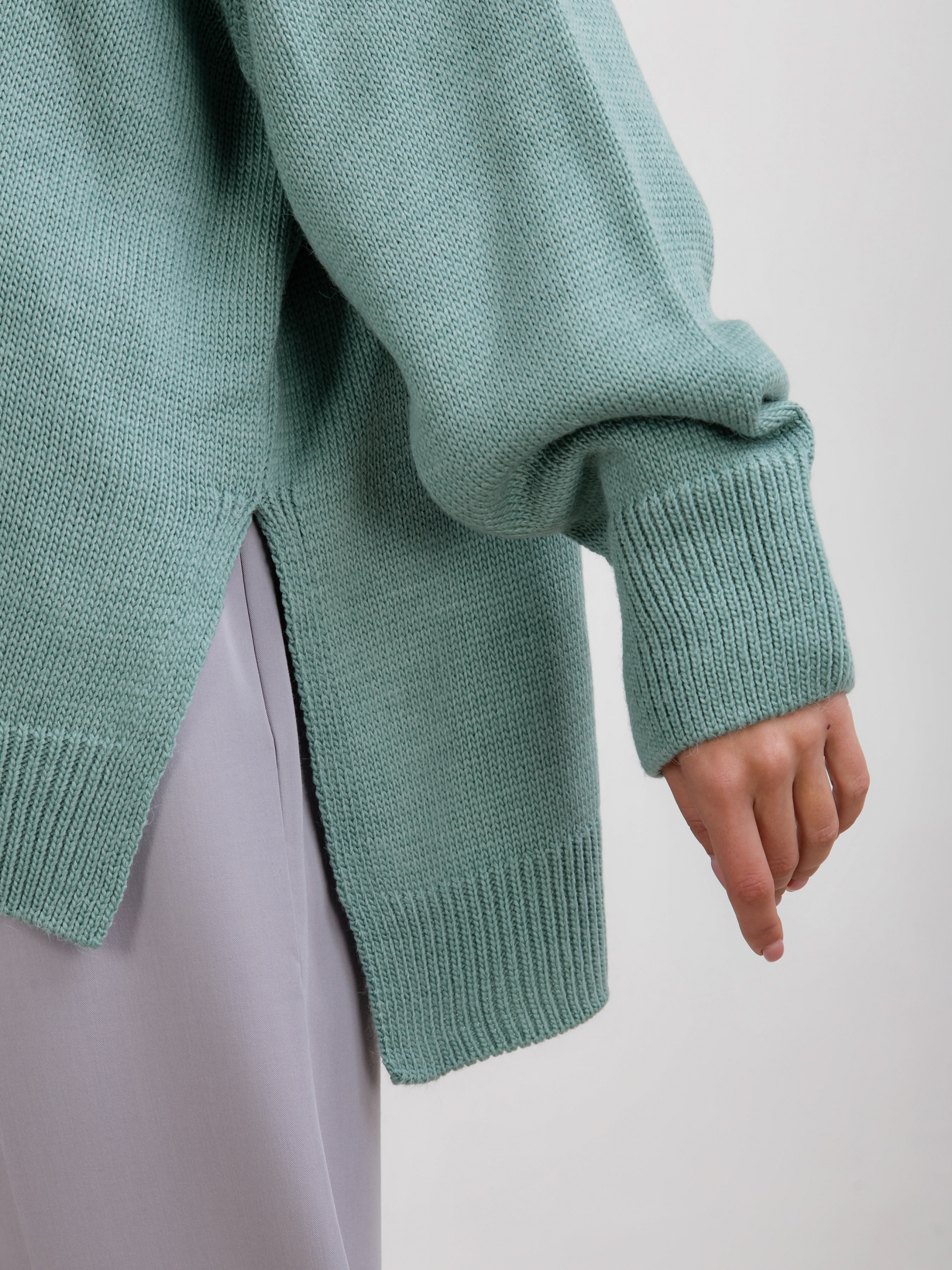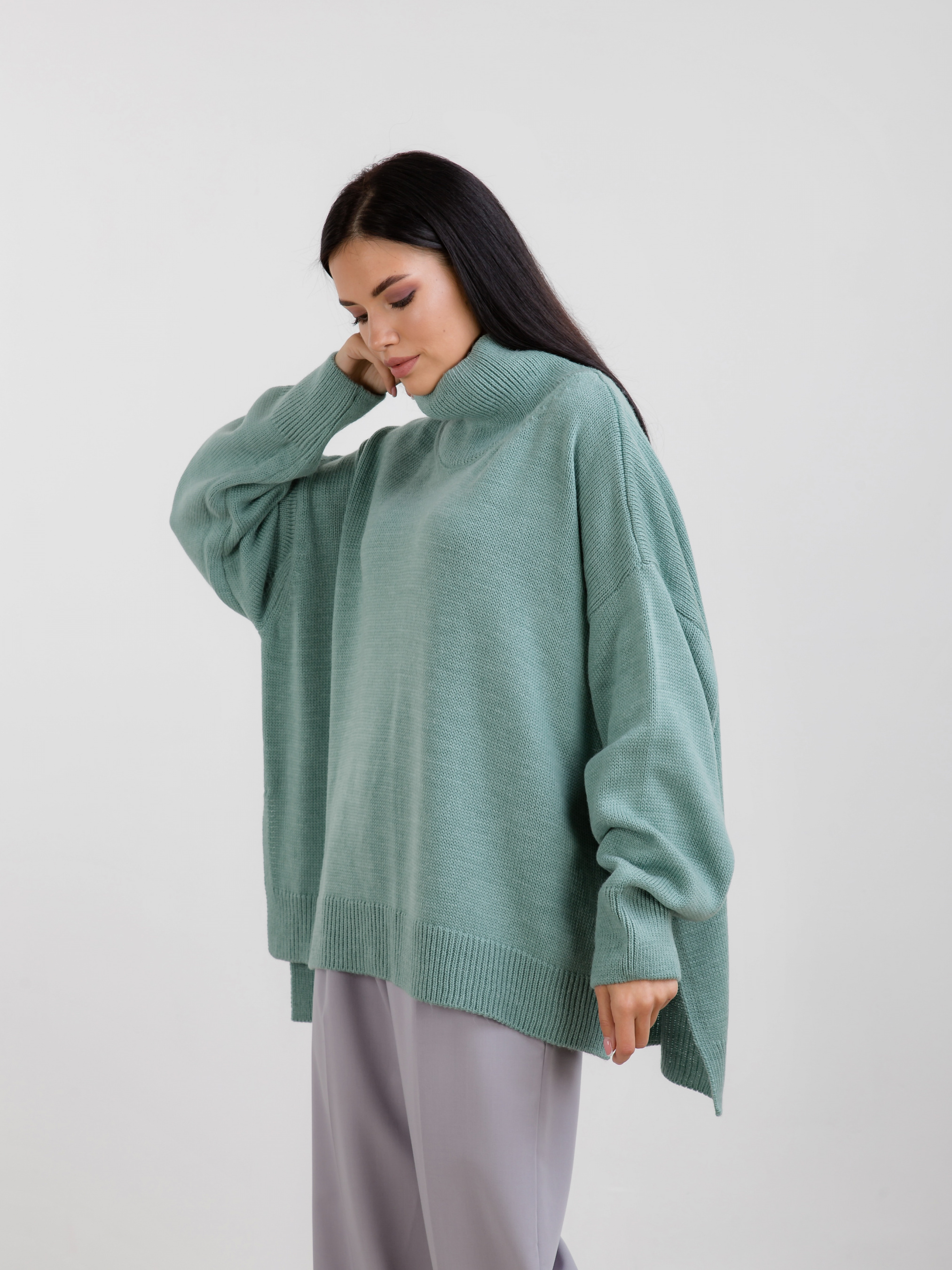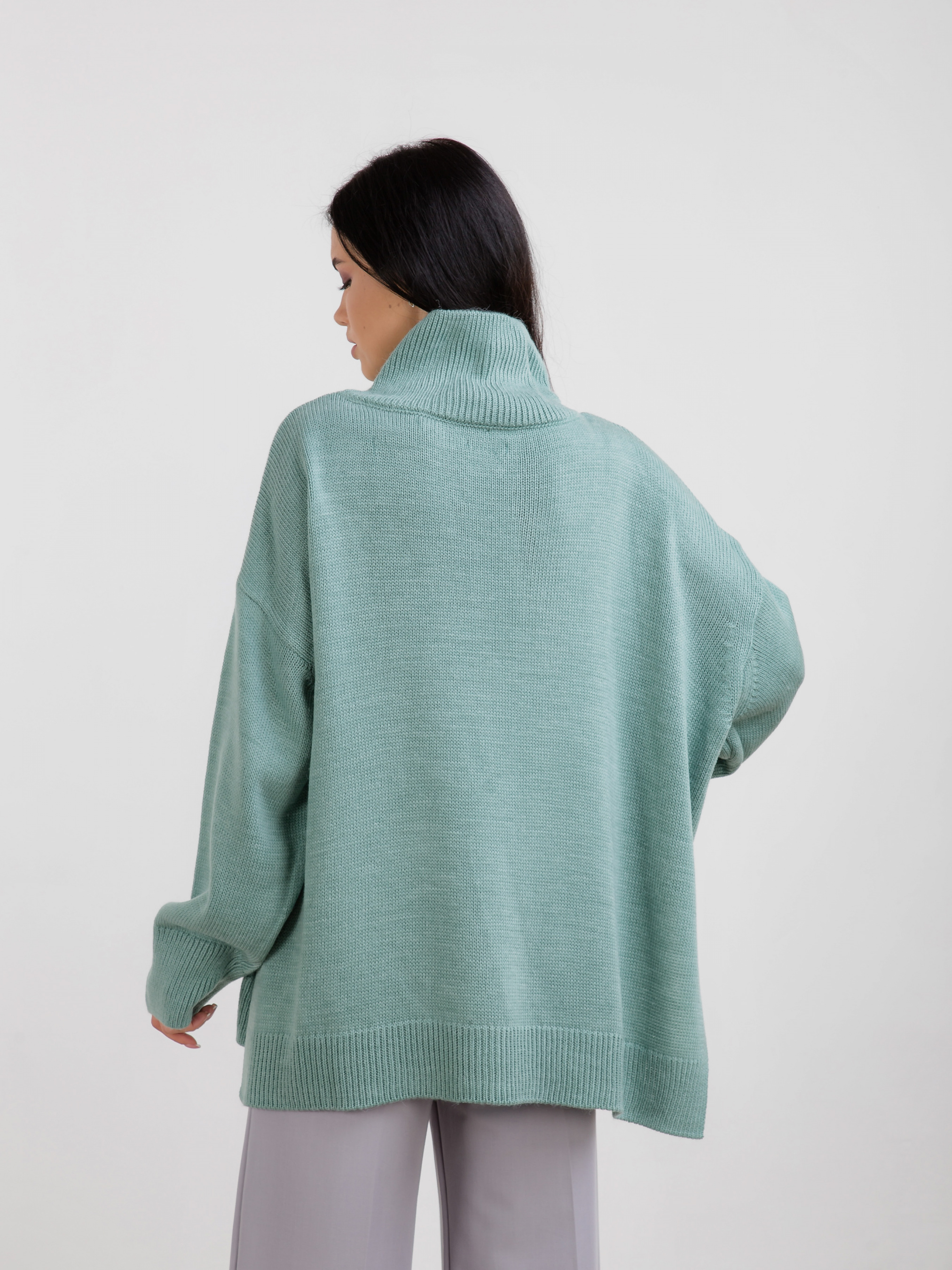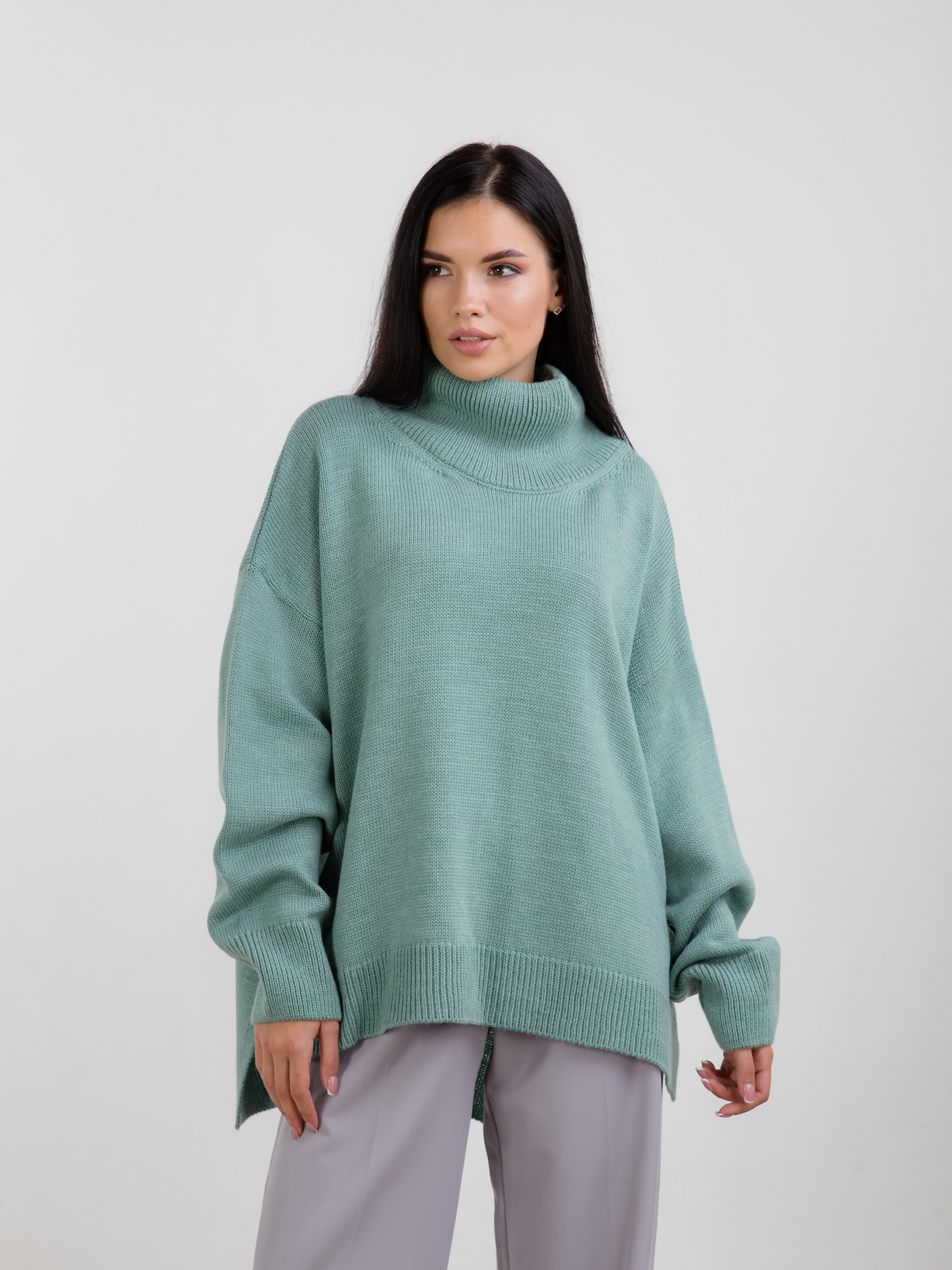 Светр вільного крою з високим горлом. Трендова та тепла модель. Вільний фасон із розрізами з боків. Матеріал приємний до тіла, має у складі шерсть. Светр відмінно підійде під будь-який базовий низ.