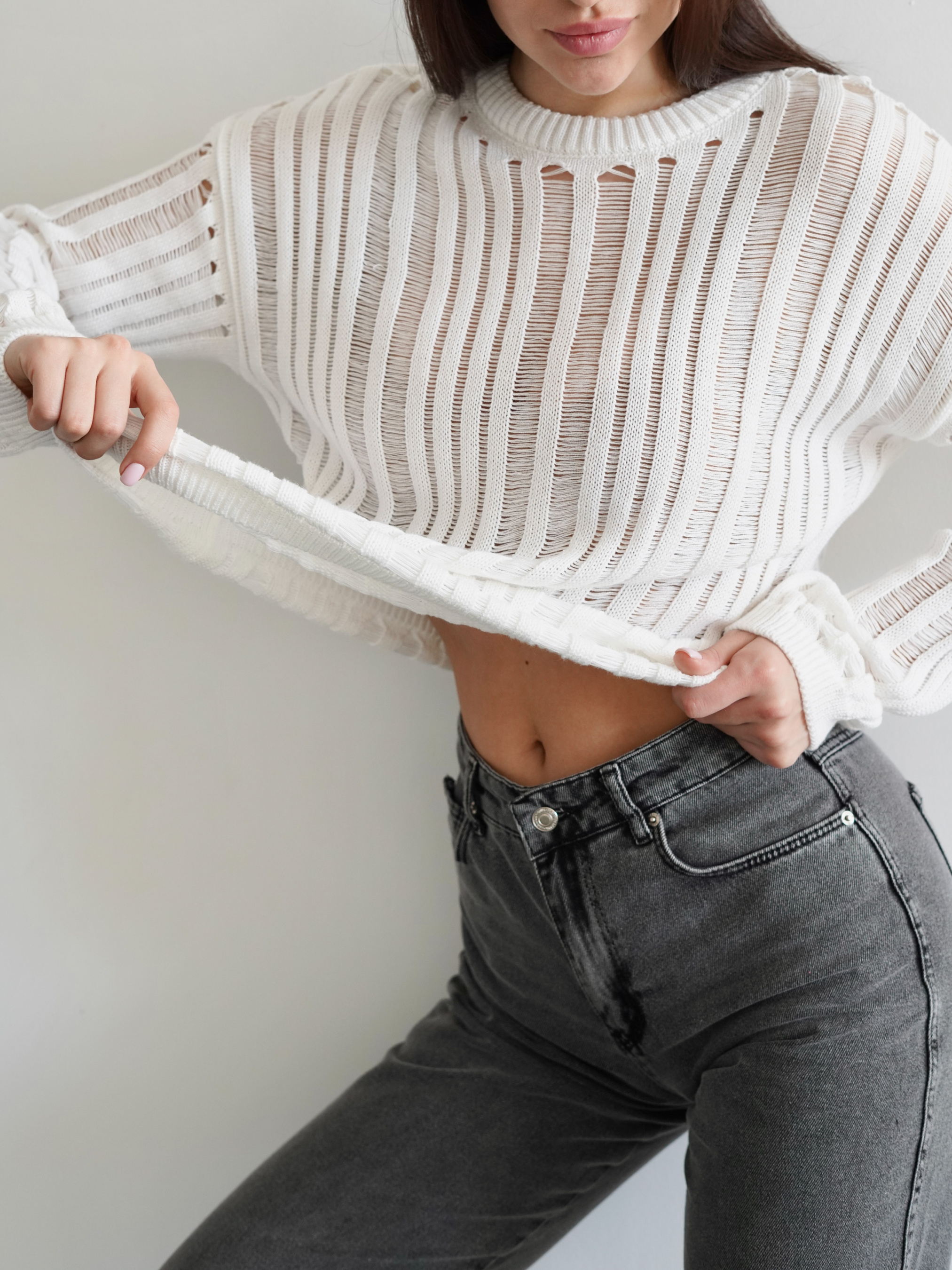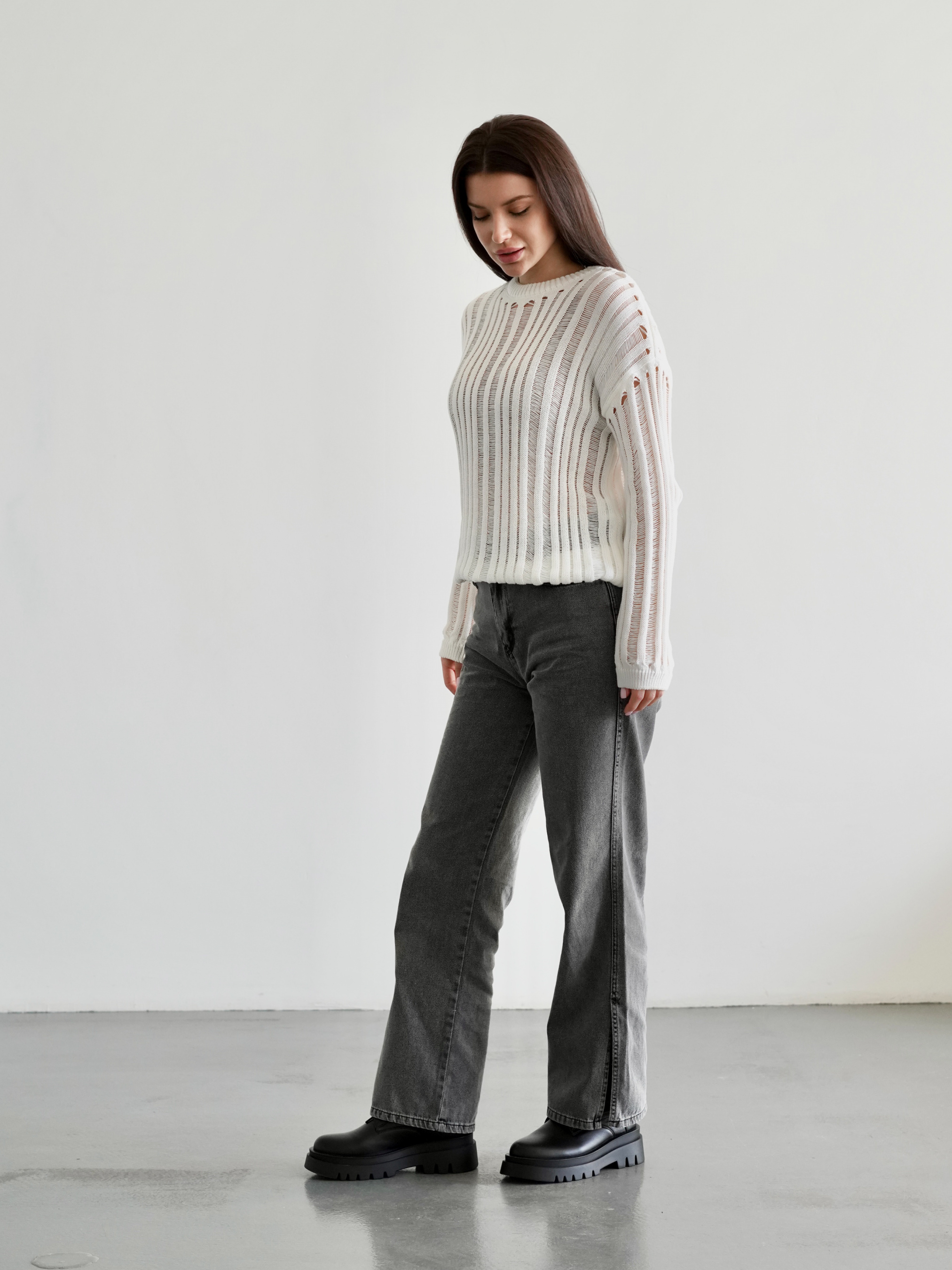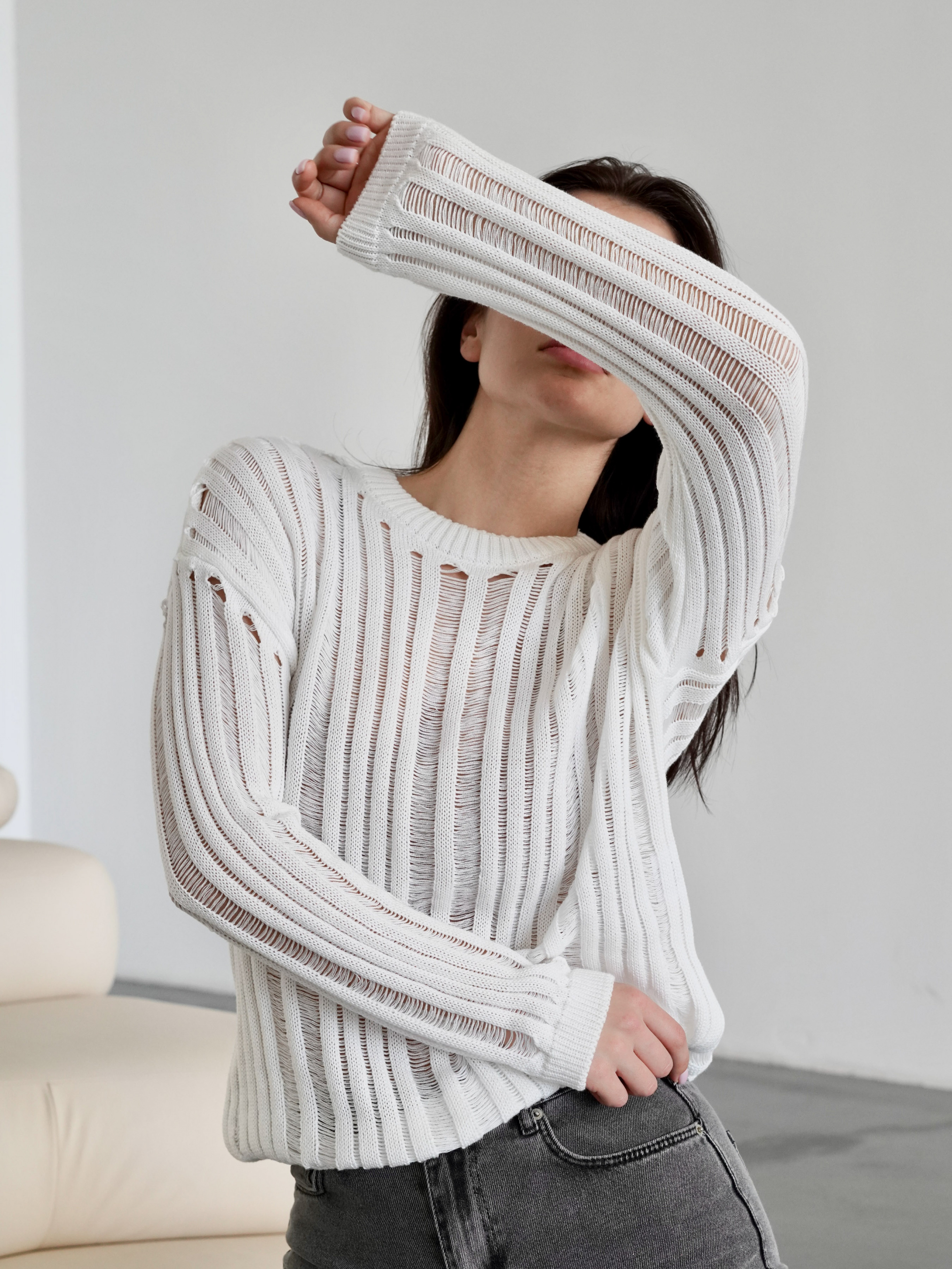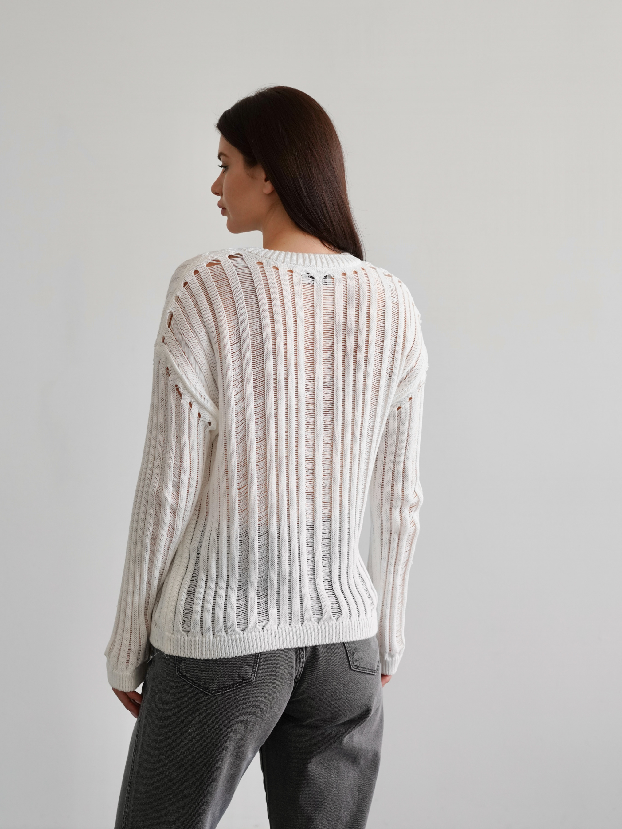 В`язаний джемпер із рваними напівпрозорими елементами. Стане цікавим акцентом у образі завдяки небанальному крою та актуальній напівпрозорій в`язці. М`який та комфортний за рахунок складу тканини - 50% бавовна, 50% акрил. Сідає вільно на свій розмір. Можна носити ранньою весною та пізньою осінню як частину багатошарового образу (наприклад, поєднувати із джинсами Таллін або спідницею Найробі, боді Сумантра абр футболкою Мойта та зверху накинути тренч Авеста чи косуху Твіст ) або як верхній одяг на пізню весну та ранню осінь. XS-S Довжина по спині : 57 см Довжина рукава : 50 см Напівобхват грудей : 51 см Плечі : 60 см M-L Довжина по спині : 57 см Довжина рукава : 50 см Напівобхват грудей : 60 см Плечі : 66 см