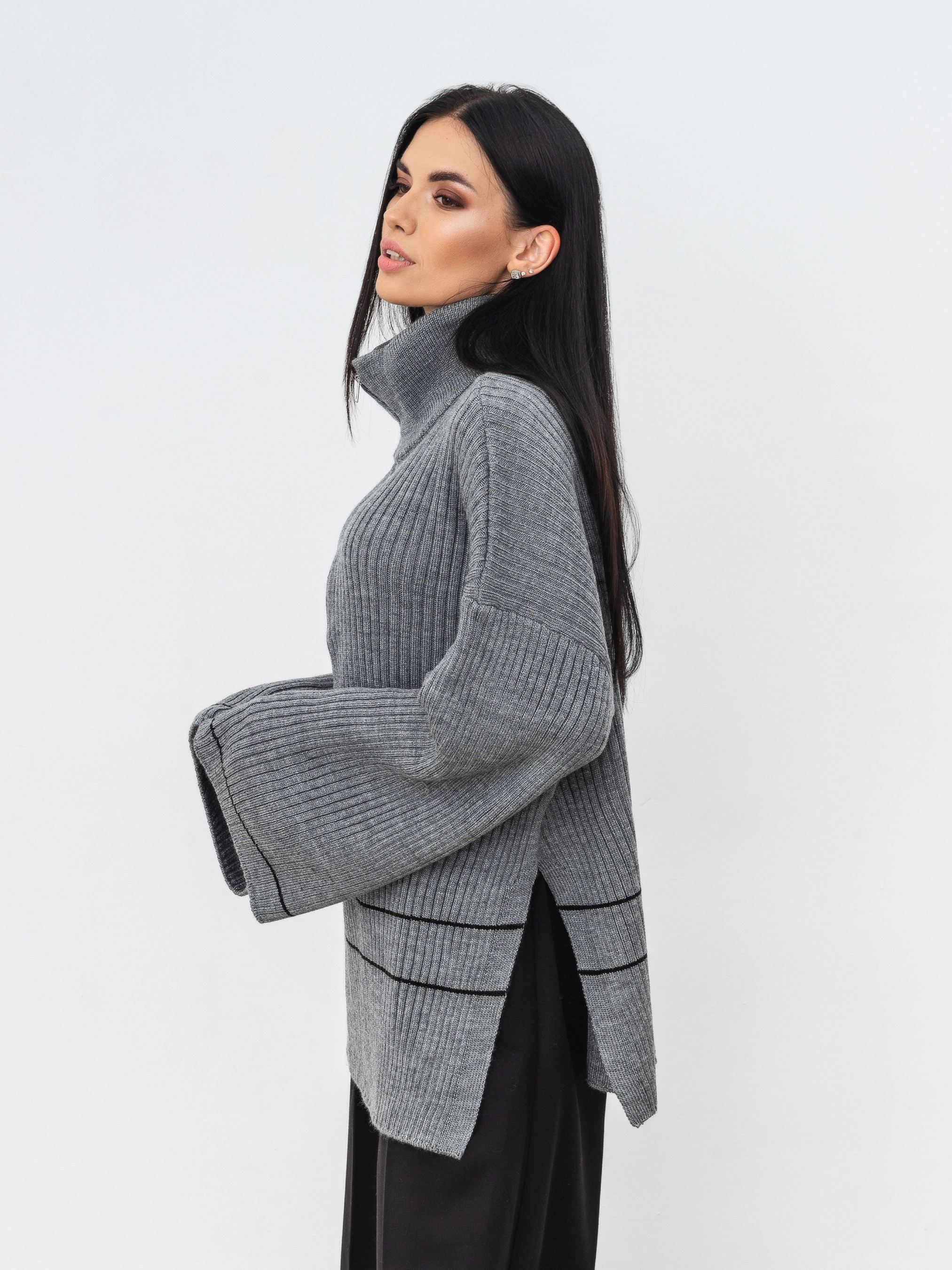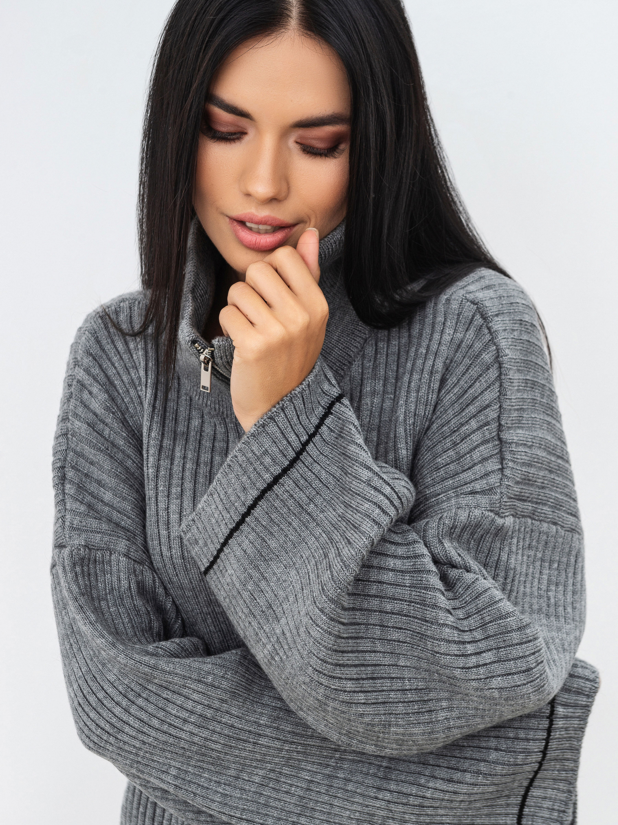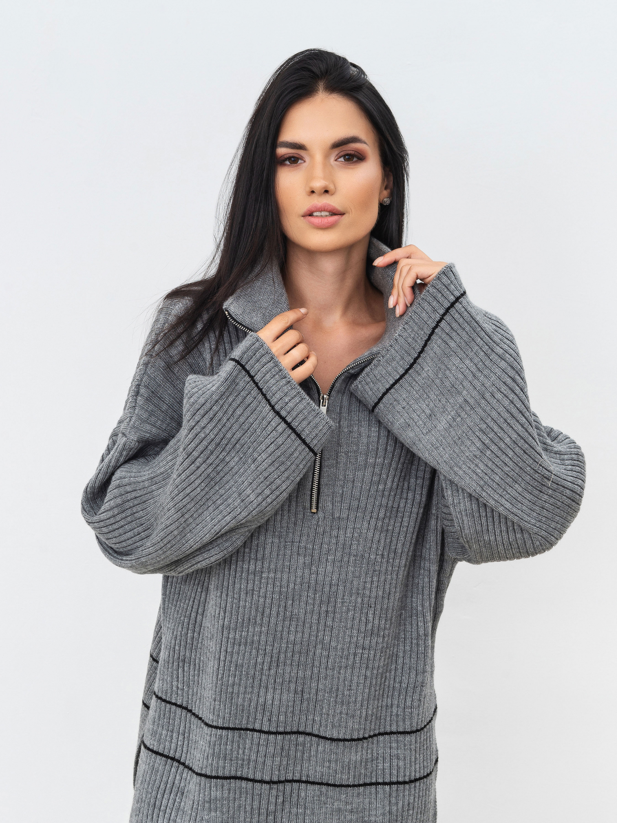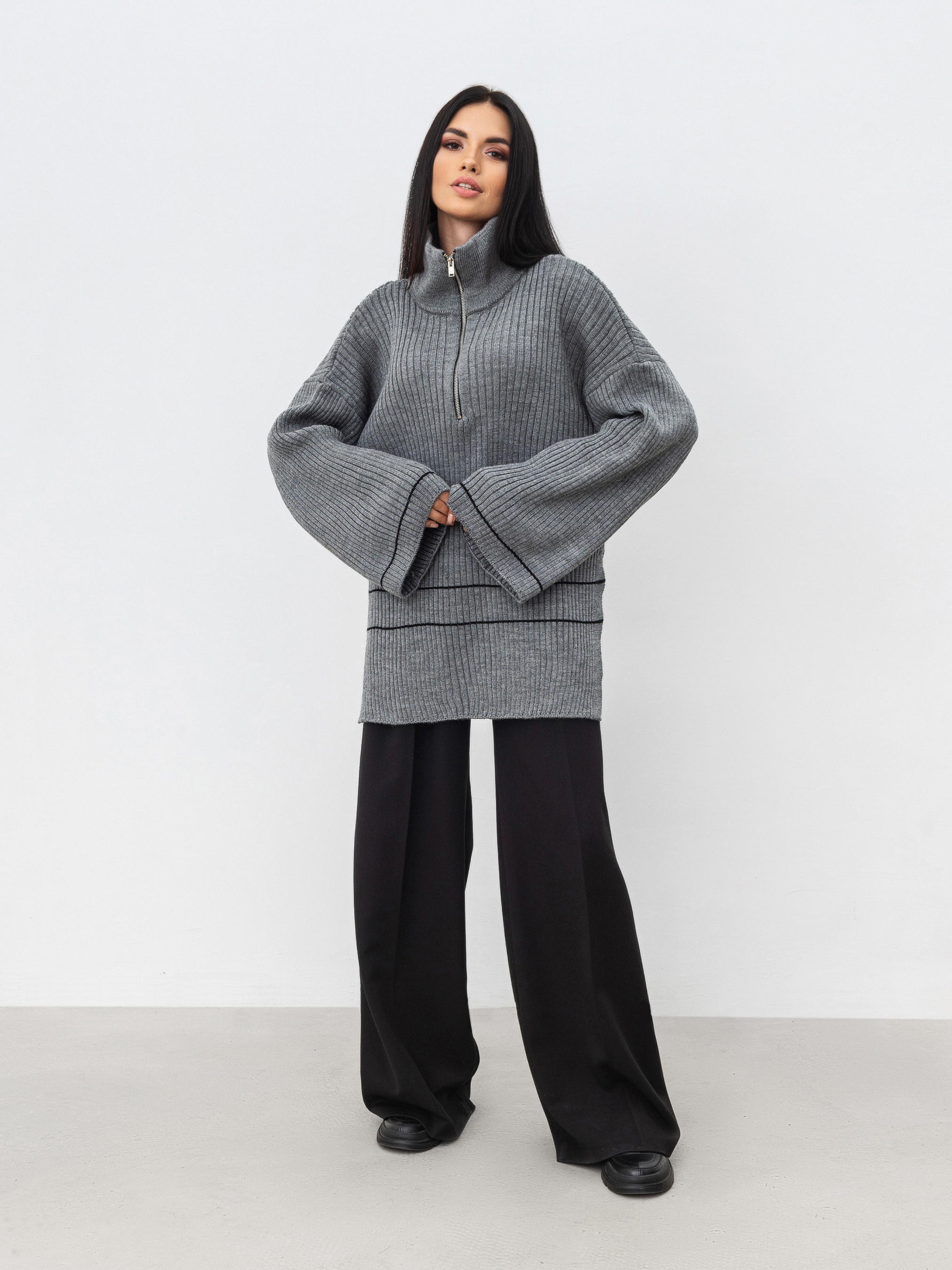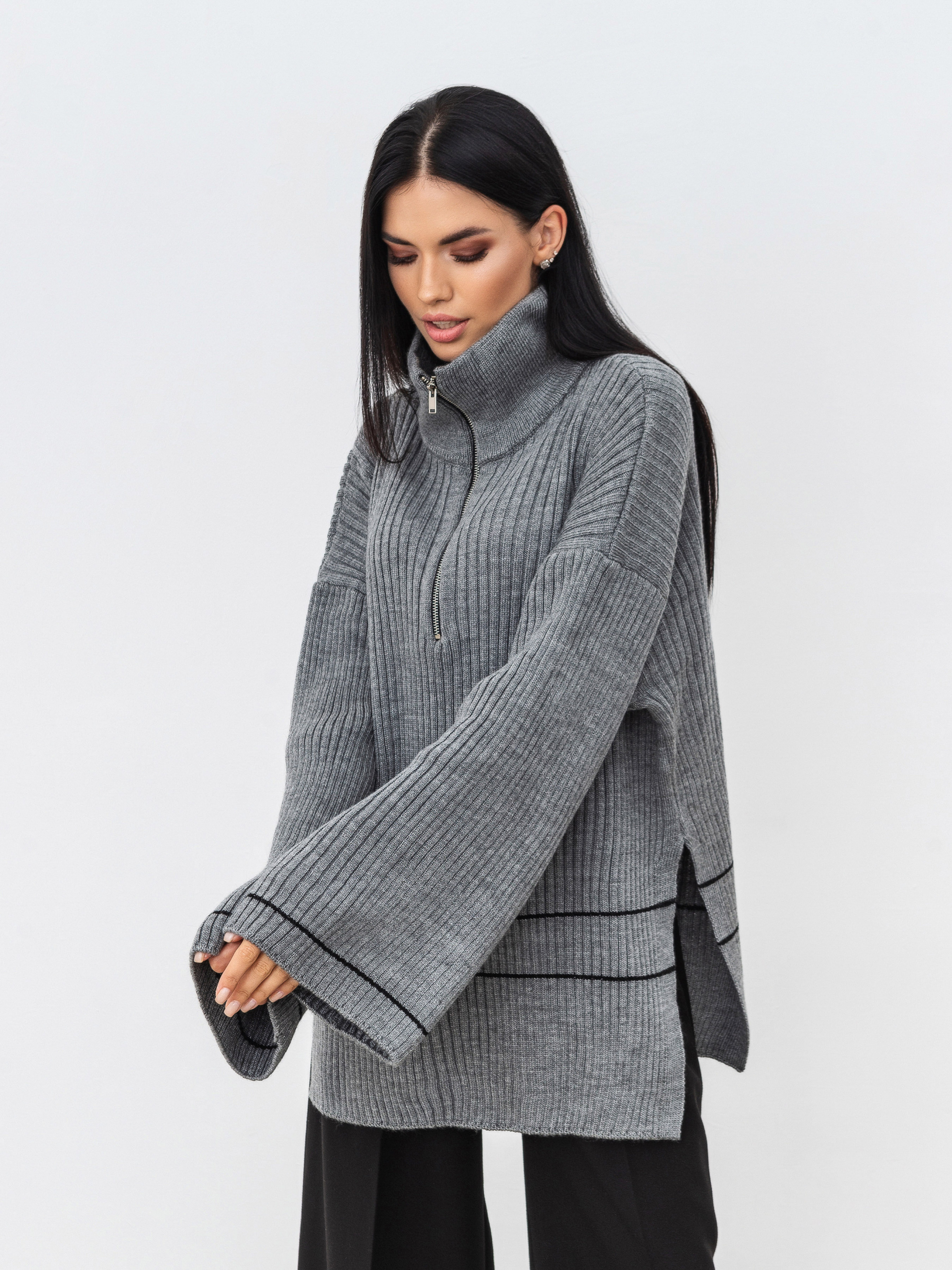 Светр вільного фасону на блискавці. Подовжений, з вільними рукавами, з боків розрізи. Блискавка залізна. Щільна в'язка, у складі шерсть. Підійде під будь-який базовий низ. Довжина по спині : 71 см Довжина рукава : 42 см Напівобхват грудей : 62 см Плечі : 72 см Напівобхват талії : 57 см
