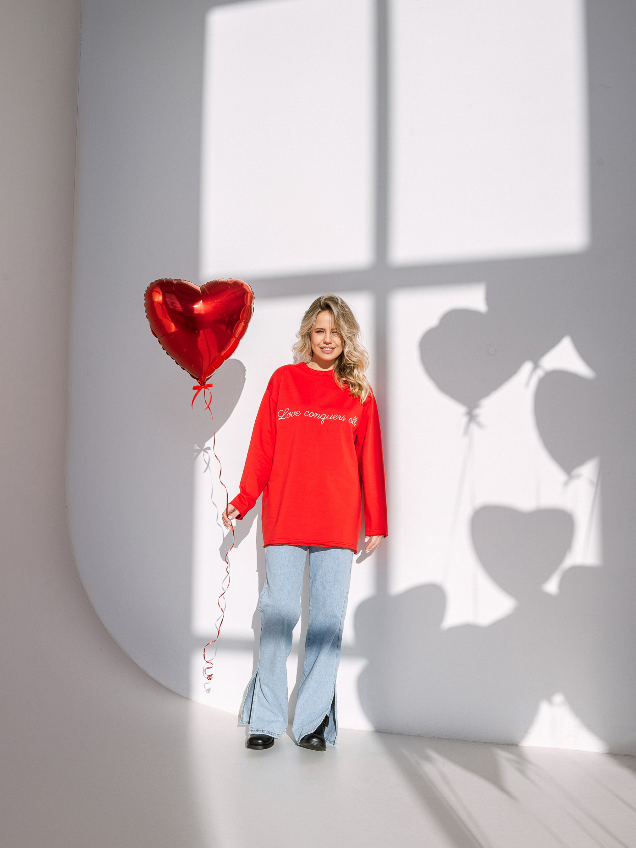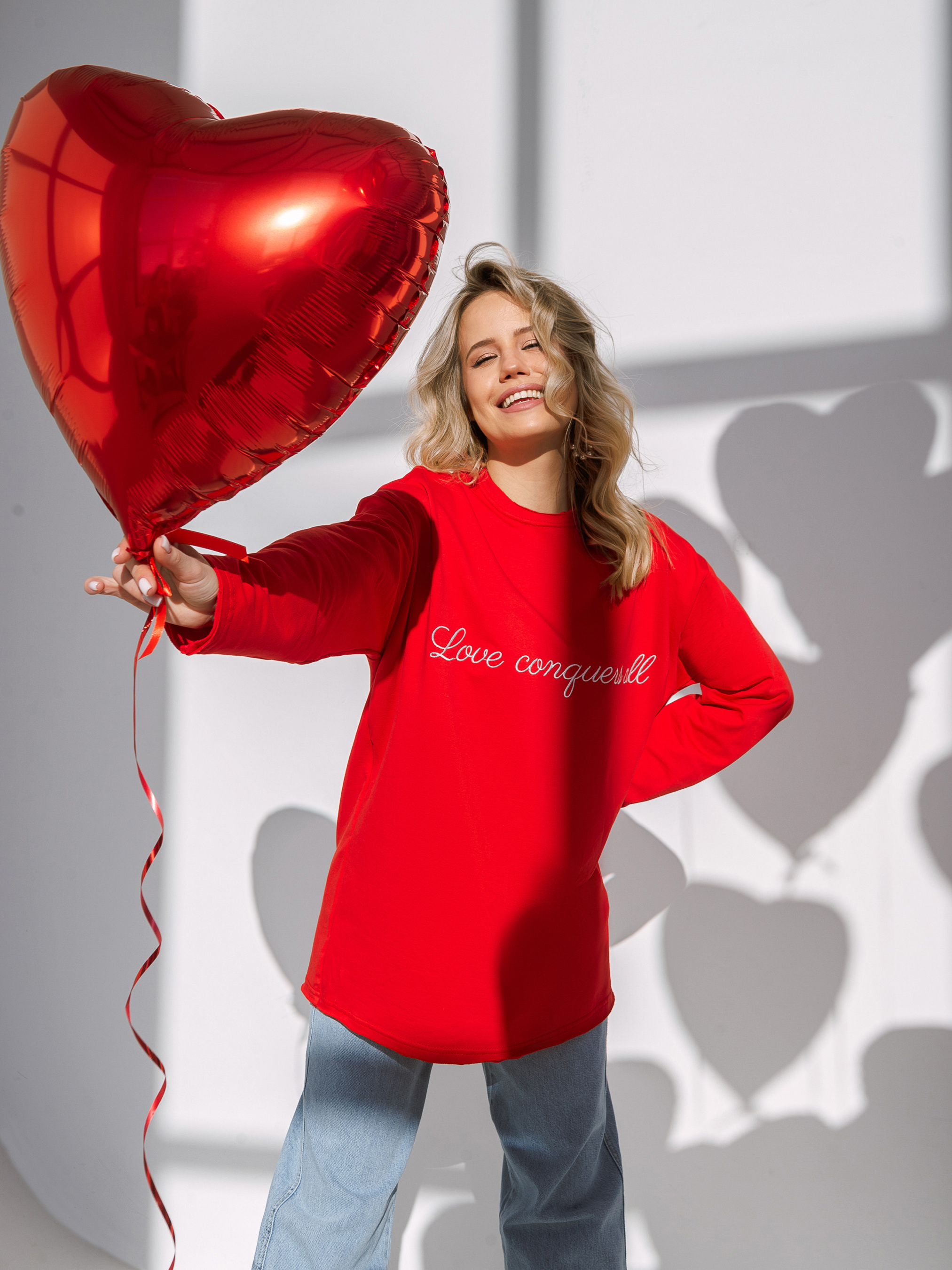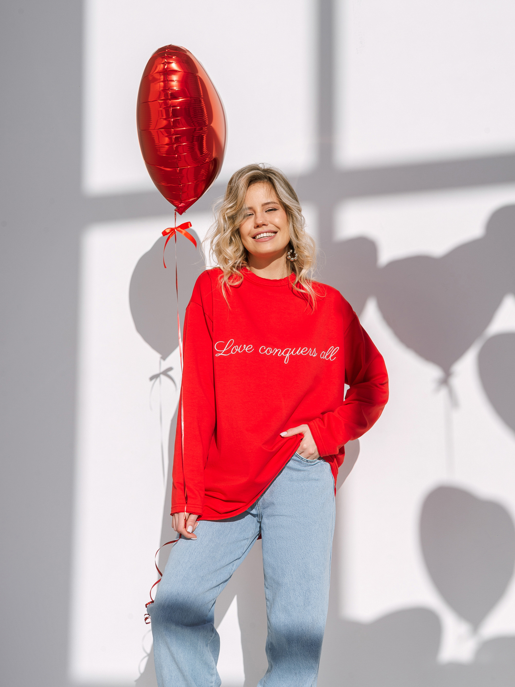 Базовий лонг з авторською вишивкою від команди ROMASHKA. Переклад напису - Любов перемагає все. Комфортний і вільний фасон. Спущена лінія плеча. Має необроблені подвійні манжети та горловину. Виготовлений з якісної щільної бавовни з домішкою еластану, щоб тканина могла трохи тягнутися. Склад 95% бавовна 5% еластан. Такий варіант лонга може бути чудовим подарунком близькій людині, а оскільки фасон унісекс - презентом і коханій людині. Дивіться більше варінтів у розділі "Купуй на подарунок". ONESIZE:- Довжина по спині : 72 см, Довжина рукава : 54 см, Напівобхват грудей : 57 см, Ширина плечей : 52 см.
