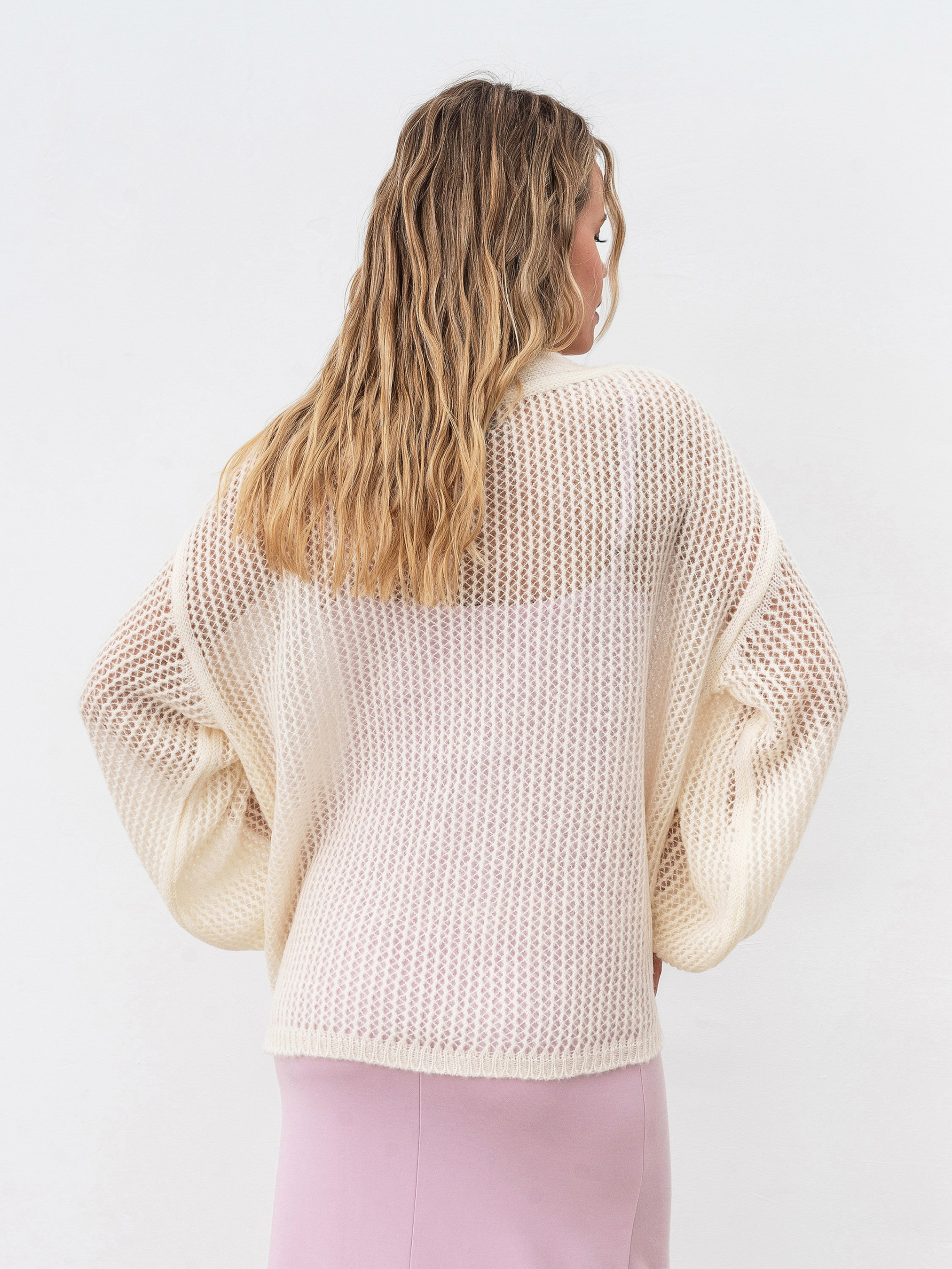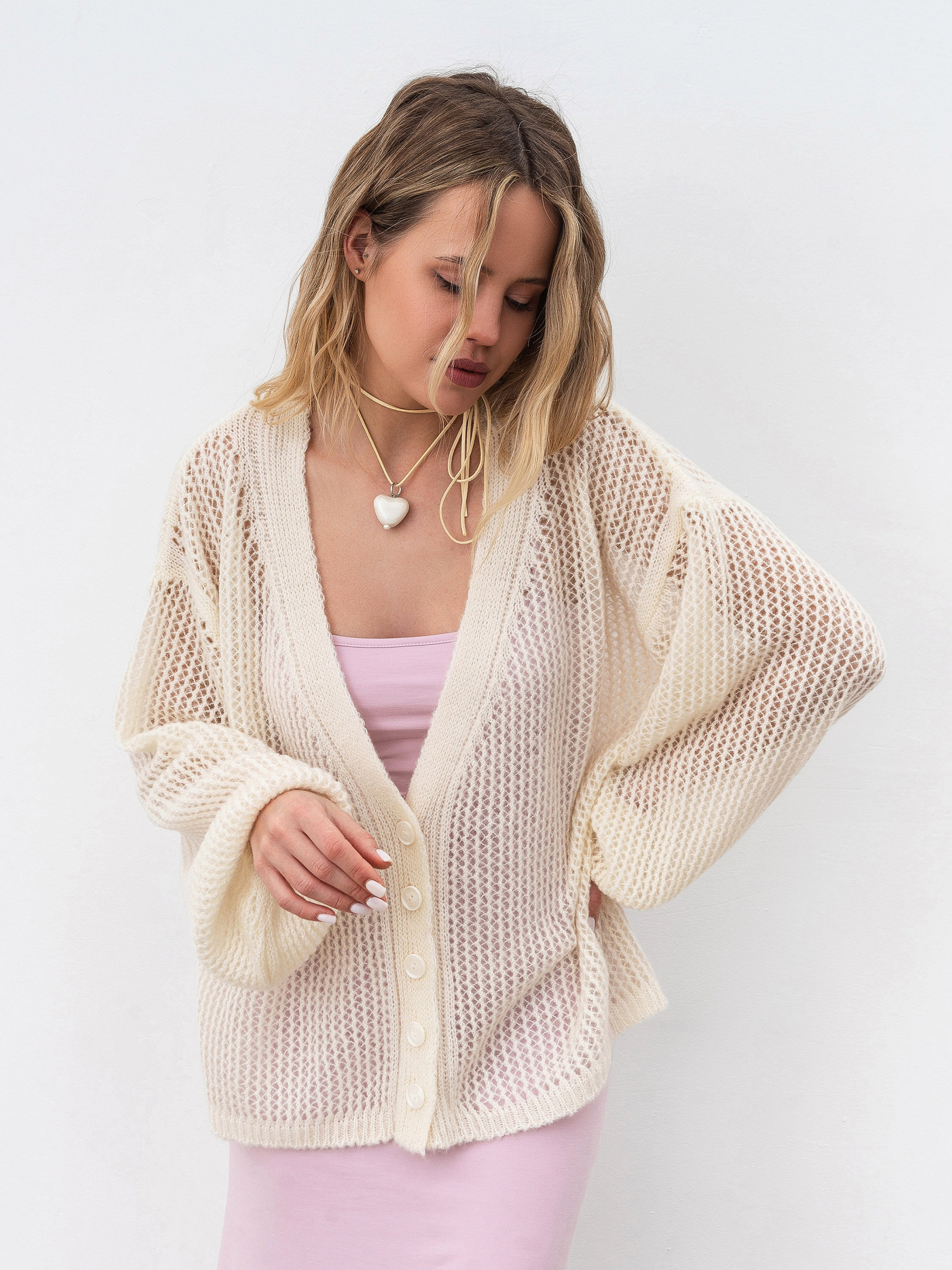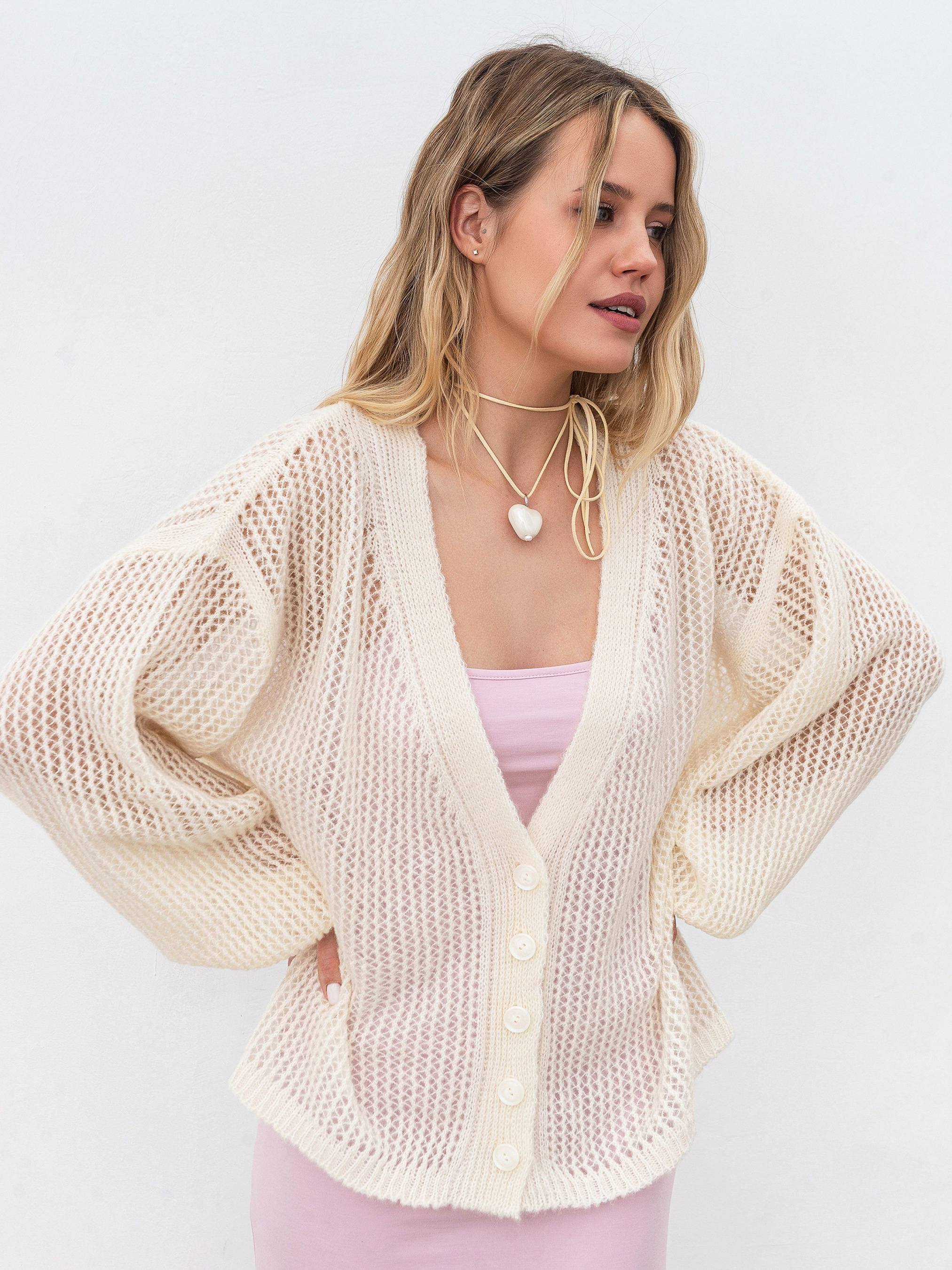 Кардиган вільного фасону з невагомої в язки-павутинки. Вільні об ємні рукава, манжети на резинці. Модель має V-подібний розріз. Кардиган чудово підійде під будь-які літні сукні, особливо шовкові сукні-комбінації, а також до більш базового гардеробу. Наприклад, джинси чи шорти. У догляді радимо надавати перевагу ручному пранню з використанням делікатних засобів. Зберігати варто у складеному вигляді. Довжина по спині : 62 см Довжина рукава : 50 см Напівобхват грудей : 64 см Плечі : 60 см Напівобхват талії : 63 см