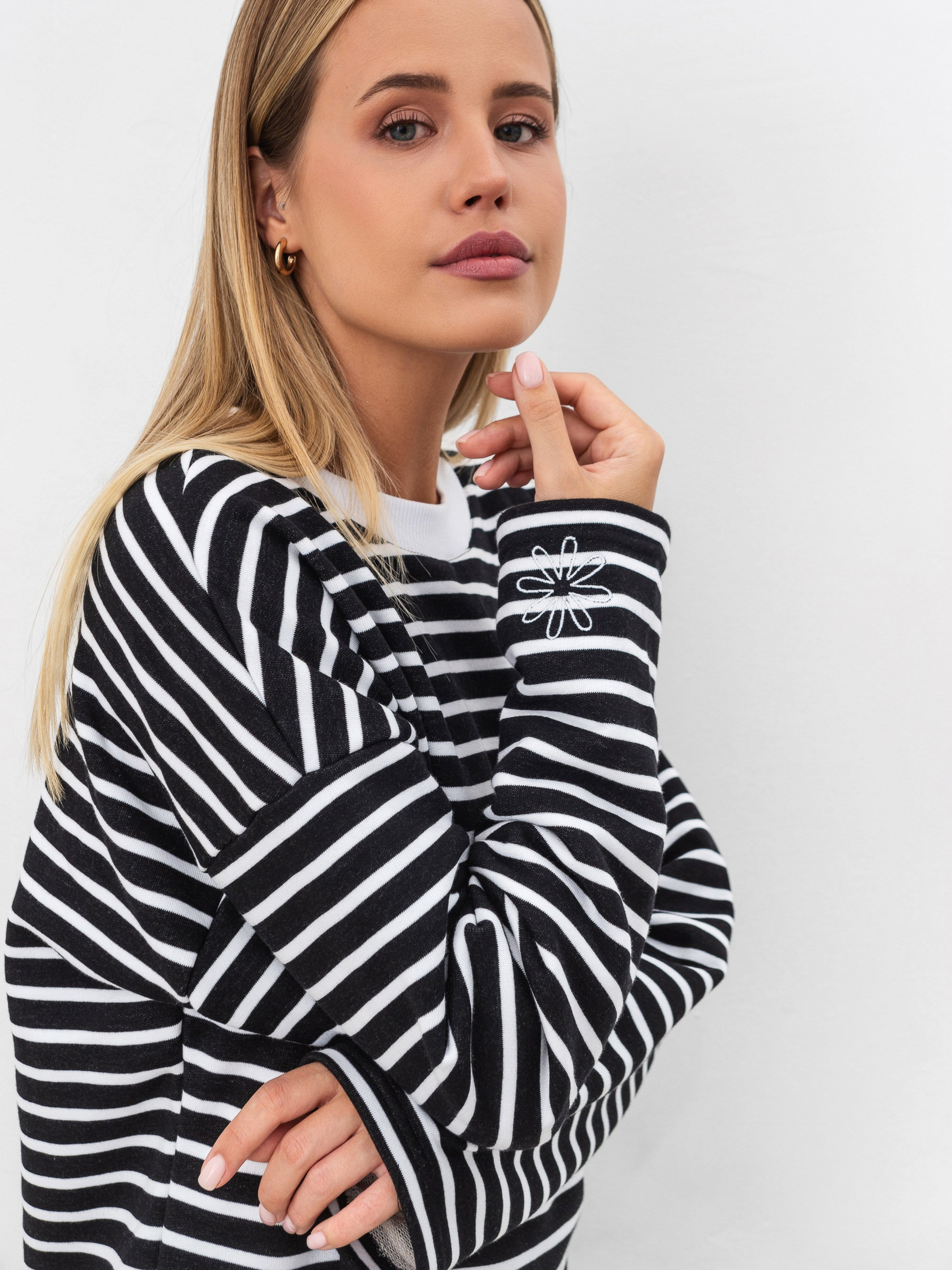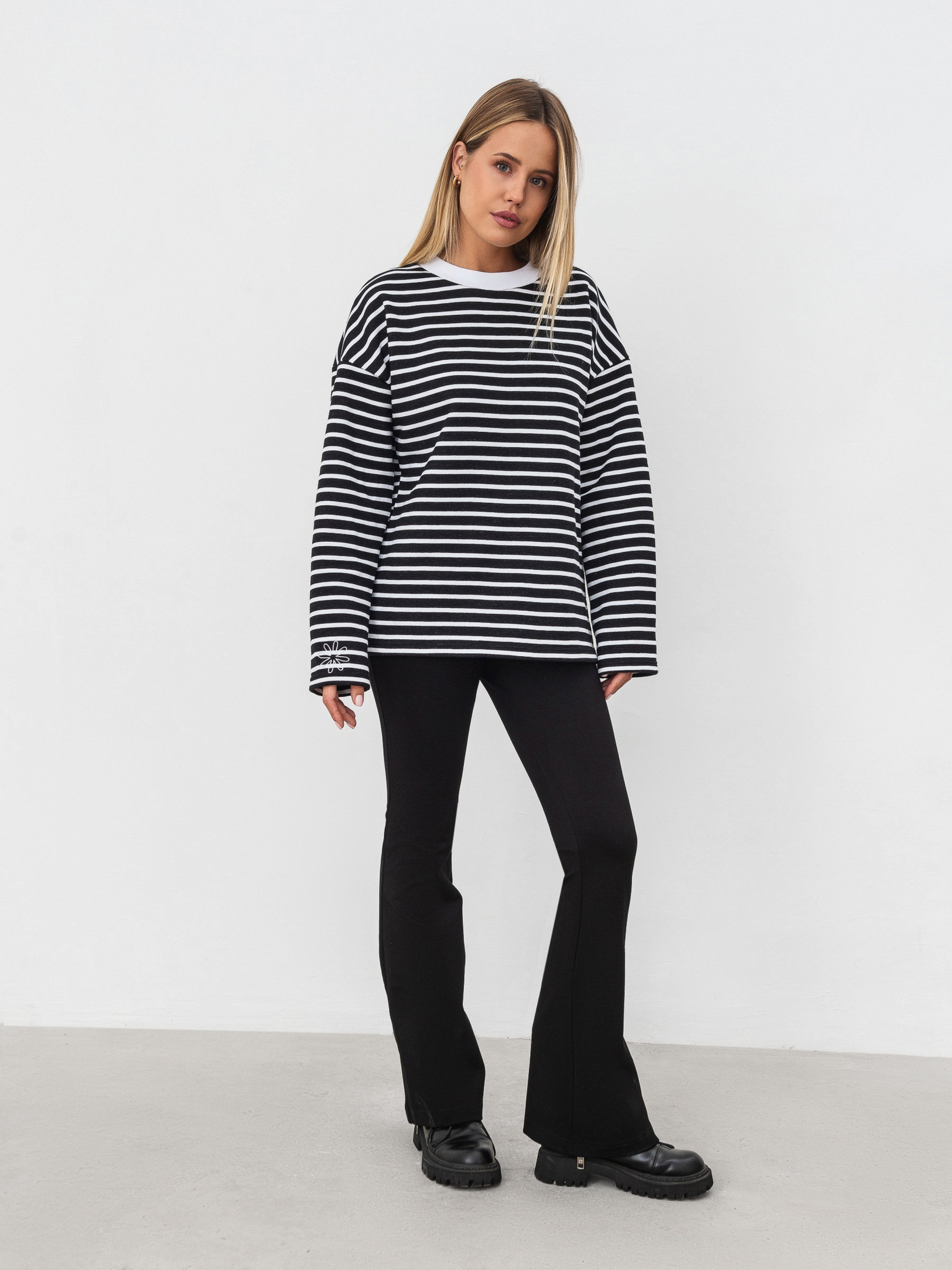 Трендовий тільник вільного силуету з довгим рукавом. На моделі є невеликі розрізи з боків. У бічних швах невеликі розрізи. Є невелика декоративна вишивка у вигляді силуету ромашки. Тільник виготовлений з трикотажу. У складі 70% бавовни та 30% поліестеру. Базовий варіант на кожен день, який легко поєднується з різними низом: від базового до спортивного. Доповнити образ можна однотонною сумочкою та окулярами.