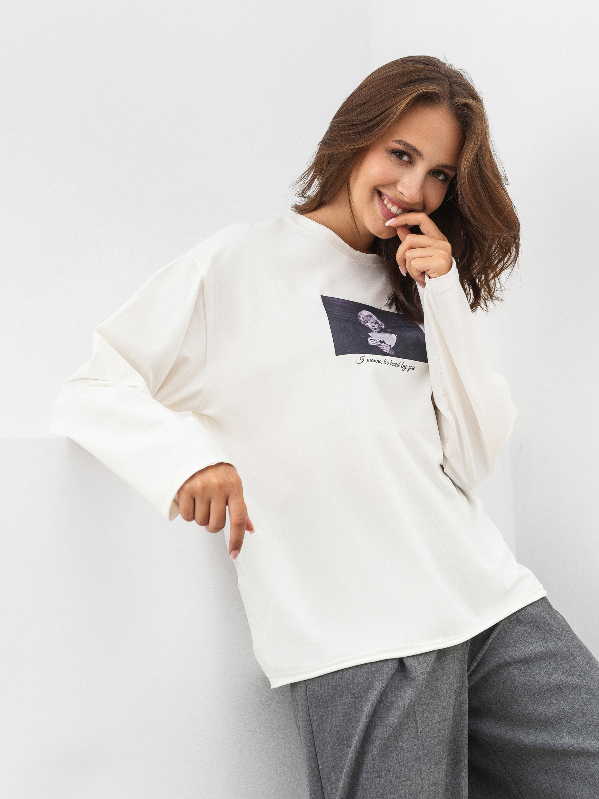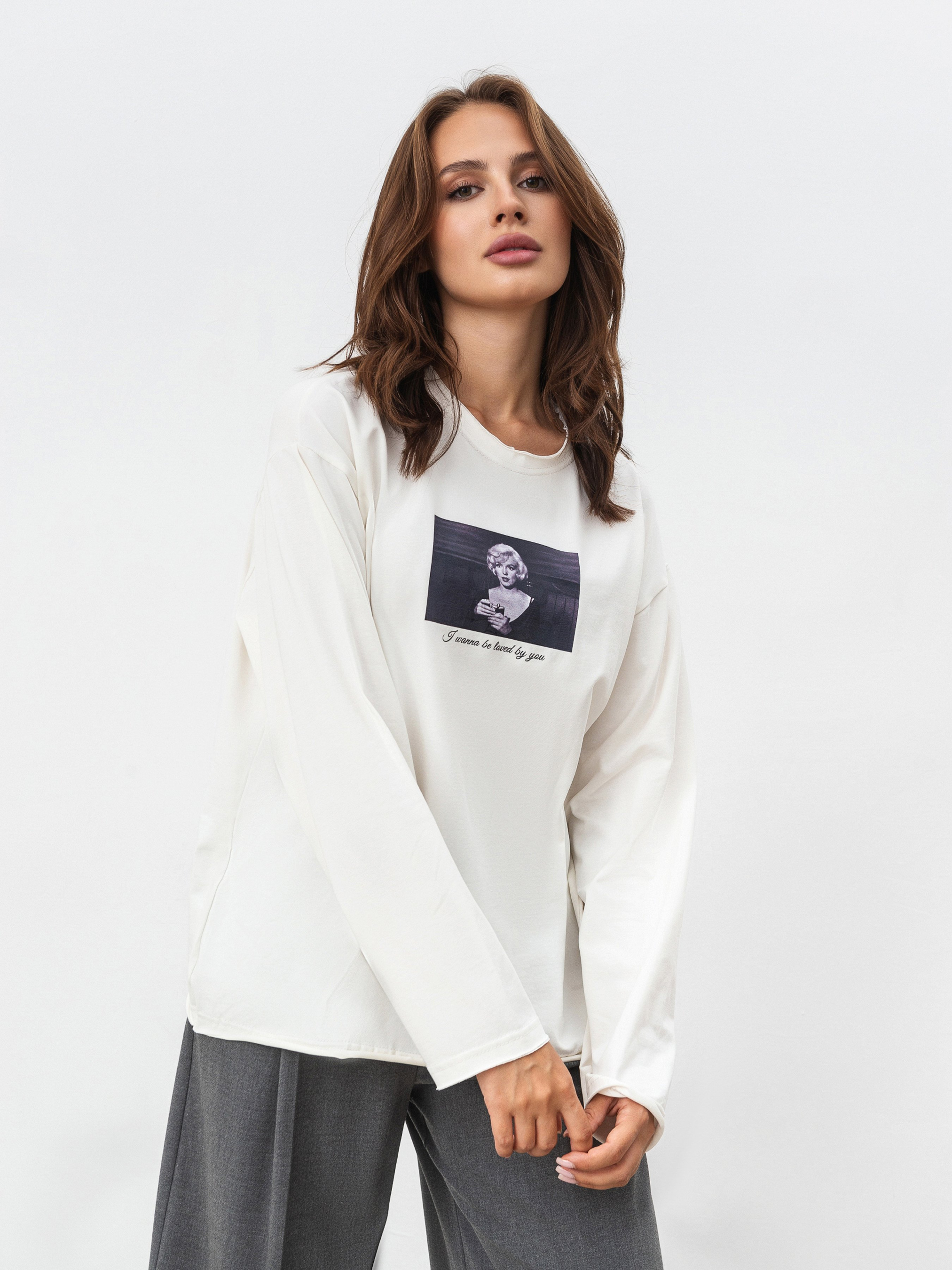 Стильний базовий лонг прямого силуету з принтом. Низ лонгу, горловина та рукавчики мають ефект необробленого краю. Має авторський принт кадри з улюблених кінофільмів. Лонг виготовлений з трикотажу, який має високий вміст бавовни у складі, тому приємно відчувається на тілі, легко переться та підійде для різної погоди. Базовий лонг легко поєднується з різним низом: спідниці, джинси, штани, шорти тощо. Доповнювати образи можна шопером, аксесурами на голову та прикрасами. XS-S Довжина по спині : 63 см Довжина рукава : 52 см Напівобхват грудей : 53 см Плечі : 48 см Напівобхват талії : 52 см M-L Довжина по спині : 69 см Довжина рукава : 57 см Напівобхват грудей : 63 см Плечі : 54 см Напівобхват талії : 61 см