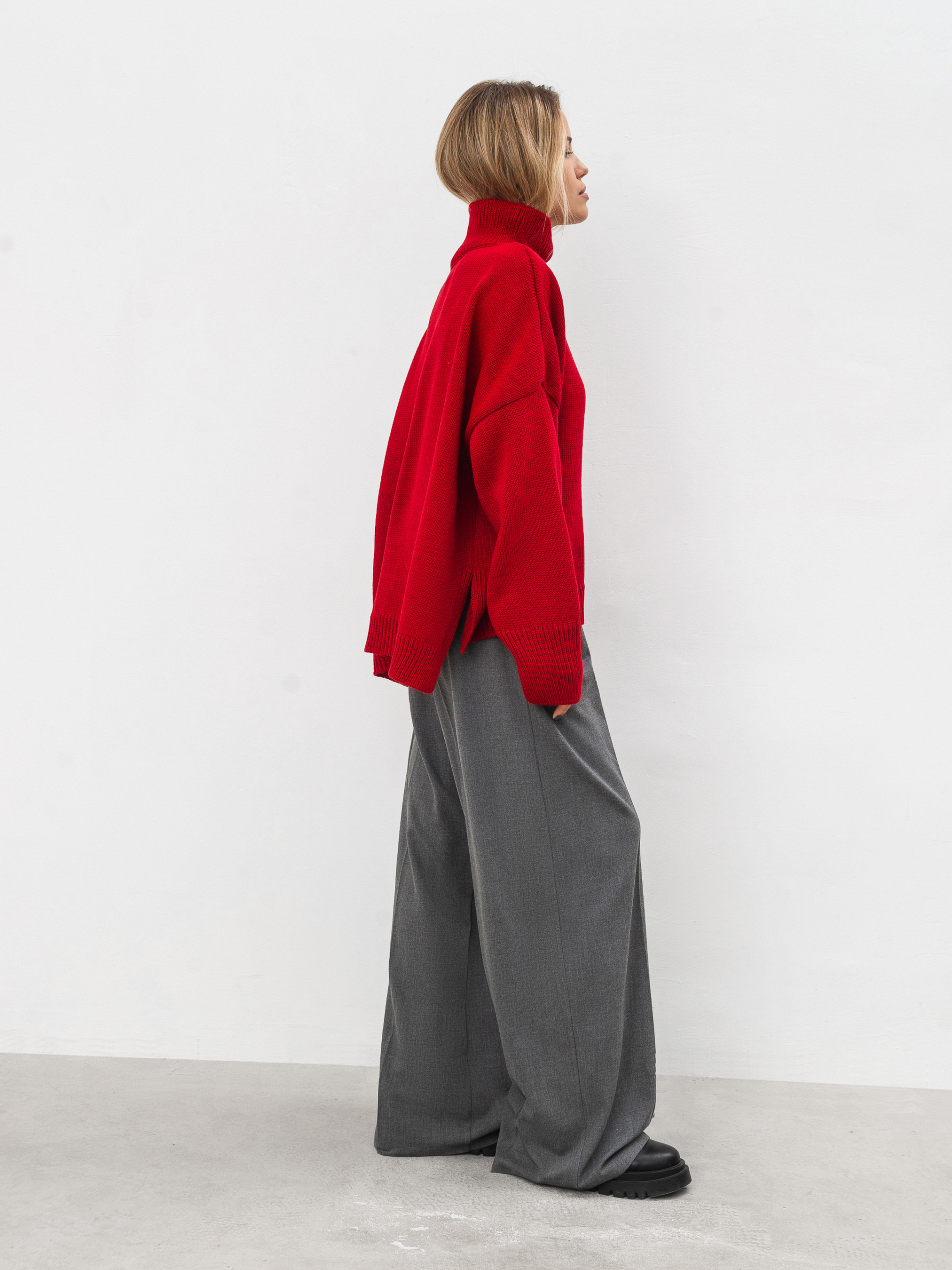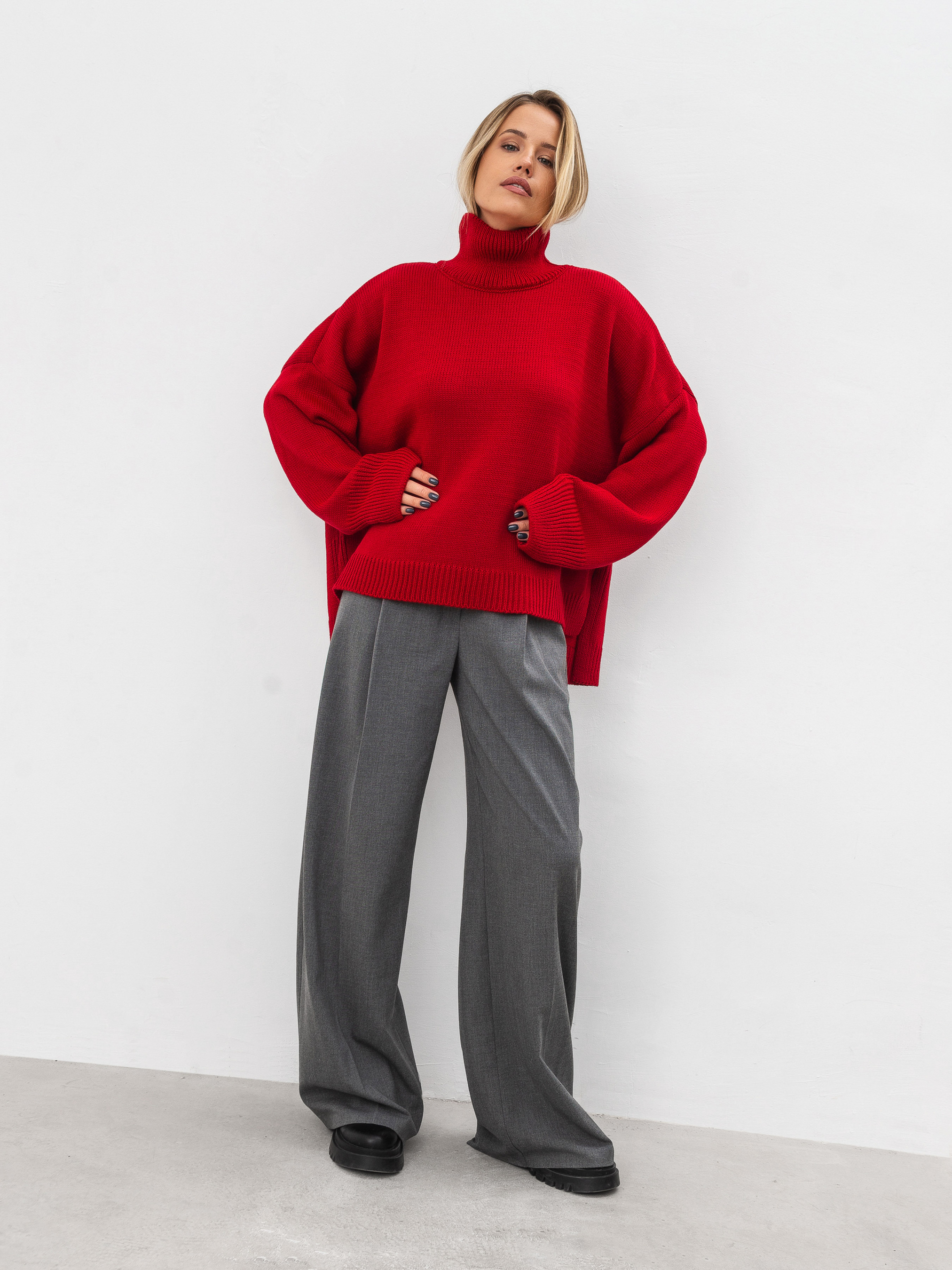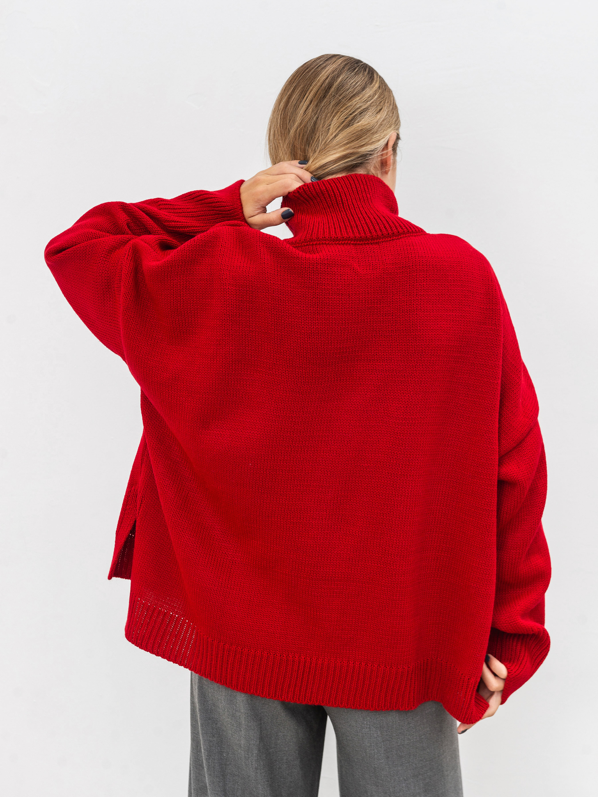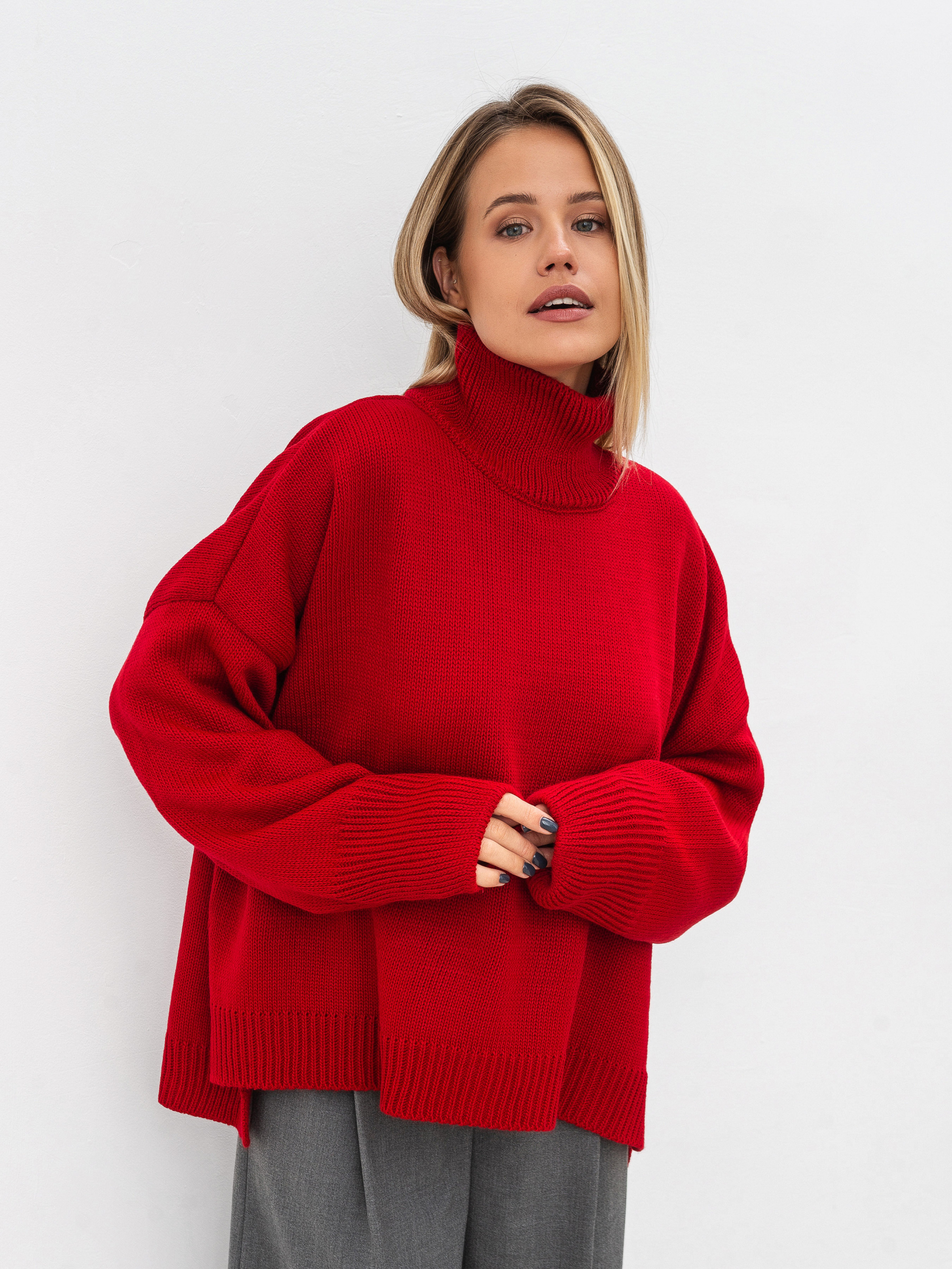 Трендовий светр вільного фасону з високою горловиною. Модель має широкі рукавчики, стійку горловину та спущений плечовий шов. Теплий та затишний варіант для повсякденних образів. Комбінувати радимо зі спідницями чи класичними штанами, а доповнити пальто та високими чобітками. Такі луки ідеально підійдуть для прогулянок і робочих буднів. Довжина по спині : 60 см Довжина рукава : 43 см Напівобхват грудей : 73 см Плечі : 74 см