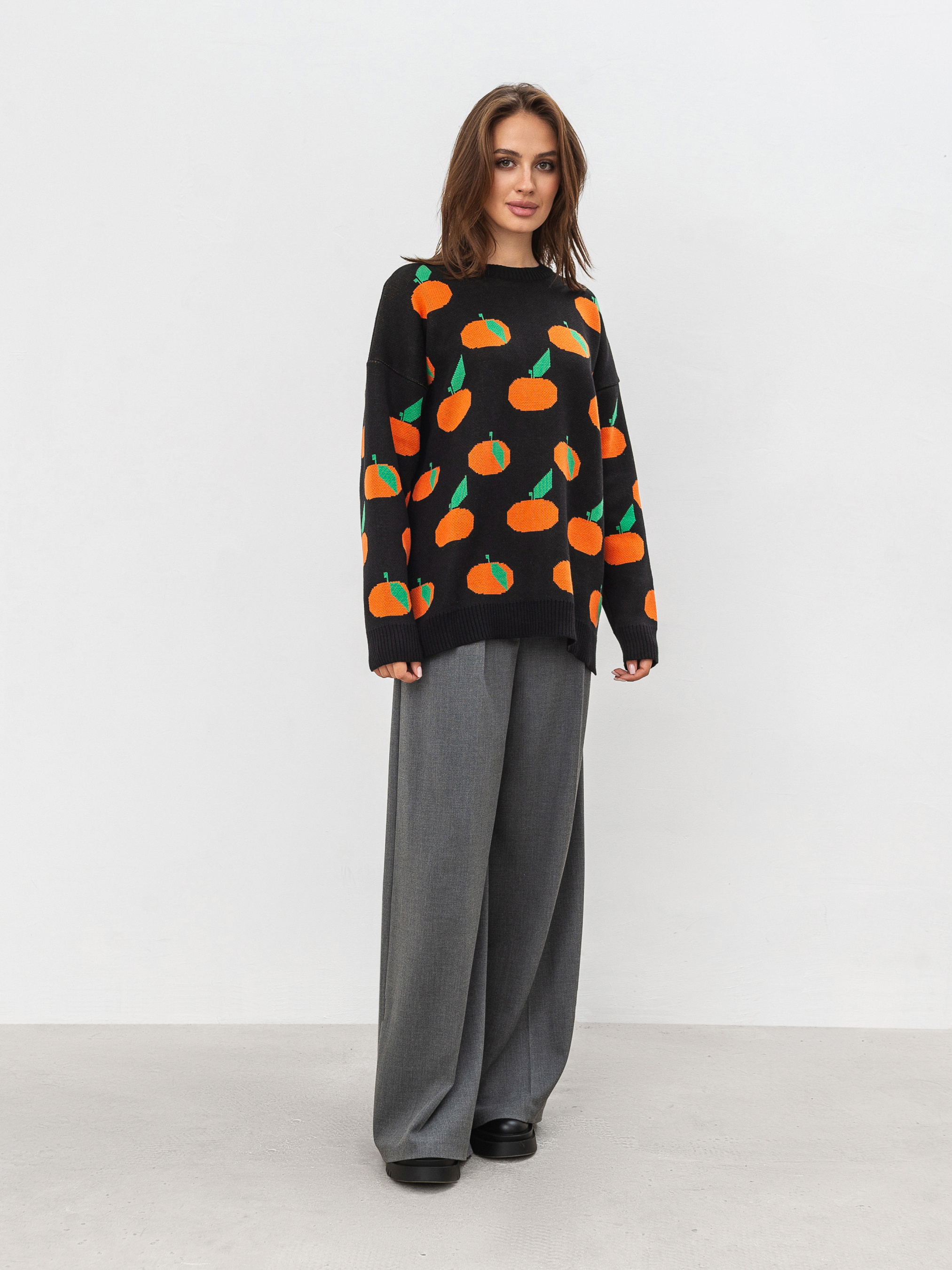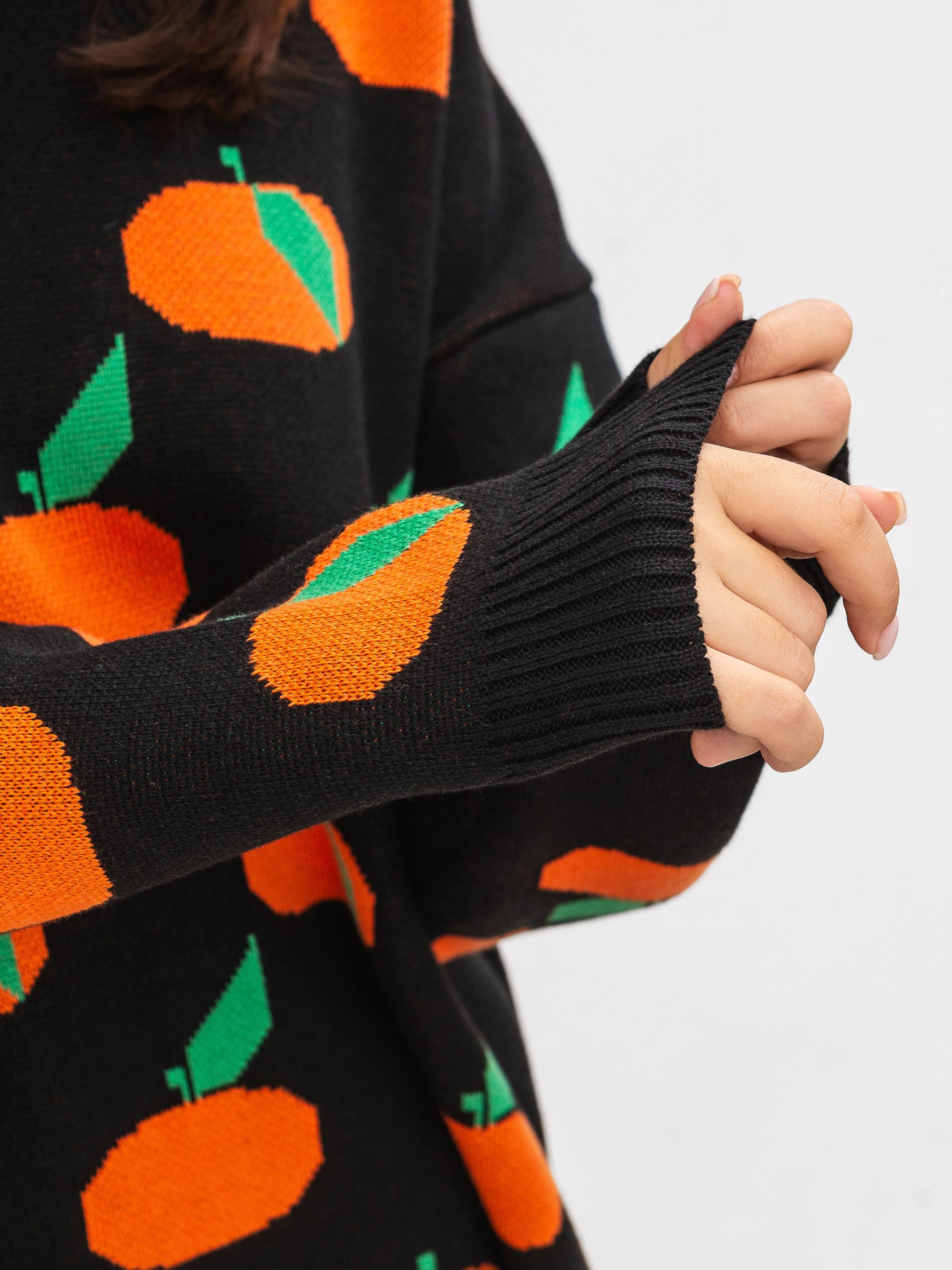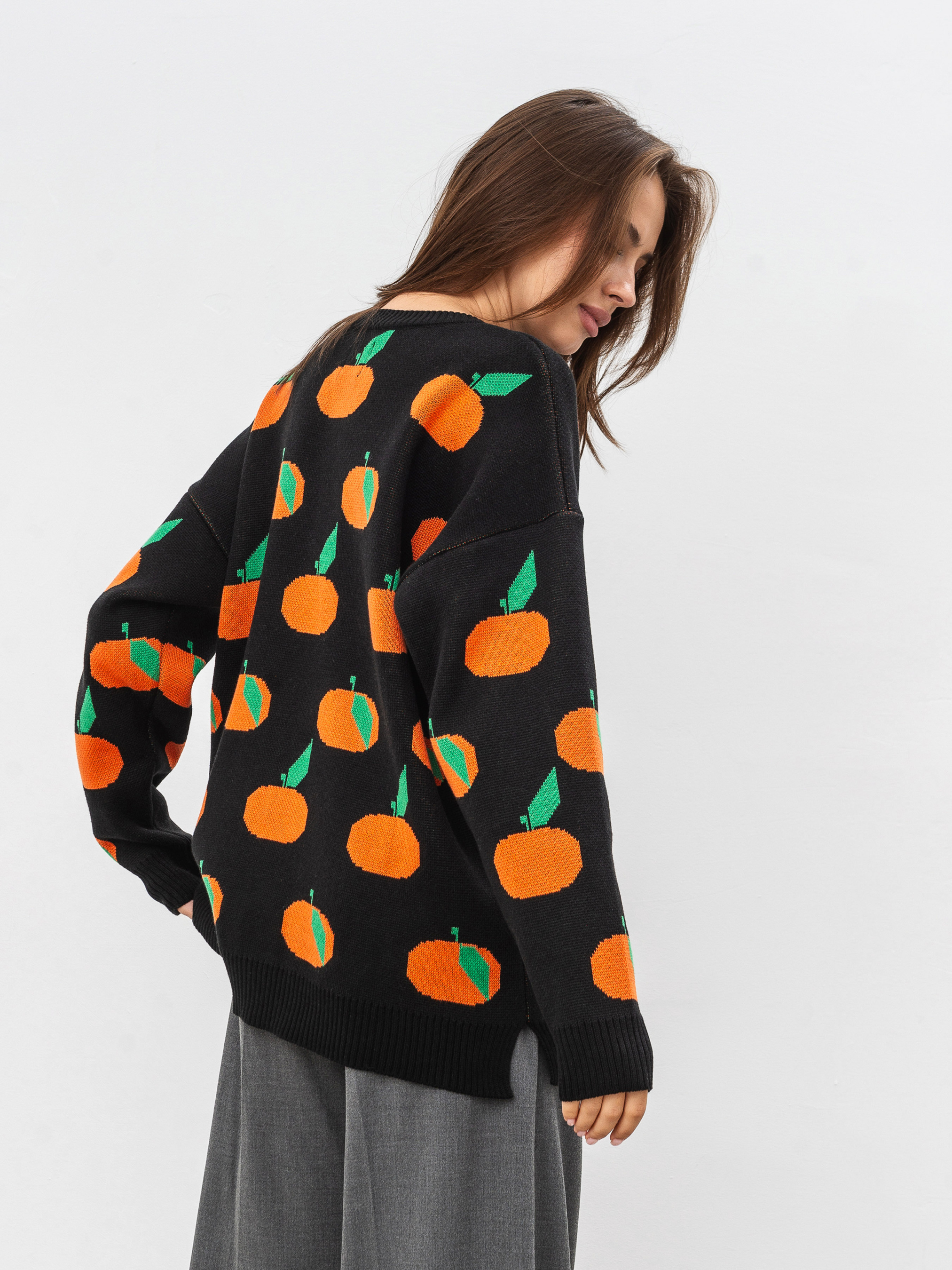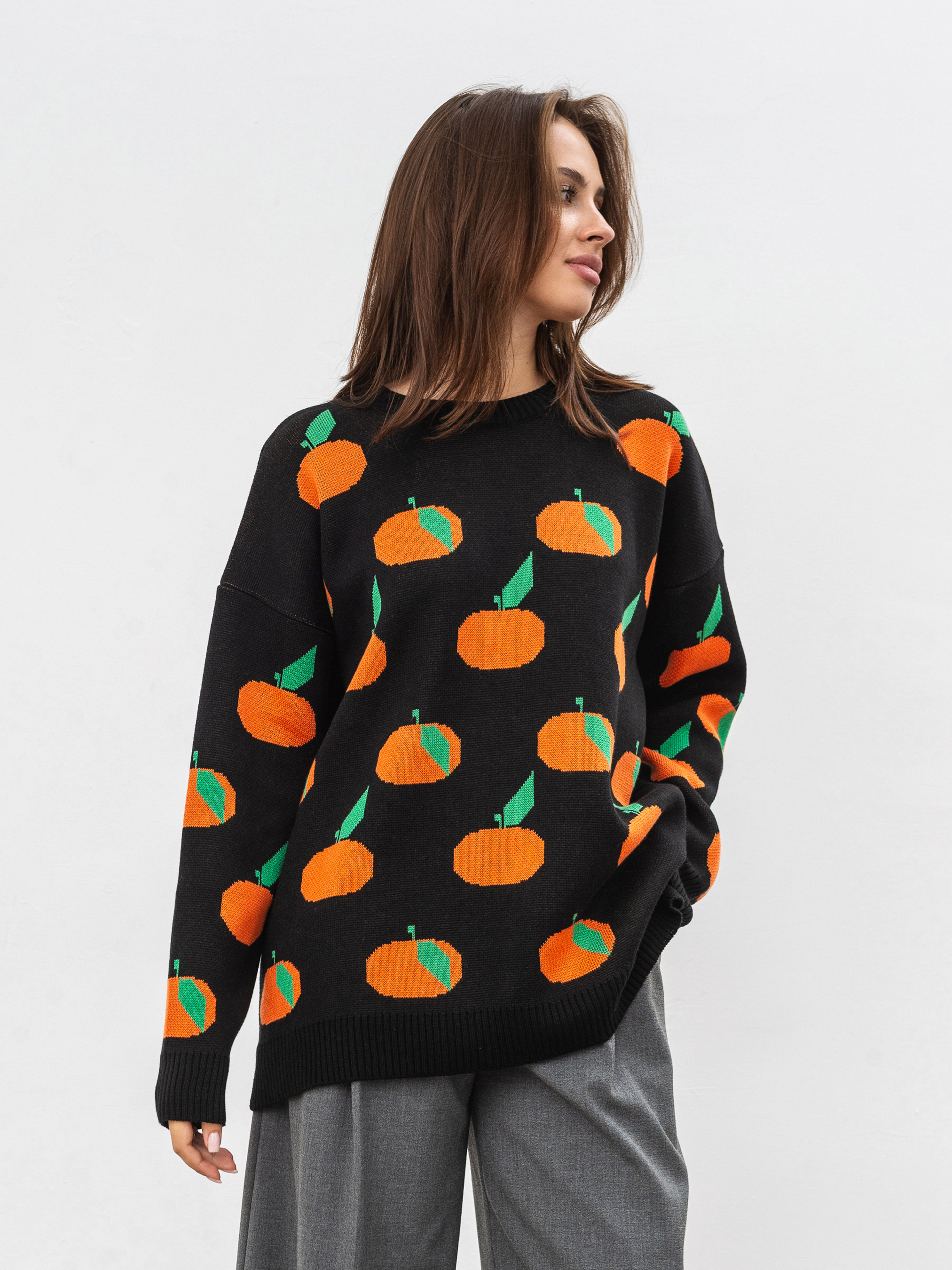 Модель виготовлена з щільної вʼязки, яка має у складі бавовну, тому приємно відчувається на тілі та під час носіння. Має авторський принт мандаринки.