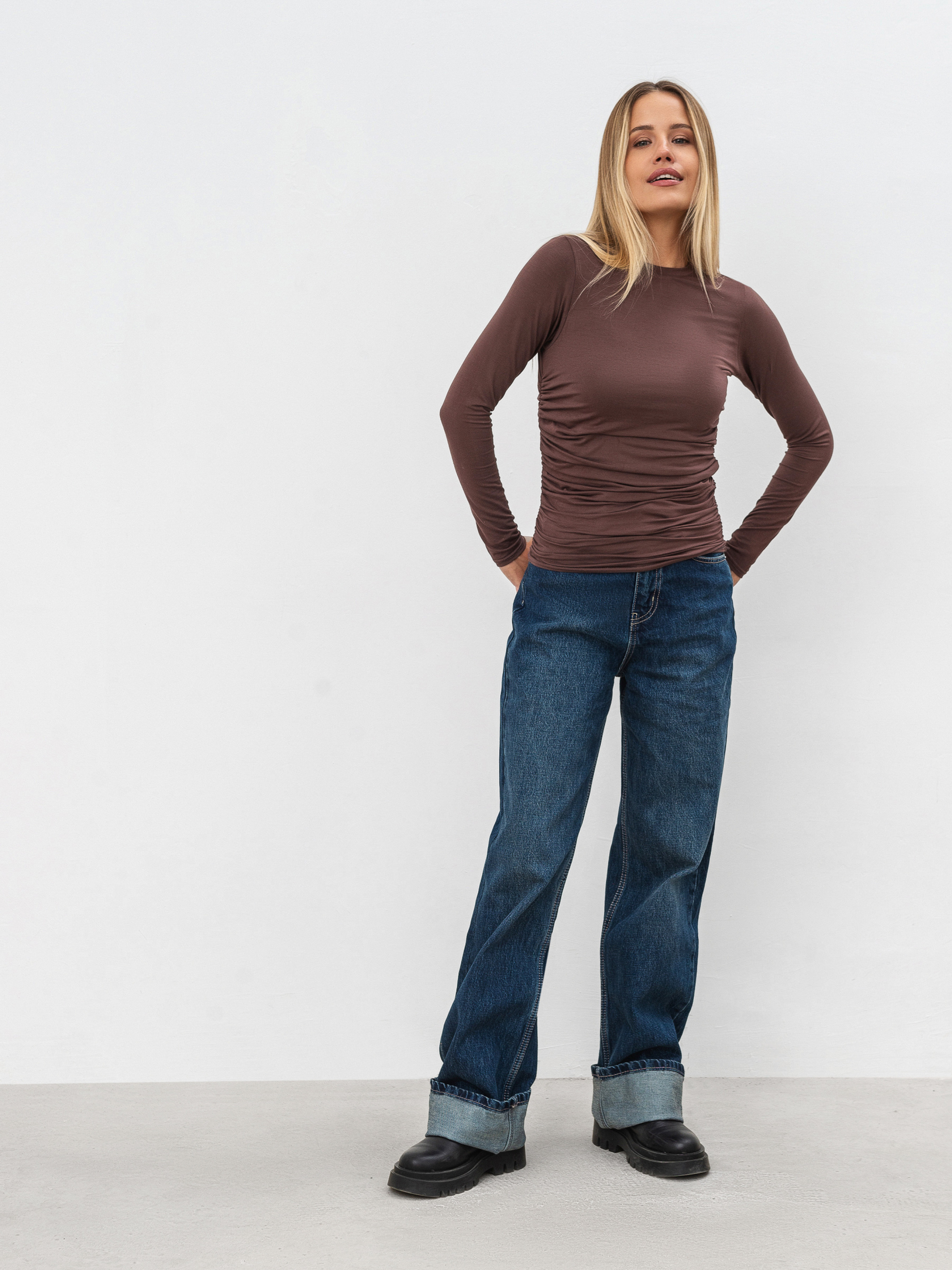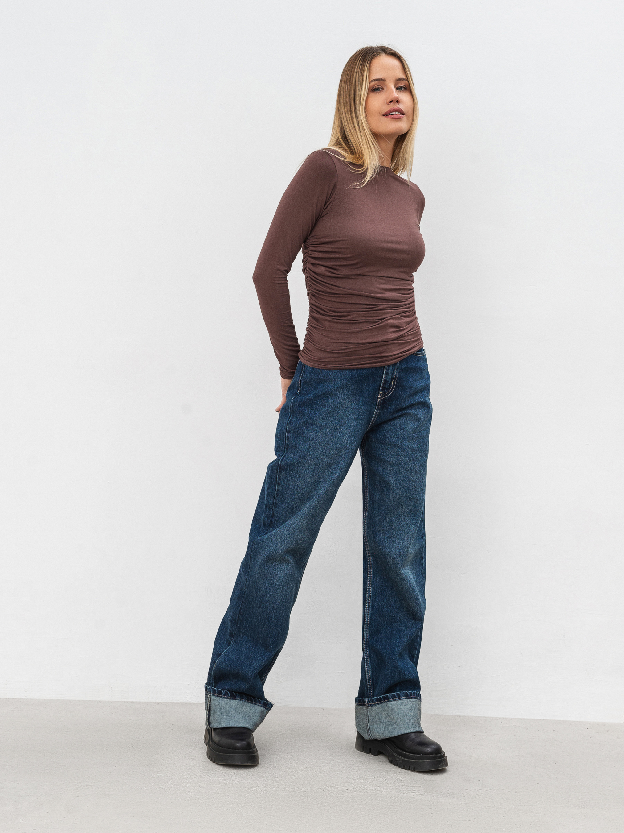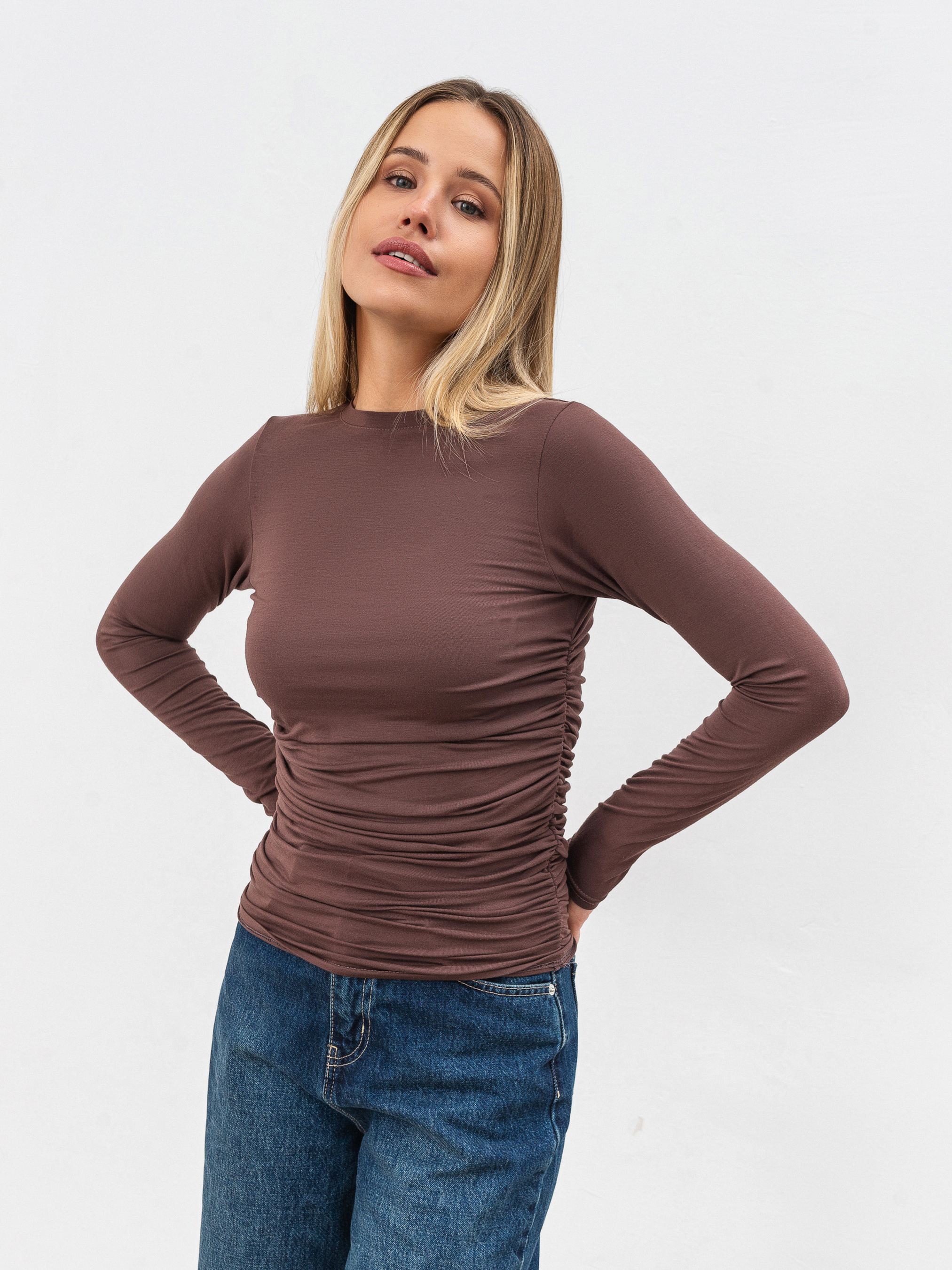 Базовий лонг з довгим рукавом. Модель має приталений силует та декоративні складки з обох боків, що додає акцентності образам з лонгом. Виготовлений з трикотажу з поєднанням з віскозою. Комфортний і стильний варіант для повсякденних чи класичних образів. Поєднувати можна з джинсами, спідницями, бермудами й доповнювати піджаком чи бомбером. XS-S Довжина по спині : 54 см Напівобхват грудей : 33 см Плечі : 29 см Напівобхват талії : 30 см Довжина рукава : 55 см S-M Довжина по спині : 54 см Напівобхват грудей : 34 см Плечі : 30 см Напівобхват талії : 31 см Довжина рукава : 55 см M-L Довжина по спині : 55 см Напівобхват грудей : 36 см Плечі : 32 см Напівобхват талії : 33 см Довжина рукава : 55 см L-XL Довжина по спині : 55 см Напівобхват грудей : 37 см Плечі : 33 см Напівобхват талії : 34 см Довжина рукава : 55 см