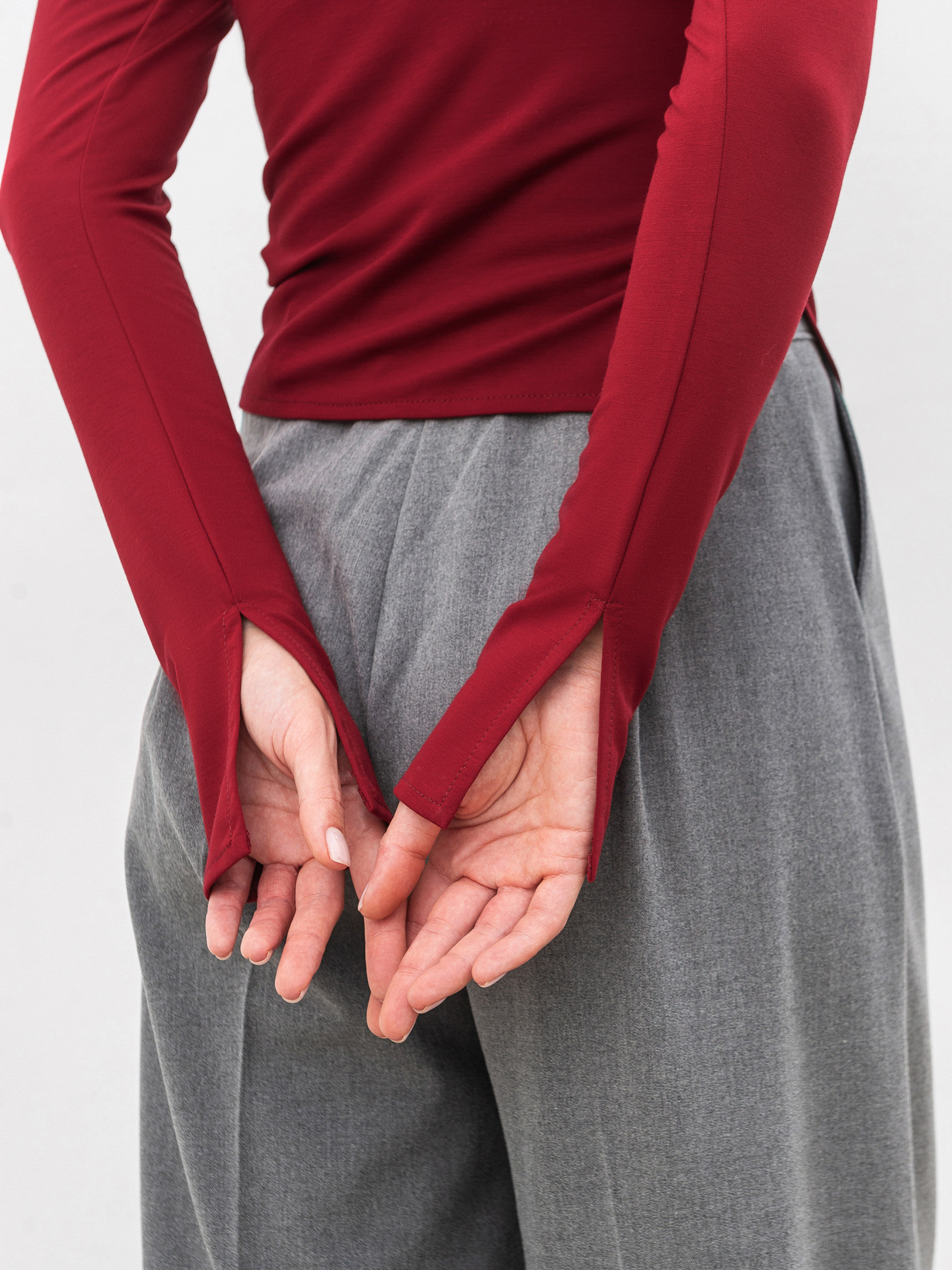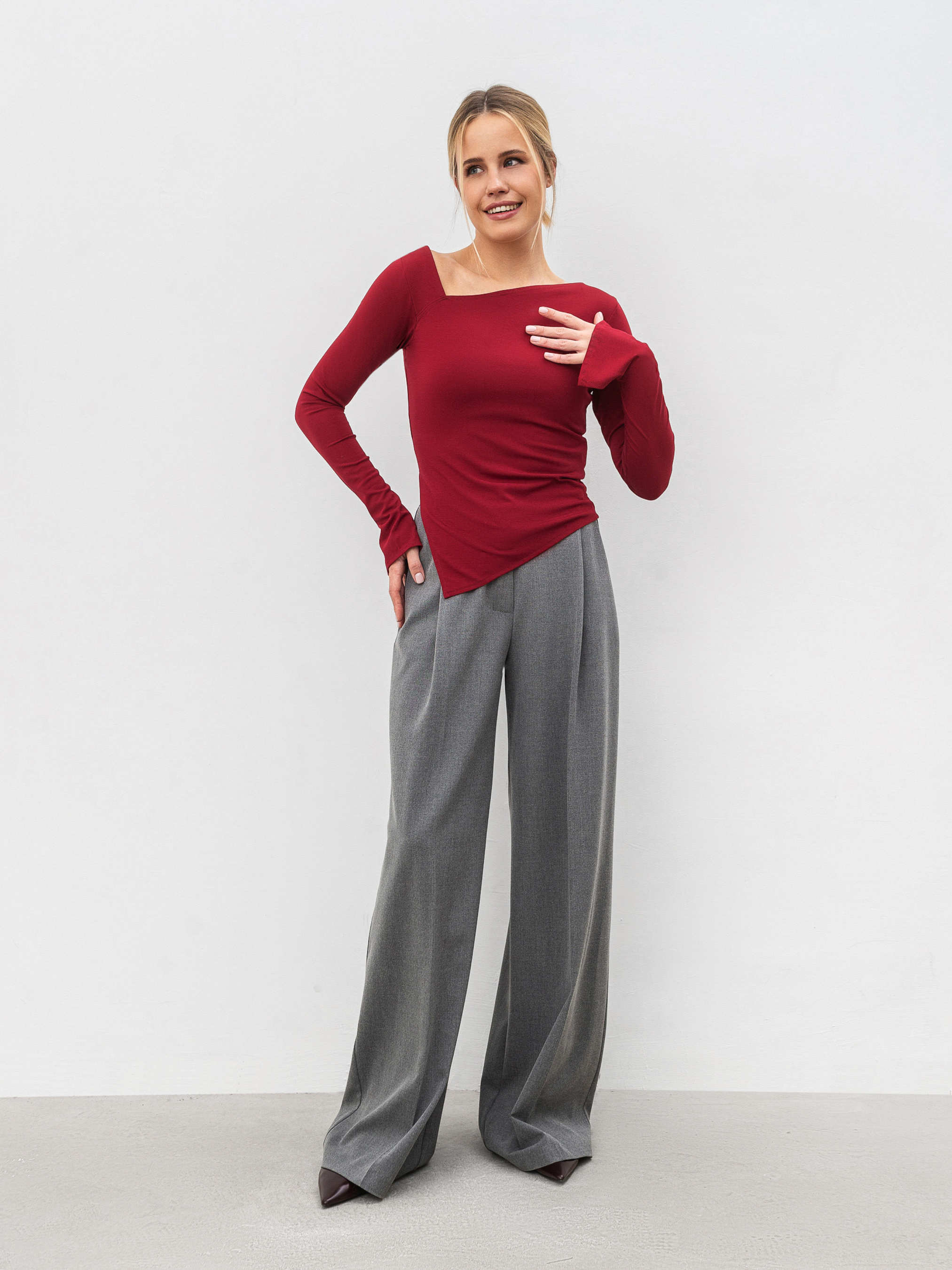 Базовий лонг прилеглого силуету з асиметричним краєм. Модель має розрізи по низу рукавів. Асиметрична горловина додасть цікавості образам. Виготовлена з приємного на дотик трикотажу, що добре тягнеться. Базовий лонг можна вдало поєднувати зі складнішими елементами, наприклад брюки-палацоо, джинси різних фасонів чи спідниця з фактурної тканини.