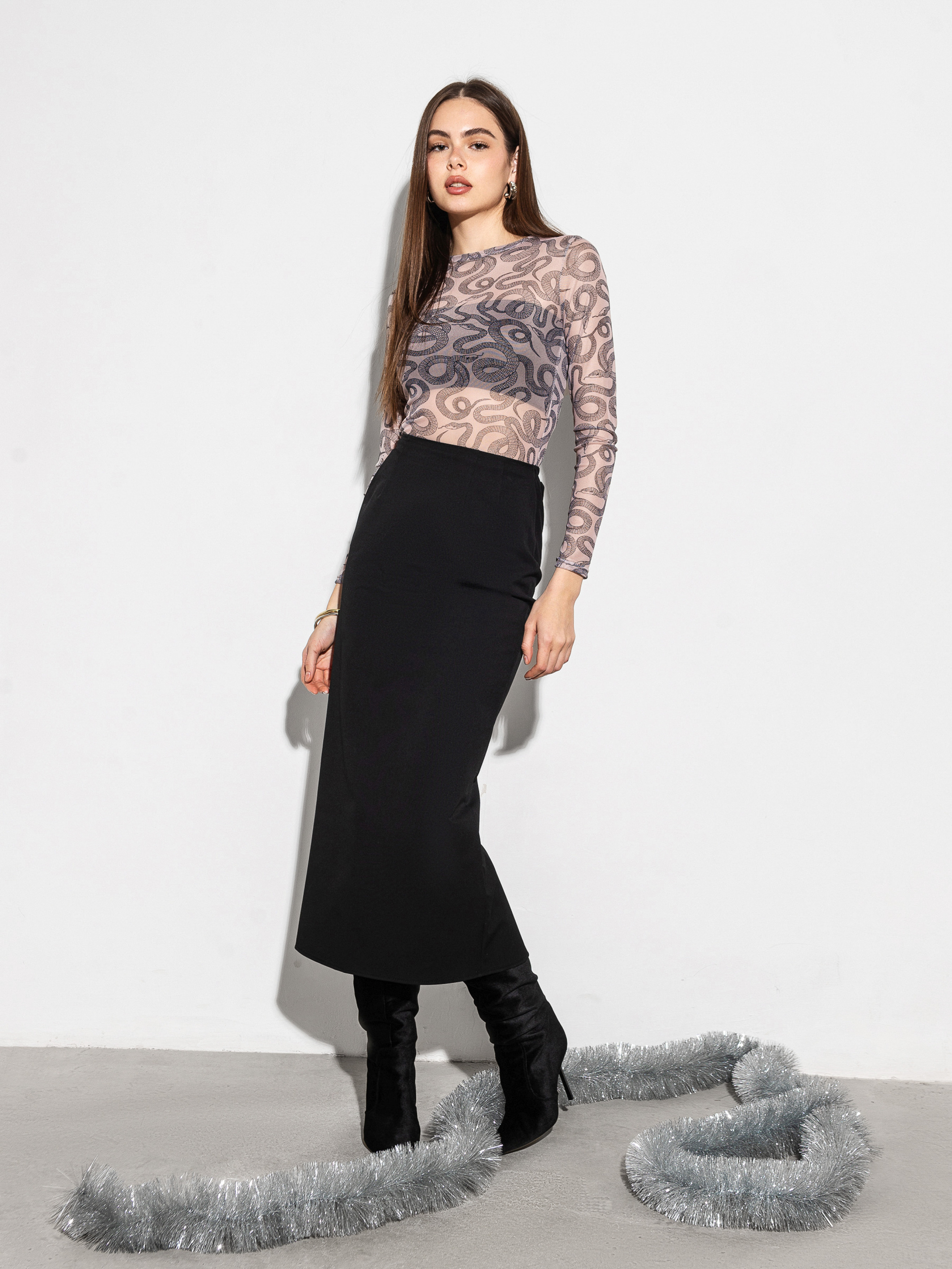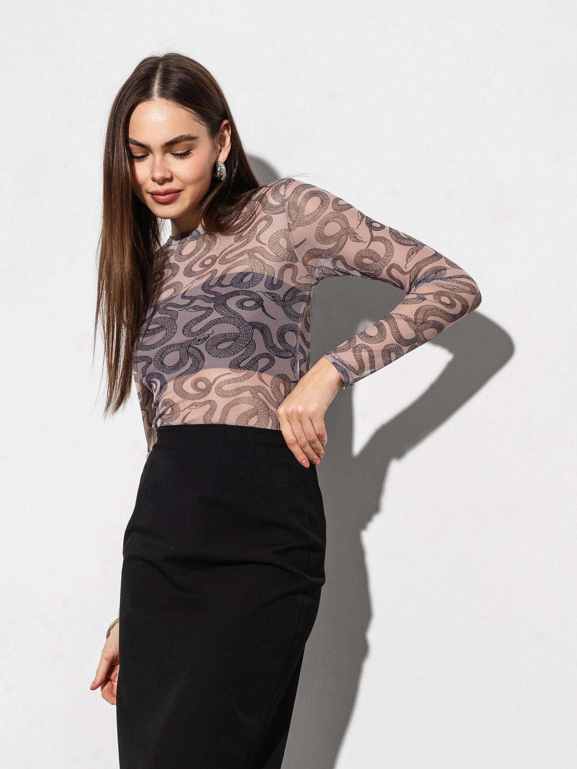 Акцетний лонг прилеглого силуету з принтом. Модель з довгим рукавом має цікавий авторський принт змії. Виготовлена з мякої напівпрозорої сітки, що приємно відчувається на тілі. Ідеальний варіант для бунтарних образів із косухою чи шкіряним бомбером. Лонг можна комбінувати з чорними брюками чи джинсами. У якості доповнення радимо обрати рюкзак або сумку акцентної форми Джин. Модель не має додаткового топу внизу.