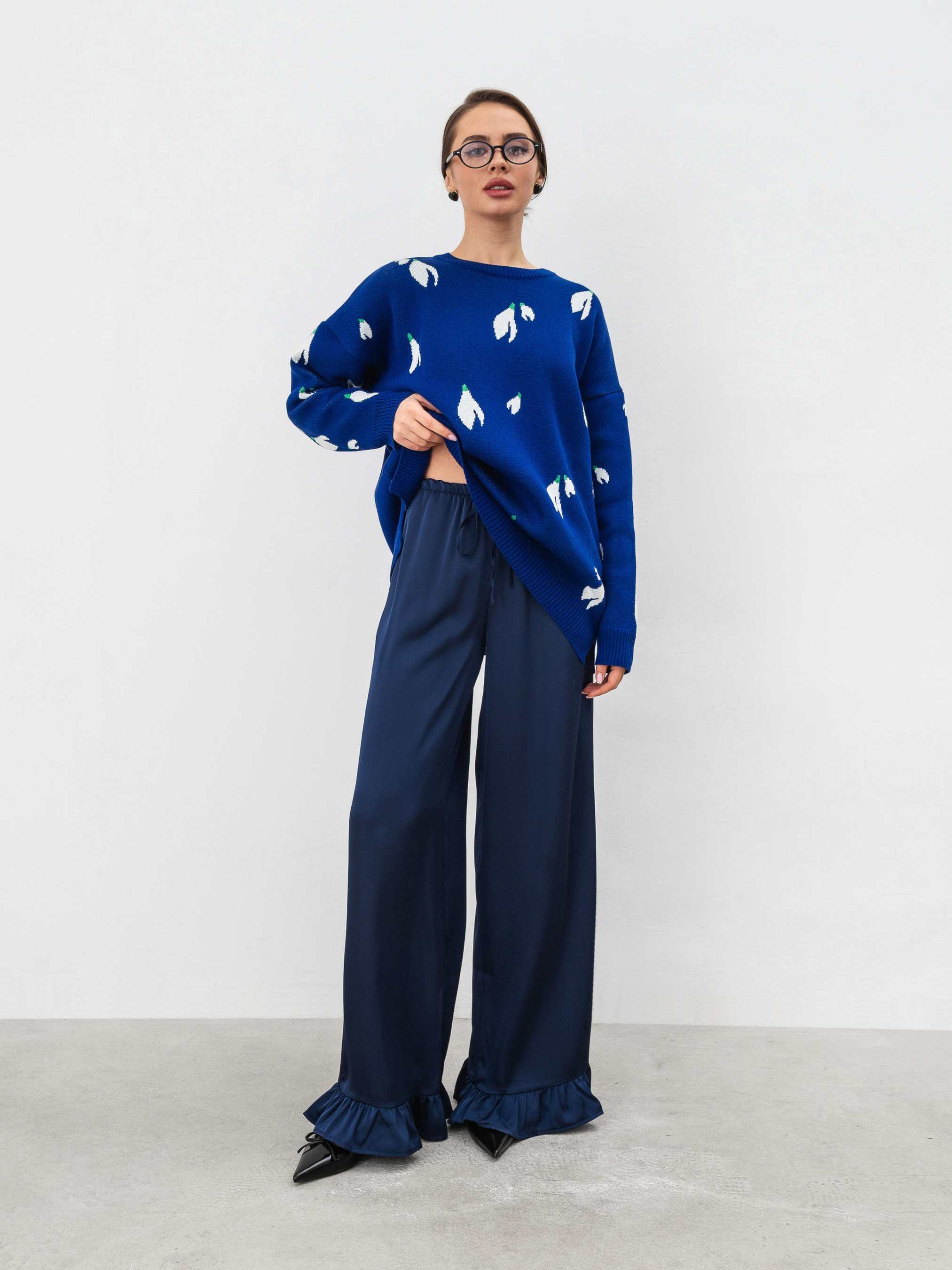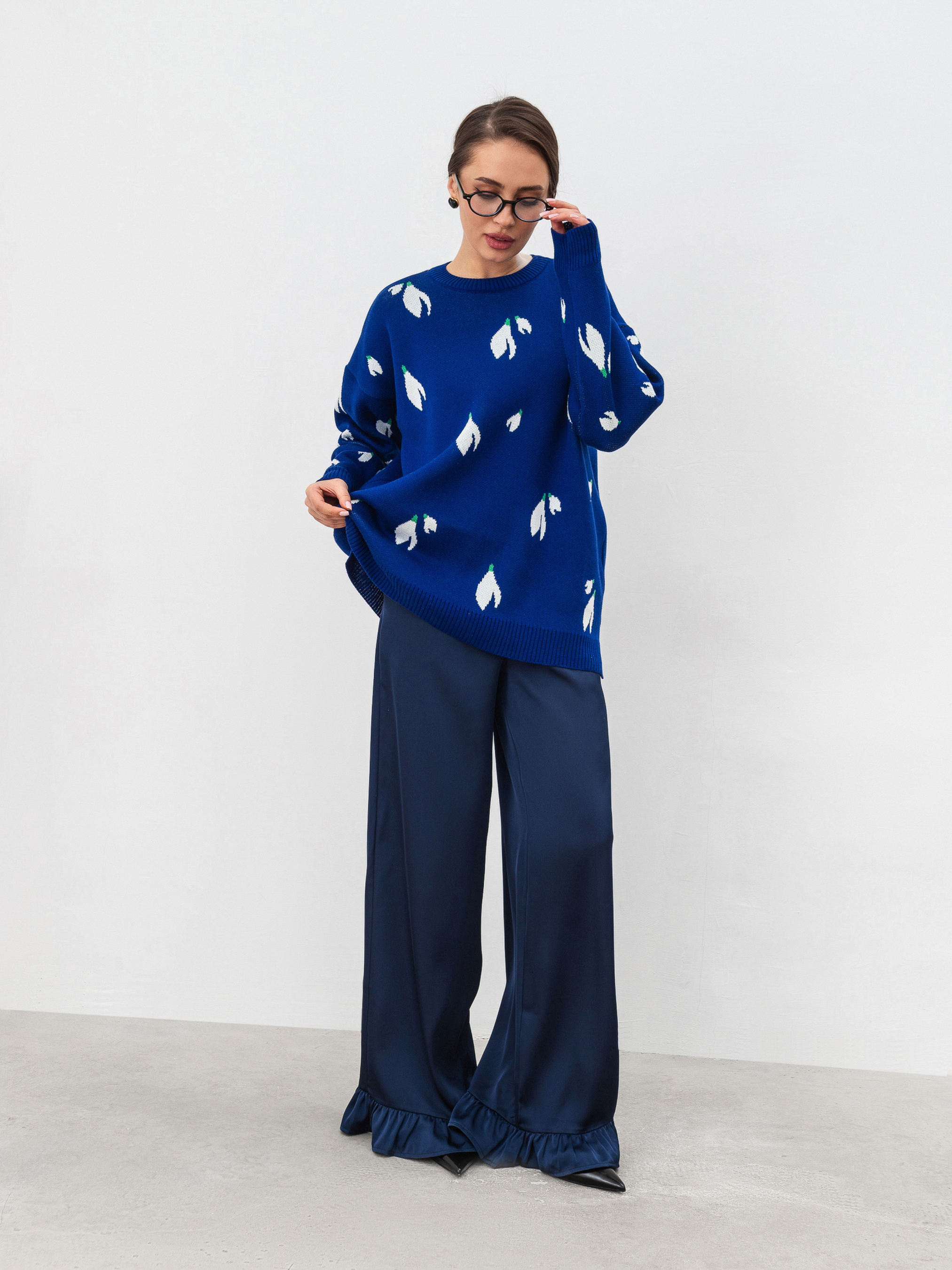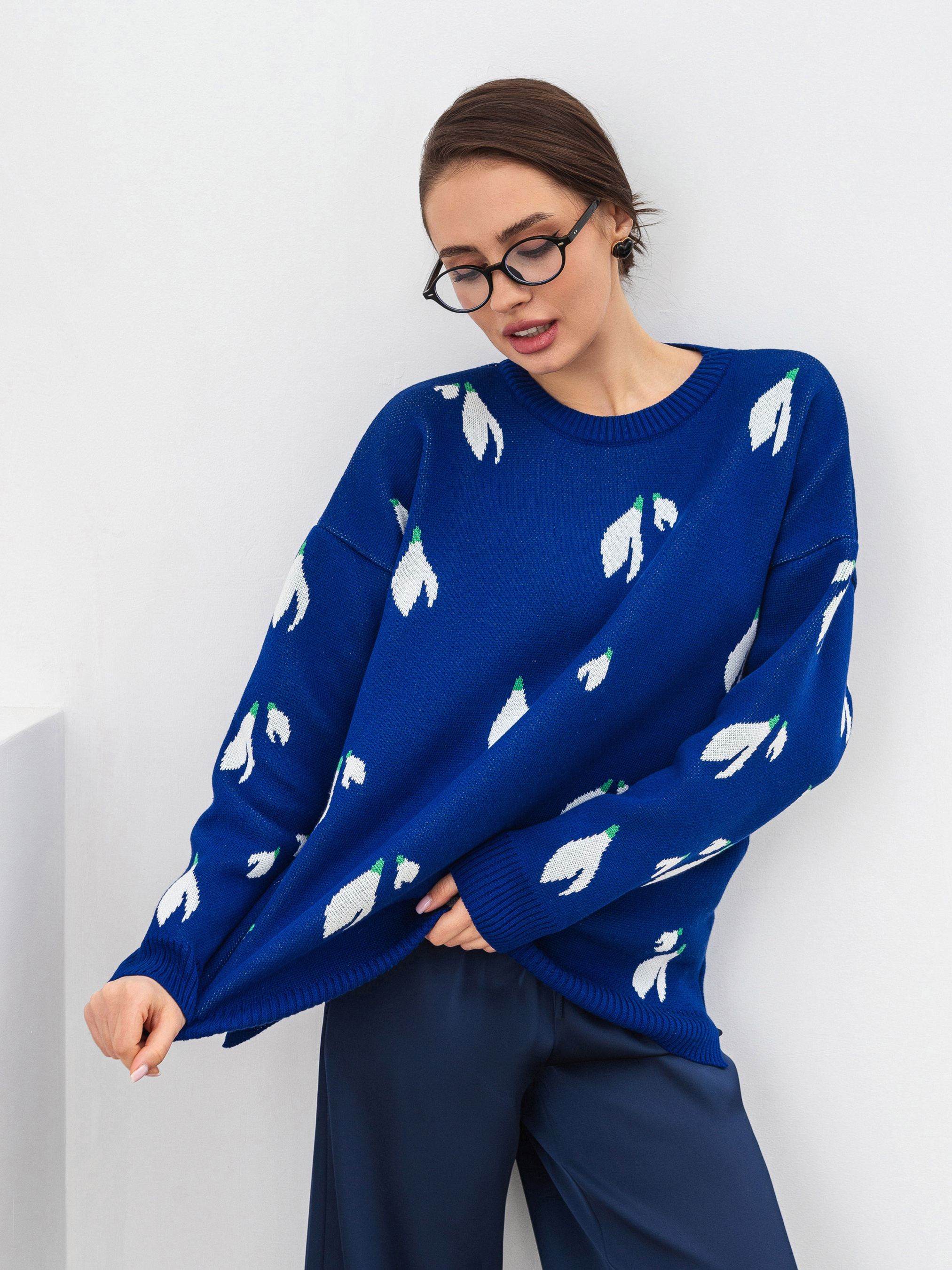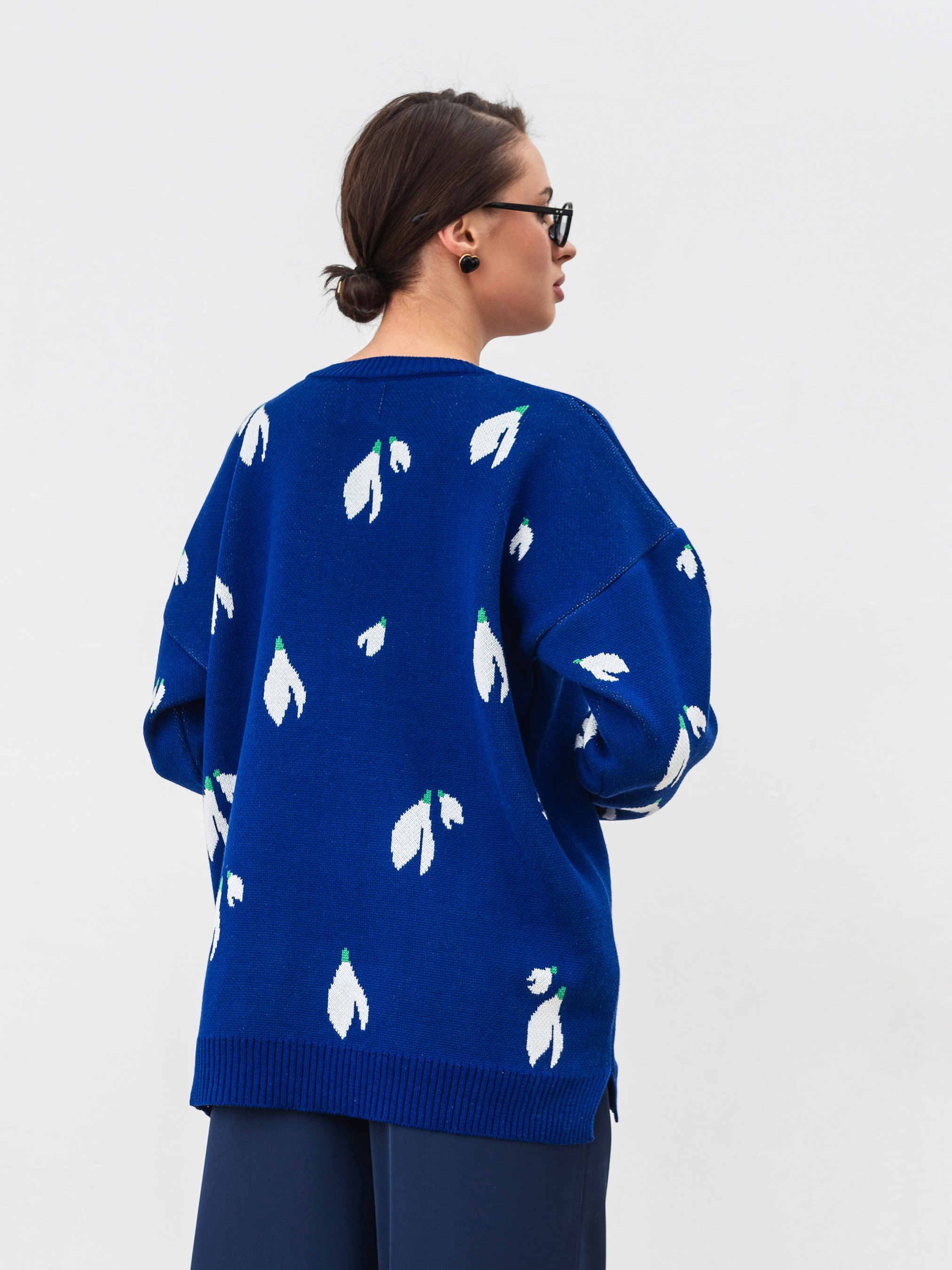 Трендовий светр вільного силуету з квітковим принтом. Модель виготовлена з щільної в язки, яка містить у складі бавовну. Принт маленькі квіти підсніжники. Склад: 50% бавовна 50% акрил. Базовий светр на зимовий сезон, який можна поєднати з джинсами чи штанами у класичному стилі. Довжина по спині : 66 см Довжина рукава : 46 см Напівобхват грудей : 58 см Плечі : 61 см Напівобхват талії : 57 см