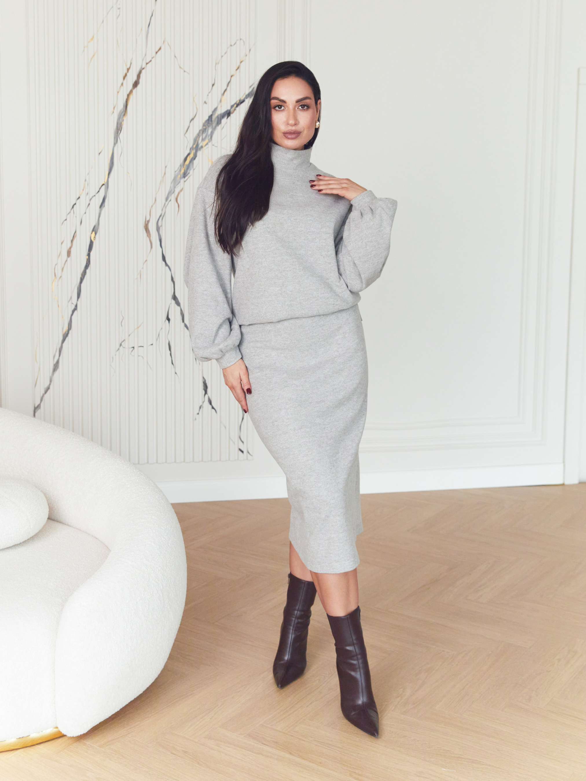 Кофта Seventeen 2382. | Winter 25 part 2 Ця кофта — гармонія комфорту і сучасного дизайну для міжсезоння. Легко поєднується з різними стилями, додаючи образу об'єму і динаміки завдяки особливим деталям. Фасон Прямий, вільний силует забезпечує свободу рухів і комфорт протягом дня. Спущене плече створює розслаблений вигляд, а пишні рукави додають модного акценту та легкості образу. Розрізи збоку забезпечують додаткову зручність і повітропроникність. Комір-стійка підкреслює витонченість ліній шиї. Матеріал Виконана з щільного в’язаного трикотажу, кофта зберігає форму і тепло, при цьому залишається приємною до тіла. Матеріал ідеально підходить для осінньо-весняного сезону, забезпечуючи комфорт і стиль. Деталі Пишний рукав і розрізи — це тонкий дизайнерський хід, що оживляє модель, роблячи її яскравим акцентом базового гардеробу. Довжина виробу та рукава S–M: довжина виробу — 67 см, довжина рукава — 56 см L–XL: довжина виробу — 70 см, довжина рукава — 56 см 2XL–3XL: довжина виробу — 72 см, довжина рукава — 56 см Догляд Рекомендовано ручне прання до 30° для збереження якості трикотажу та форми виробу. Розмірна сітка S–M: обхват грудей 84–88 см, талії 68–72 см, стегон 92–96 см L–XL: обхват грудей 92–96 см, талії 76–81 см, стегон 100–105 см 2XL–3XL: обхват грудей 100–105 см, талії 86–91 см, стегон 110–115 см