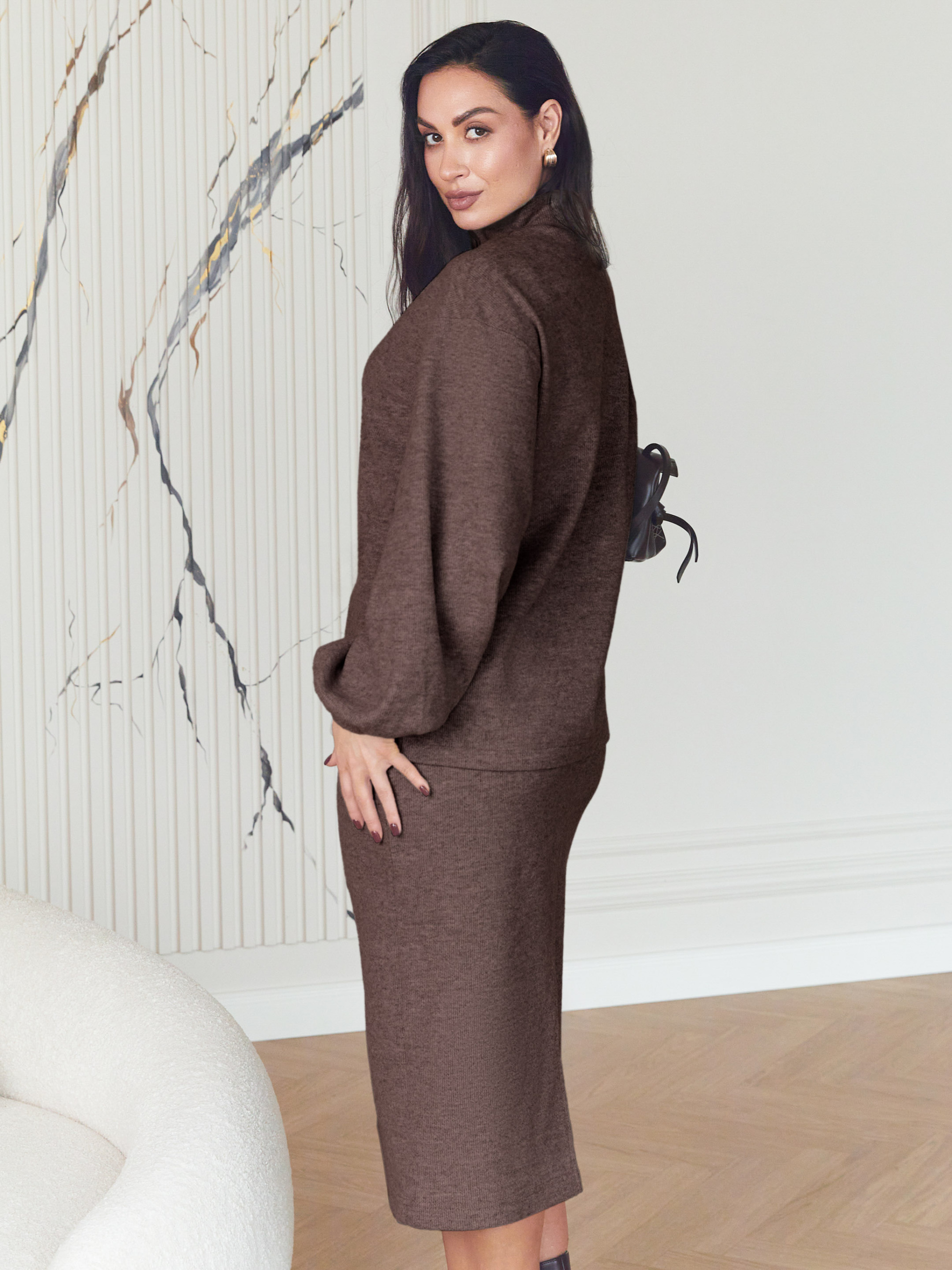 Кофта Seventeen 2382. | Winter 25 part 2 Ця кофта — гармонія комфорту і сучасного дизайну для міжсезоння. Легко поєднується з різними стилями, додаючи образу об'єму і динаміки завдяки особливим деталям. Фасон Прямий, вільний силует забезпечує свободу рухів і комфорт протягом дня. Спущене плече створює розслаблений вигляд, а пишні рукави додають модного акценту та легкості образу. Розрізи збоку забезпечують додаткову зручність і повітропроникність. Комір-стійка підкреслює витонченість ліній шиї. Матеріал Виконана з щільного в’язаного трикотажу, кофта зберігає форму і тепло, при цьому залишається приємною до тіла. Матеріал ідеально підходить для осінньо-весняного сезону, забезпечуючи комфорт і стиль. Деталі Пишний рукав і розрізи — це тонкий дизайнерський хід, що оживляє модель, роблячи її яскравим акцентом базового гардеробу. Довжина виробу та рукава S–M: довжина виробу — 67 см, довжина рукава — 56 см L–XL: довжина виробу — 70 см, довжина рукава — 56 см 2XL–3XL: довжина виробу — 72 см, довжина рукава — 56 см Догляд Рекомендовано ручне прання до 30° для збереження якості трикотажу та форми виробу. Розмірна сітка S–M: обхват грудей 84–88 см, талії 68–72 см, стегон 92–96 см L–XL: обхват грудей 92–96 см, талії 76–81 см, стегон 100–105 см 2XL–3XL: обхват грудей 100–105 см, талії 86–91 см, стегон 110–115 см