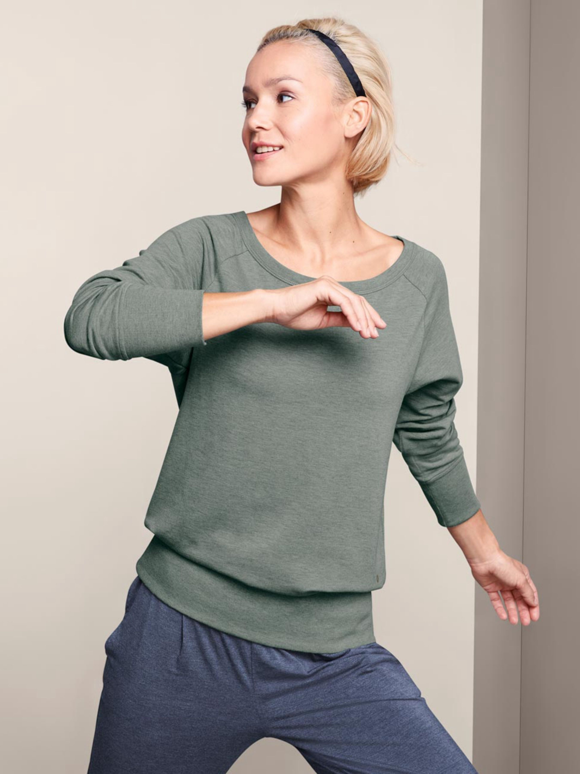 Жіноча спортивна толстовка Tchibo, сіро-зелена Опис: Комфортна толстовка з м’якої, струмливої тканини з віскозою, приємна на дотик завдяки щіткованій внутрішній стороні. Має глянцевий принт на подолі та зручні ребристі манжети. Ідеально підходить як для спорту (пілатес, фітнес), так і для повсякденного носіння. Еластан у складі забезпечує свободу рухів і збереження форми. Деталі: Зручний крій із широкими ребристими манжетами Особливо м’яка струмлива якість із віскозою М’яко щіткована внутрішня частина З еластаном: зберігає форму, забезпечує повну свободу рухів Глянцевий принт на подолі Підходить для пілатесу та інших видів спорту Перевірено на наявність шкідливих речовин – зовнішніми акредитованими інститутами Звичайна посадка Колір: сіро-зелений Склад: 63% поліестер, 32% віскоза (від LENZING™), 5% еластан Розмір: Європейський S / Український 44–46 ПОГ (півобхват грудей): 53 см Довжина рукава: 66 см Загальна довжина: 73 см Примітка: Одяг бренду Tchibo зазвичай не має паперових етикеток. У більшості випадків внутрішні бірки зі складом тканини, назвою бренду або розміром зрізані частково або повністю.