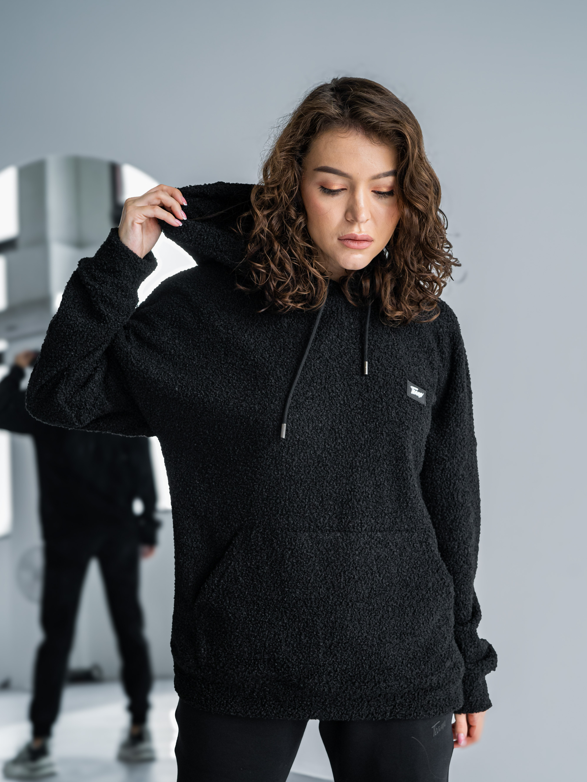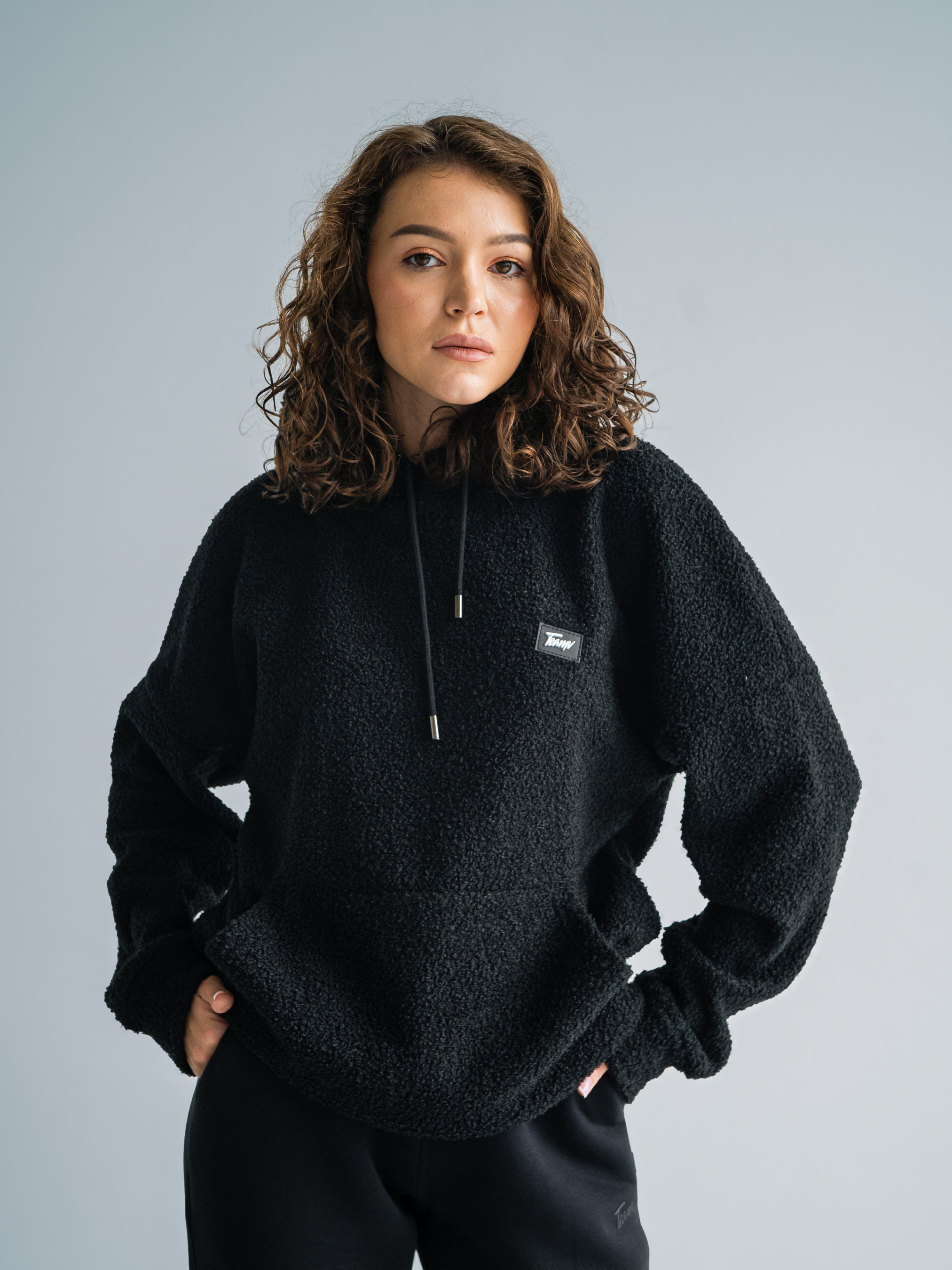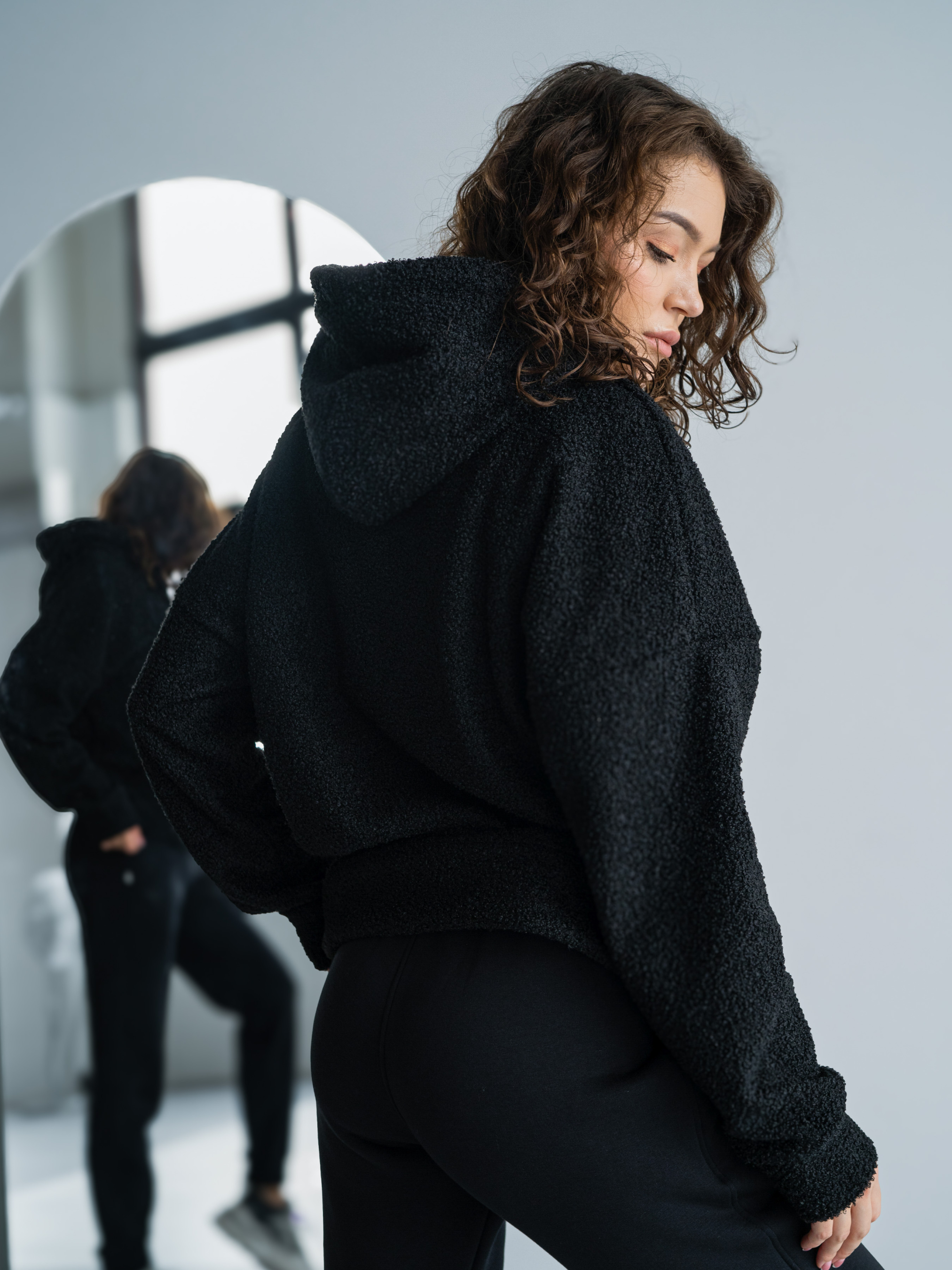 Тепла жіноча толстовка баранчик. Худі великого розміру у стилі оверсайз з подвійним капюшоном і спущеним плечовим швом. Теплий Худі виконаний з двосторонньої тканини: Преміальна вовняна тканина букле з м'яким велюром на вивороті.