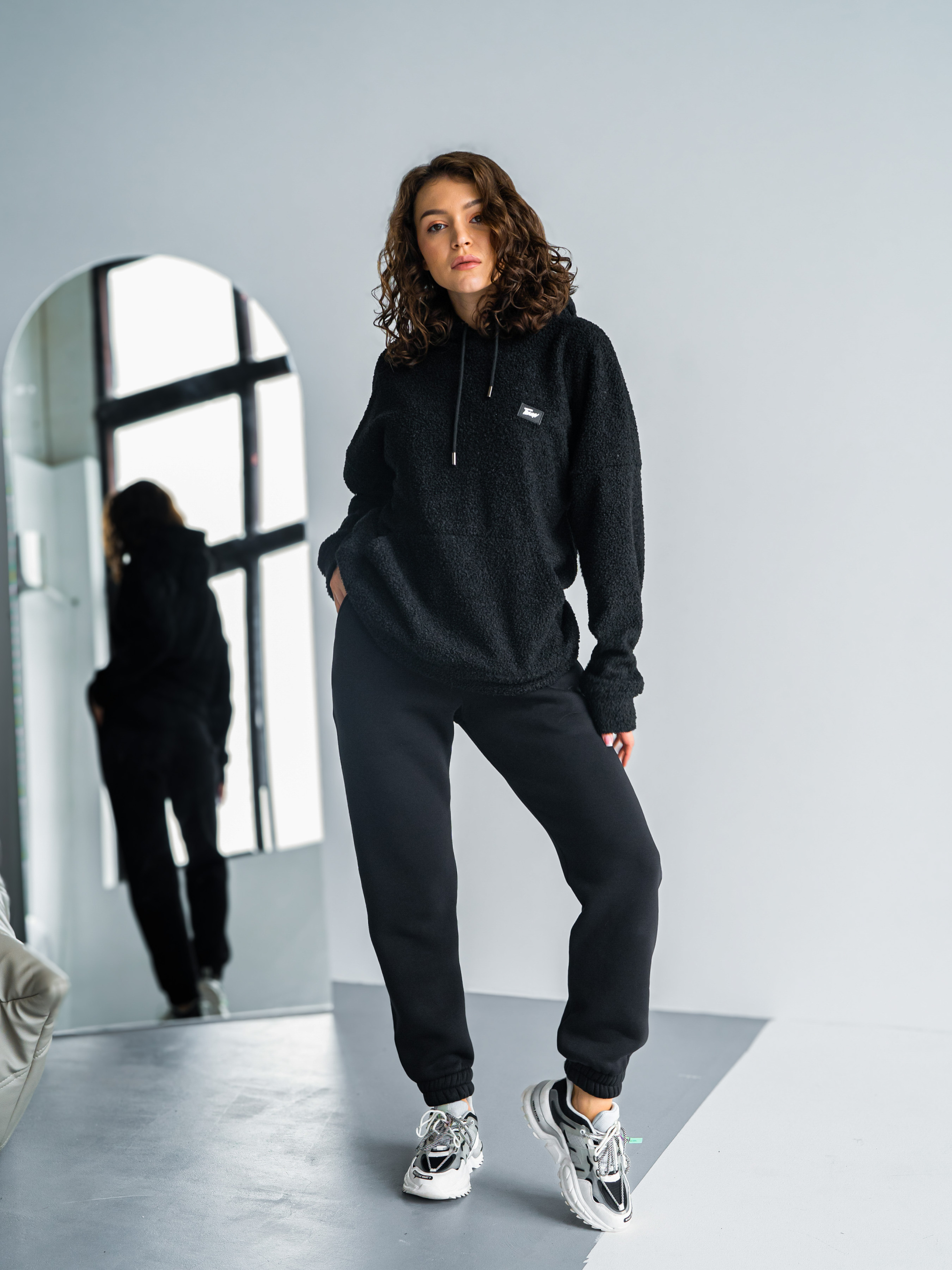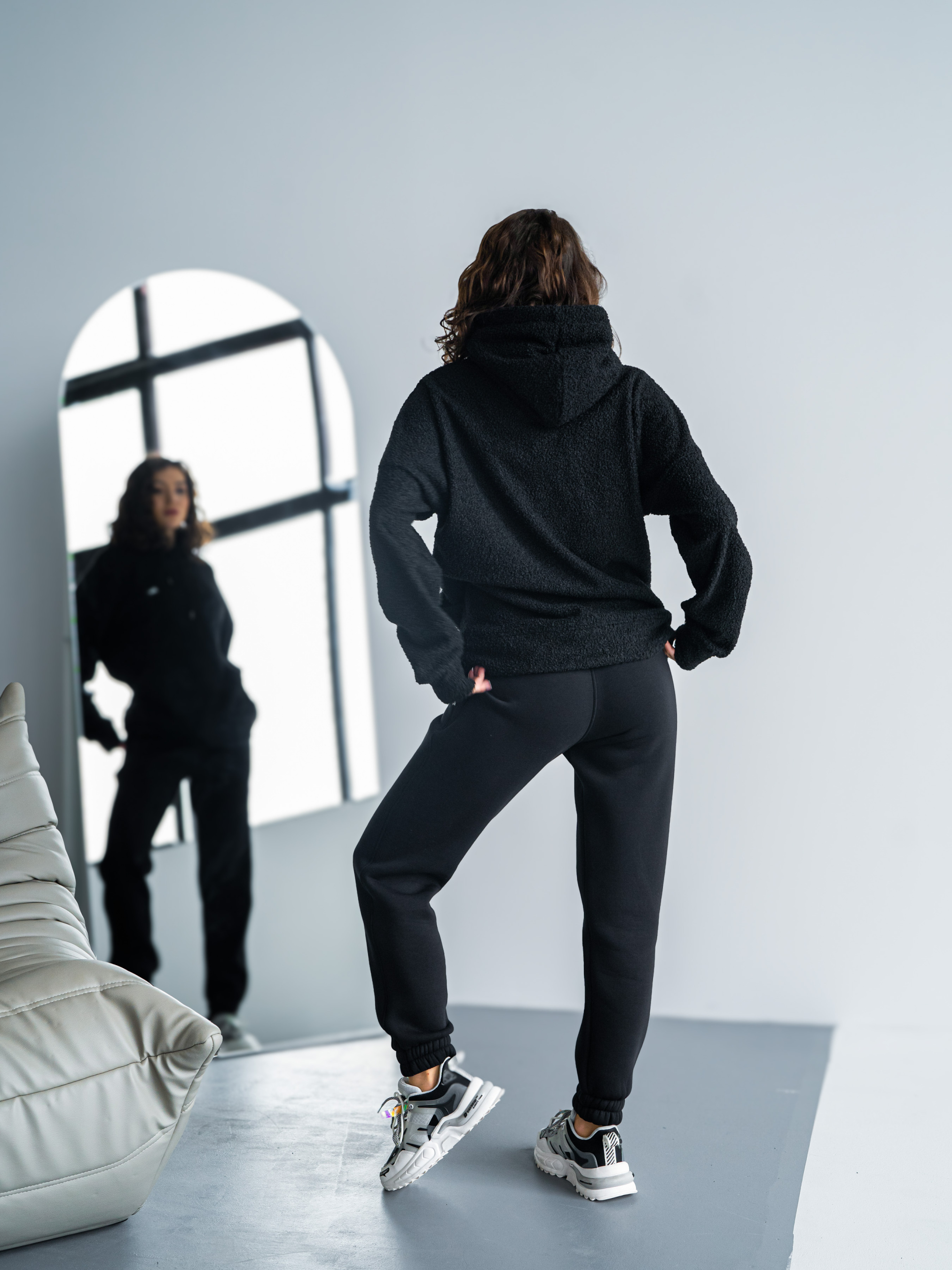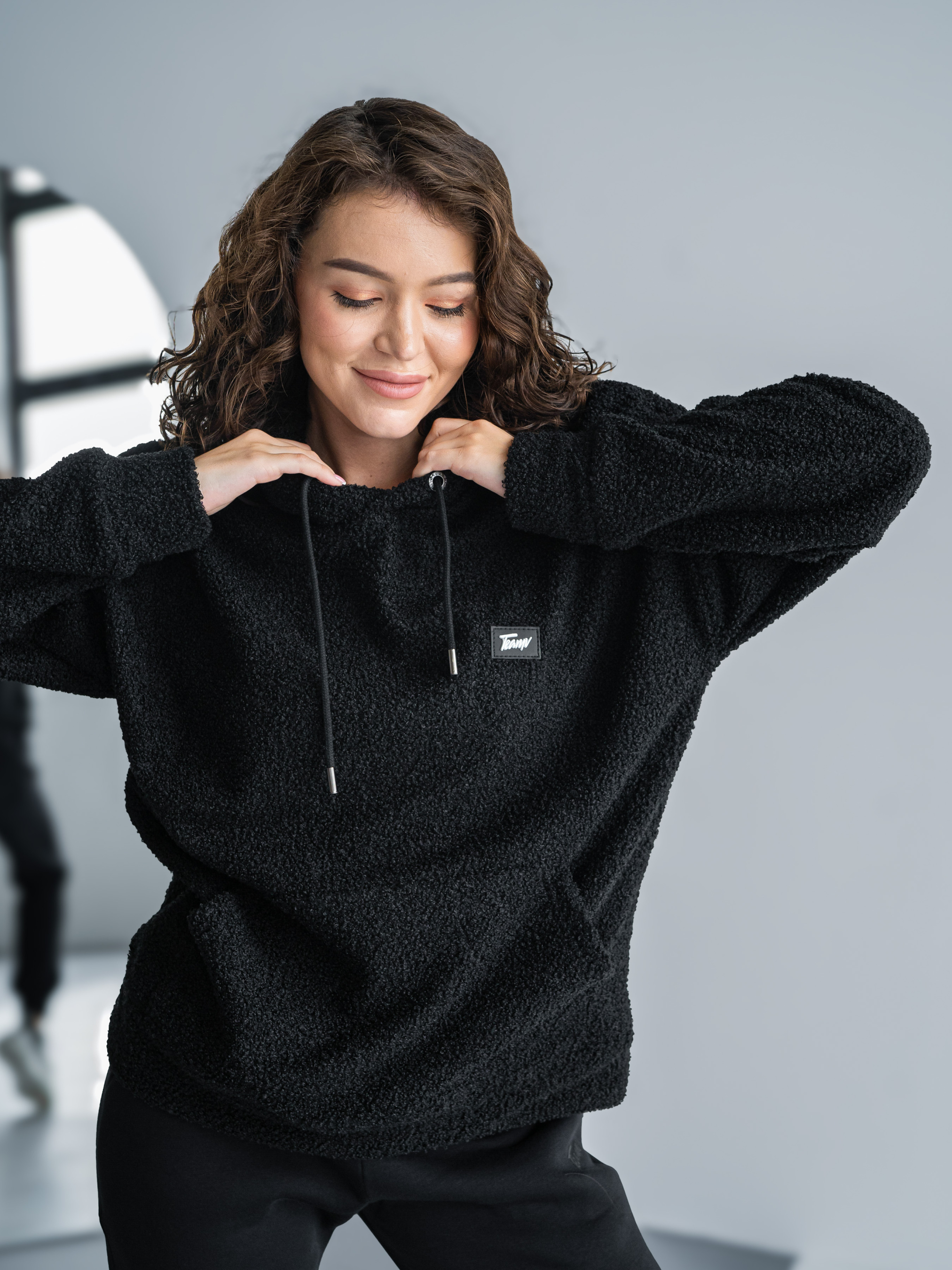 Тепла жіноча толстовка баранчик. Худі великого розміру у стилі оверсайз з подвійним капюшоном і спущеним плечовим швом. Теплий Худі виконаний з двосторонньої тканини: Преміальна вовняна тканина букле з м'яким велюром на вивороті.