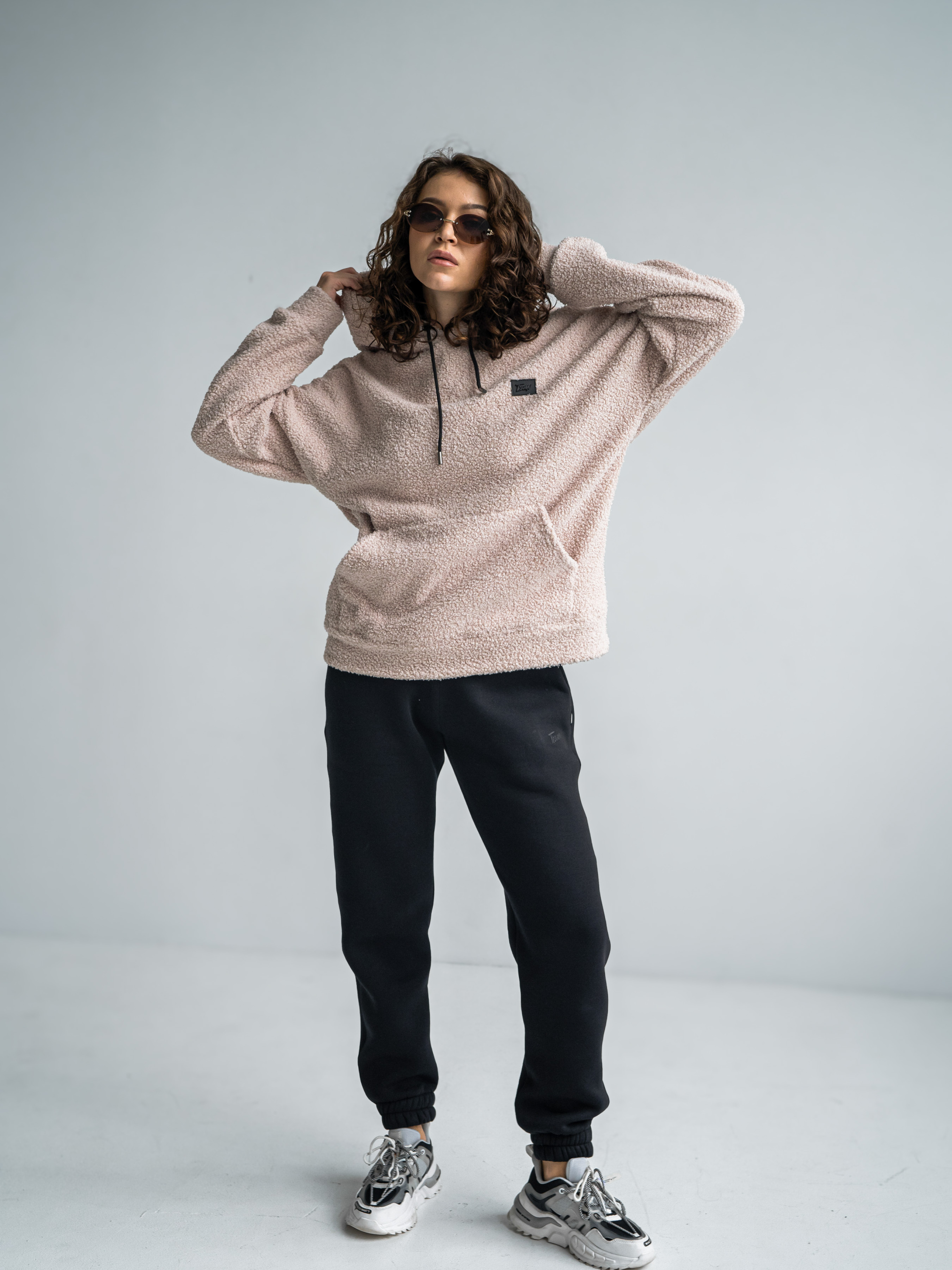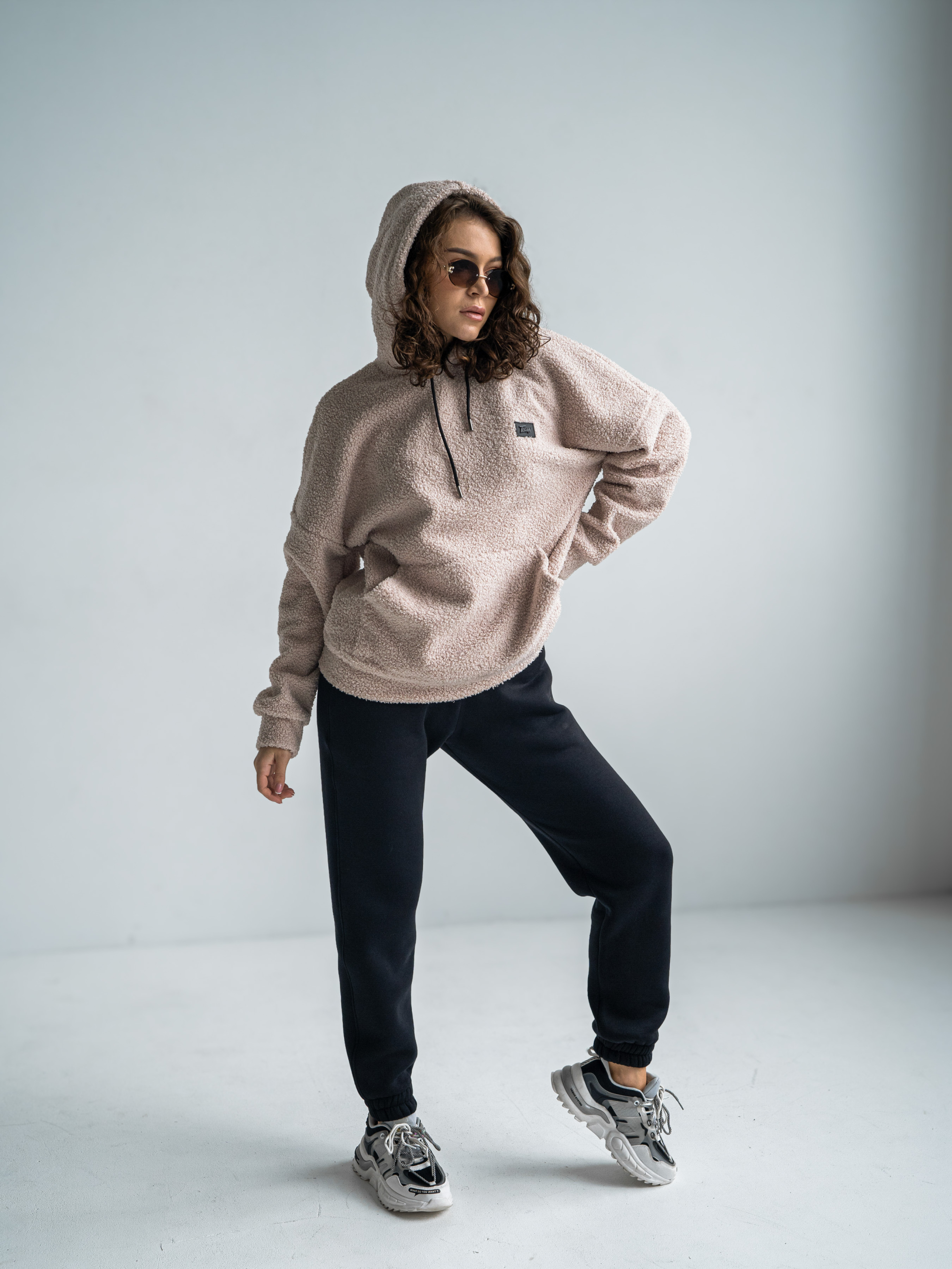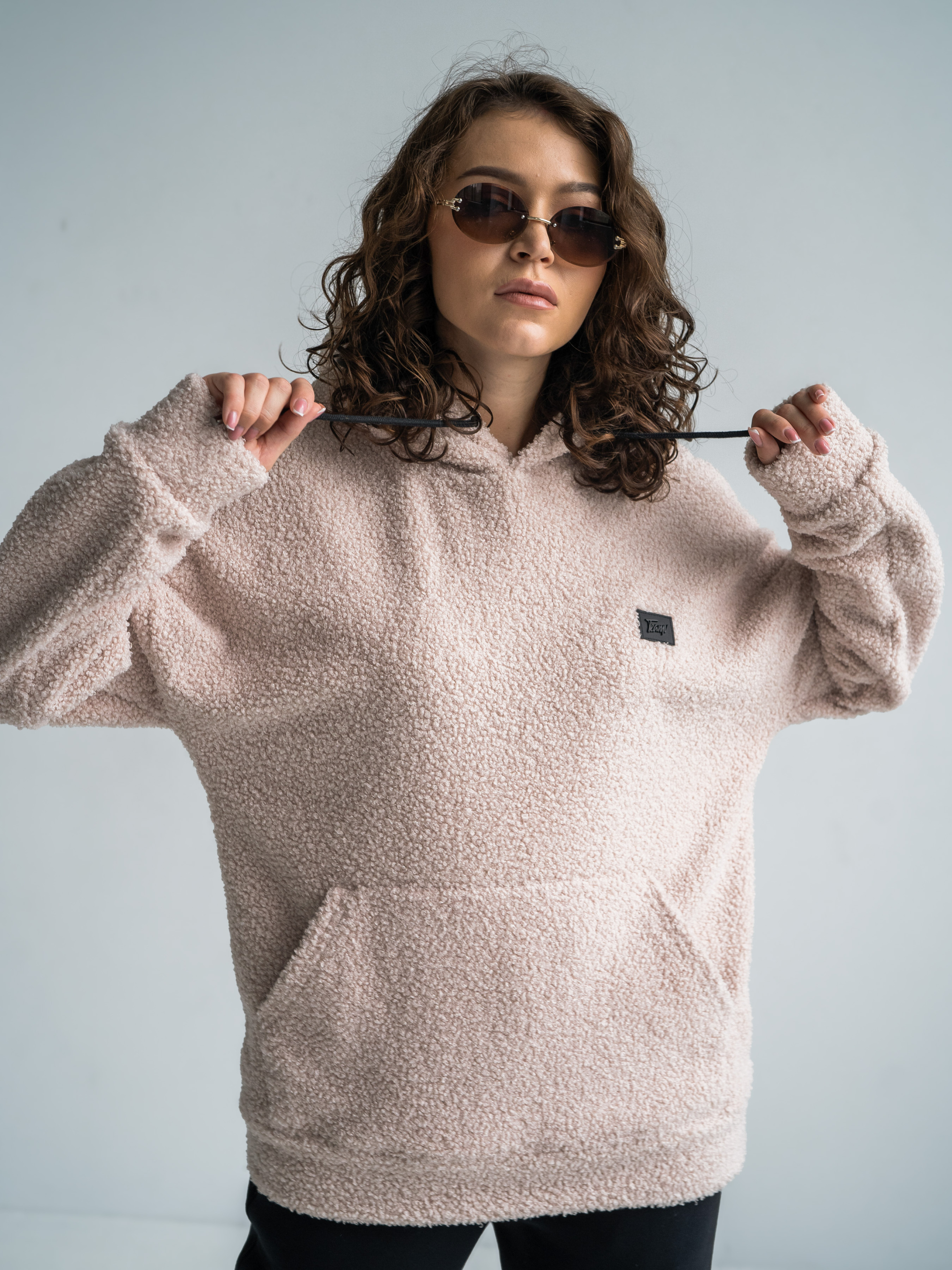 Тепла жіноча толстовка баранчик. Худі великого розміру у стилі оверсайз з подвійним капюшоном і спущеним плечовим швом. Теплий Худі виконаний з двосторонньої тканини: Преміальна вовняна тканина букле з м'яким велюром на вивороті.