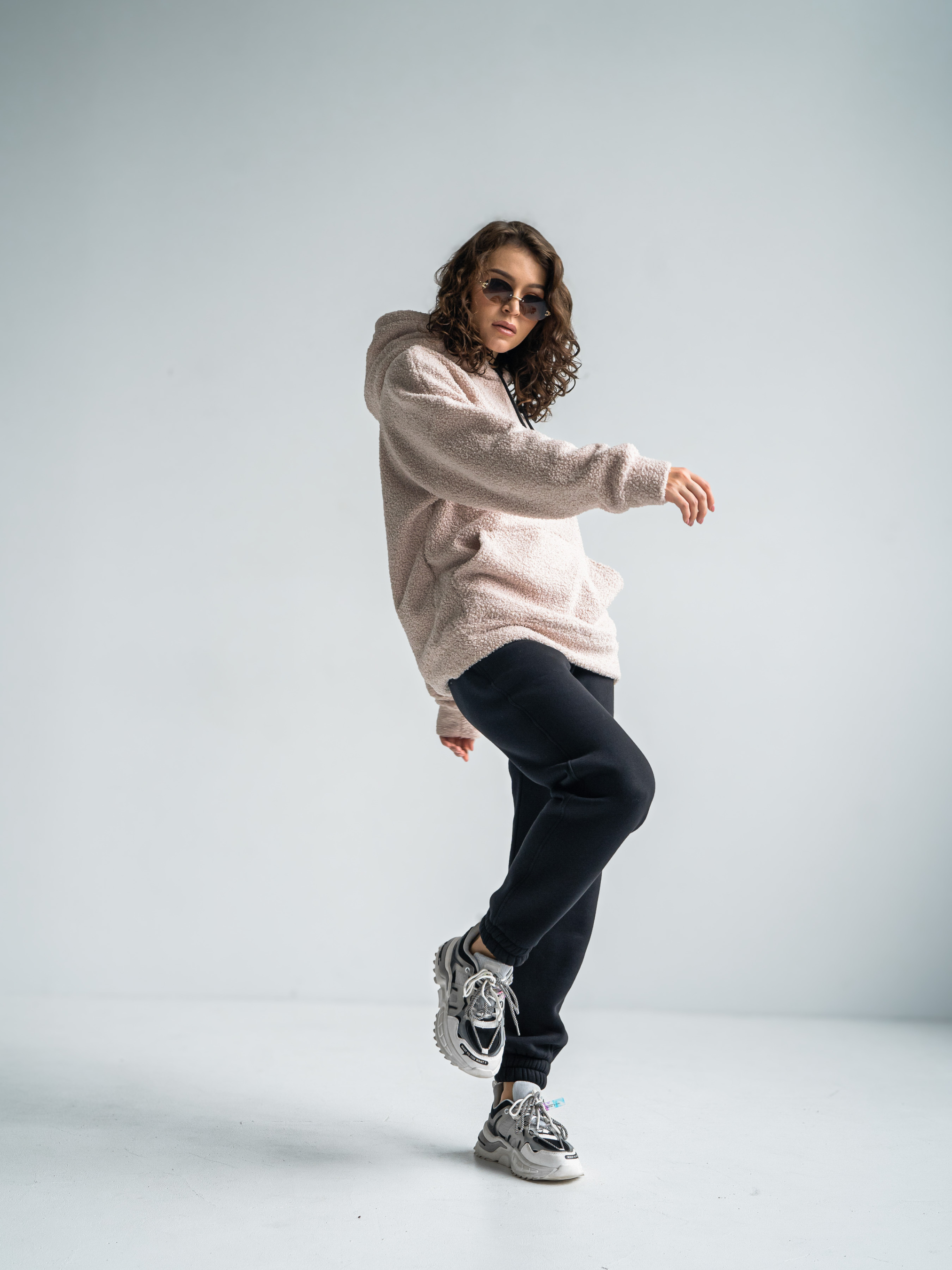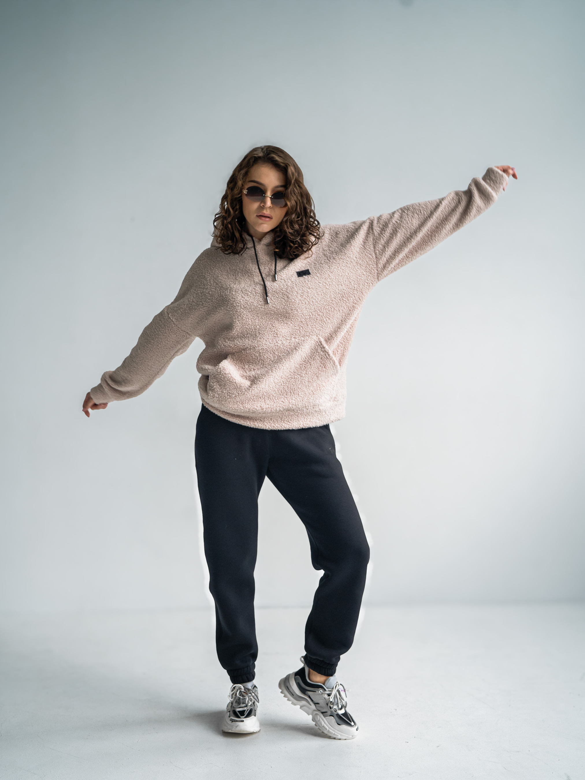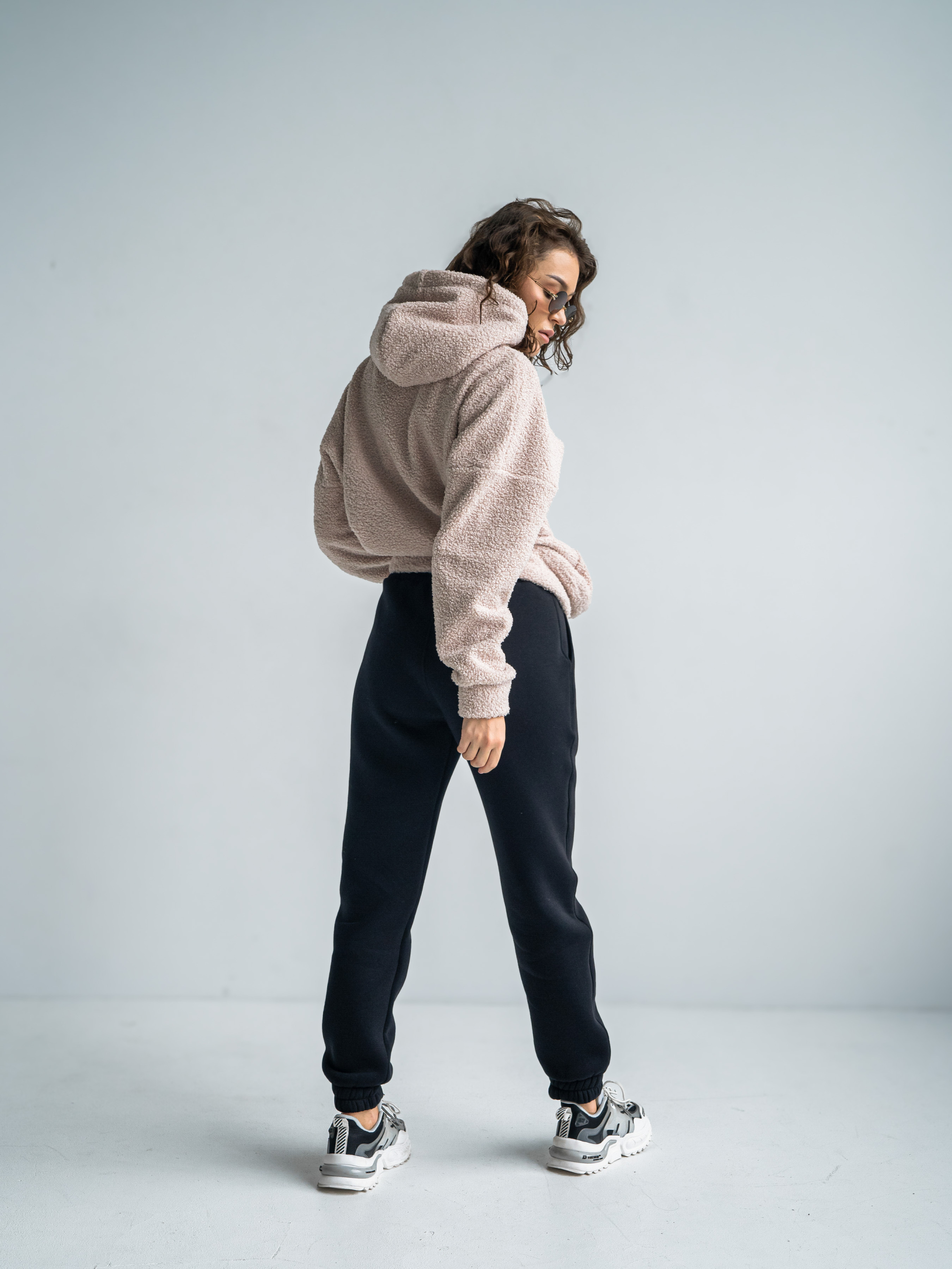 Тепла жіноча толстовка баранчик. Худі великого розміру у стилі оверсайз з подвійним капюшоном і спущеним плечовим швом. Теплий Худі виконаний з двосторонньої тканини: Преміальна вовняна тканина букле з м'яким велюром на вивороті.