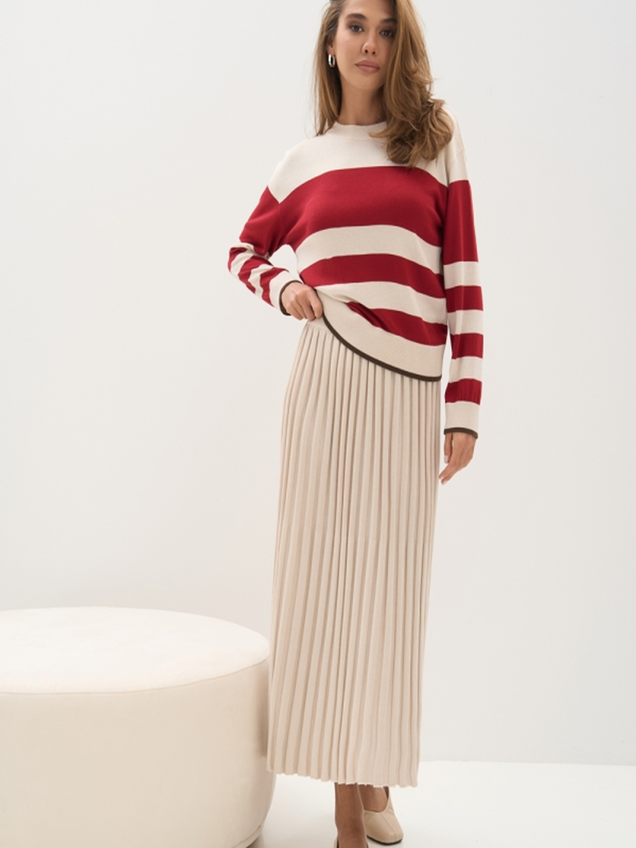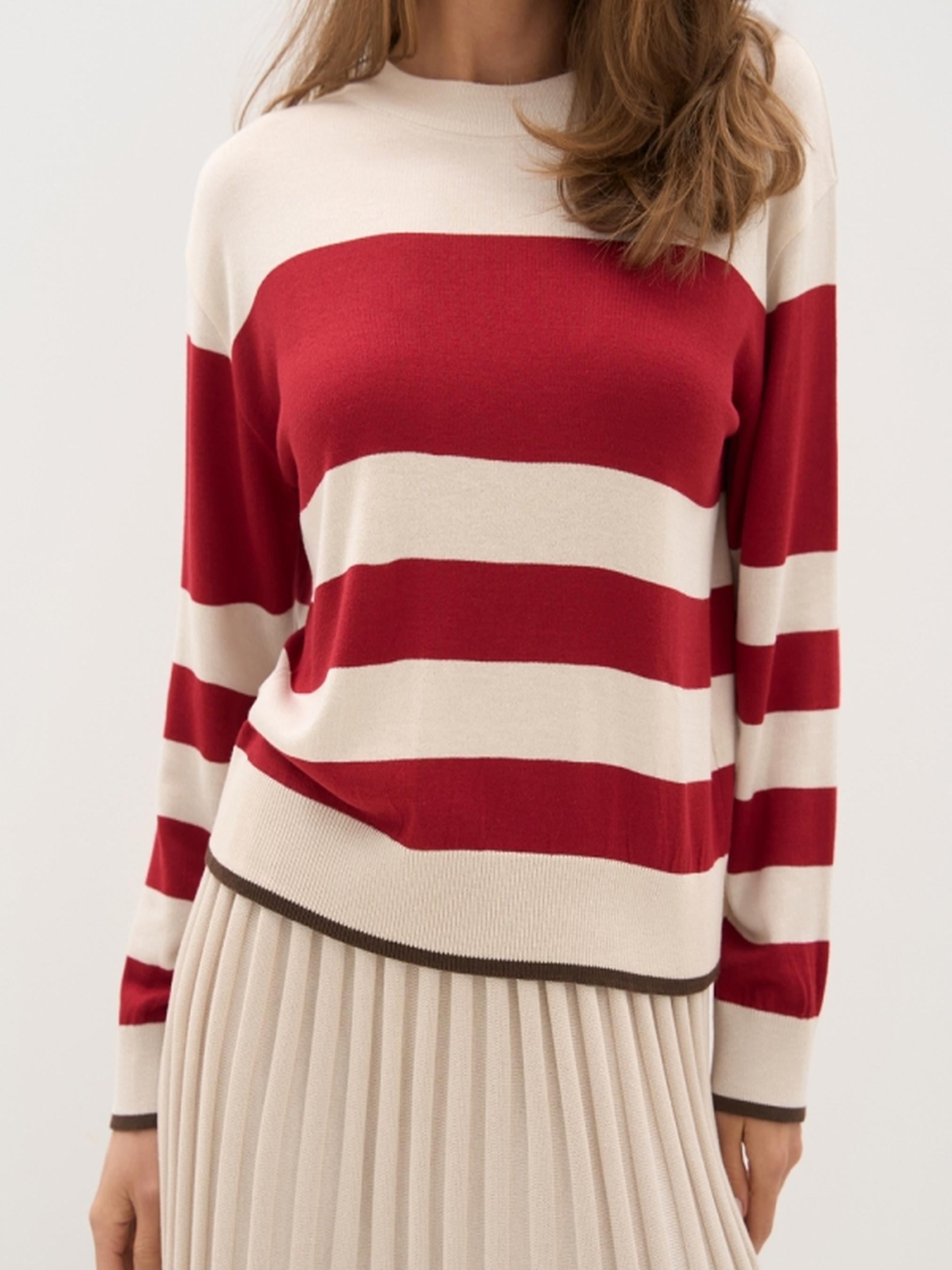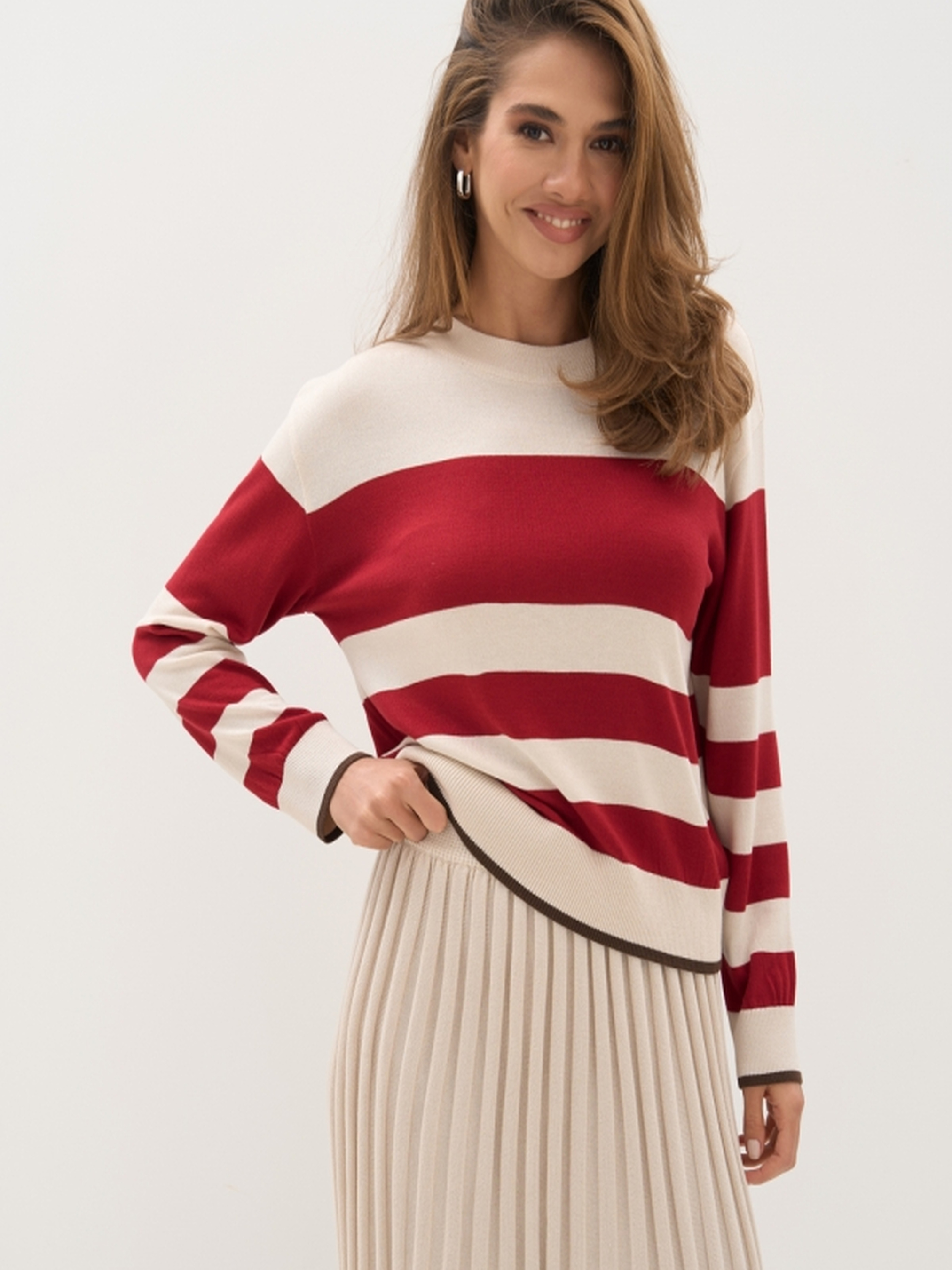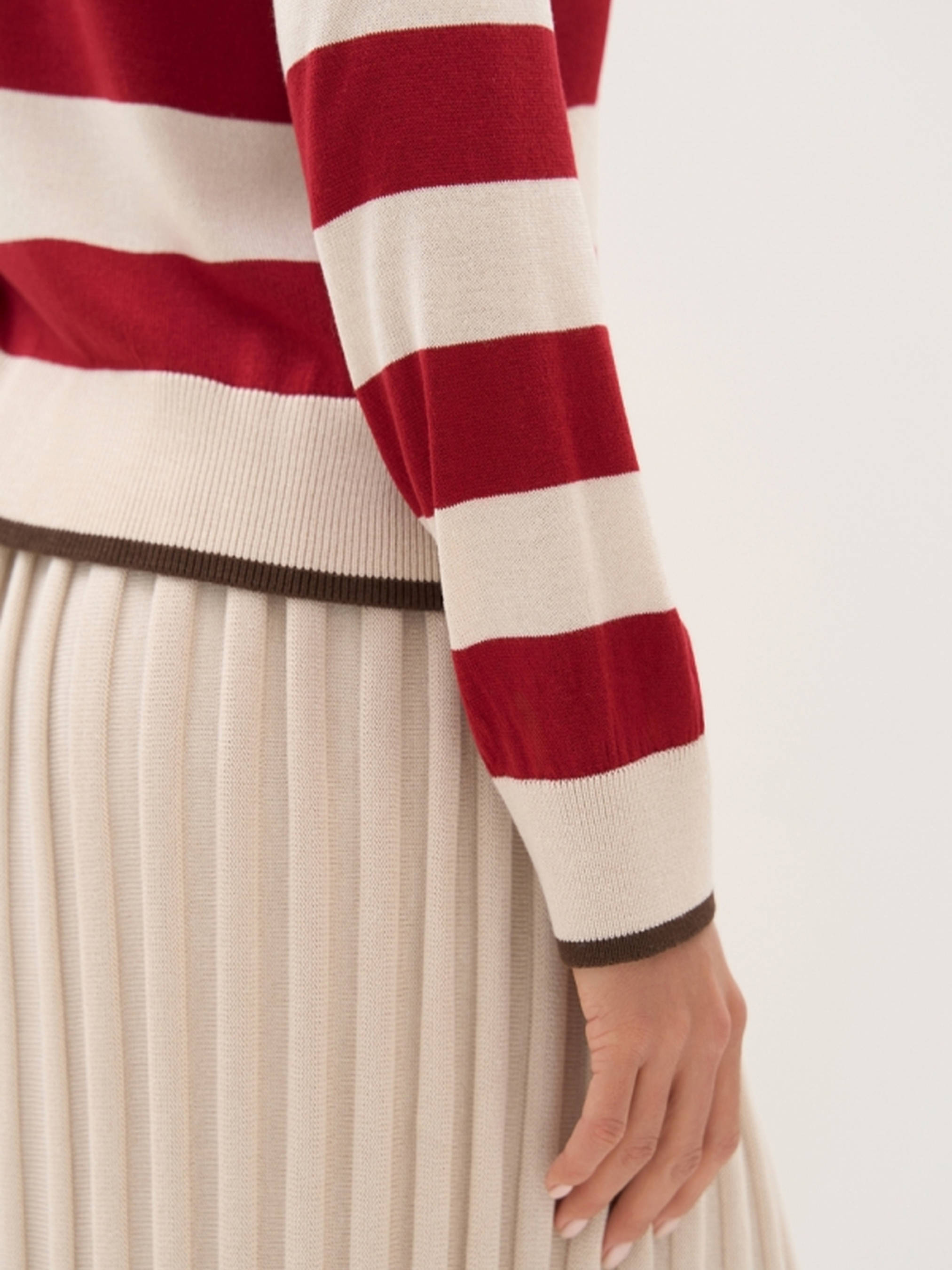 Жіночий джемпер у смужку з віскози — стильне та комфортне рішення для створення повсякденного чи офісного образу. Виготовлений з гладкої шовковистої віскозної пряжі, цей джемпер приємний на дотик, добре тягнеться та красиво драпується по фігурі. Модель має вільний силует та комфортну посадку, що пасує до будь-якого типу фігури. Стриманий колірний малюнок у смужку гармонійно продовжується на рукавах, створюючи цілісний і продуманий вигляд. Манжети на рукавах і по низу виробу, а також невисокий комір, додають завершеності образу. Джемпер чудово поєднується з джинсами, класичними штанами чи спідницями. Основні характеристики: • Довжина виробу: 55–58–61 см (+-2 см) • Ширина під проймою/в талії: 49–52–55 см (спокійно), 55–58–61 см (в розтягнутому стані) • Ширина по низу: 44–47–49 см (спокійно), 50–53–55 см (в розтягнутому стані) • Довжина рукава: 51 см • Ширина рукава по низу: 9,5–10–11 см • Ширина плеча: 13–14–15 см • Висота пройми: 22–24–26 см • Висота коміра: 4 см • Висота манжети: 6,5 см Переваги моделі: • Шовковиста віскоза — легка, дихаюча, гіпоалергенна • Вільний крій для зручності у щоденному носінні • Універсальний смугастий дизайн Цей джемпер стане базовим елементом гардероба, який легко адаптується під будь-який сезон і стиль.
