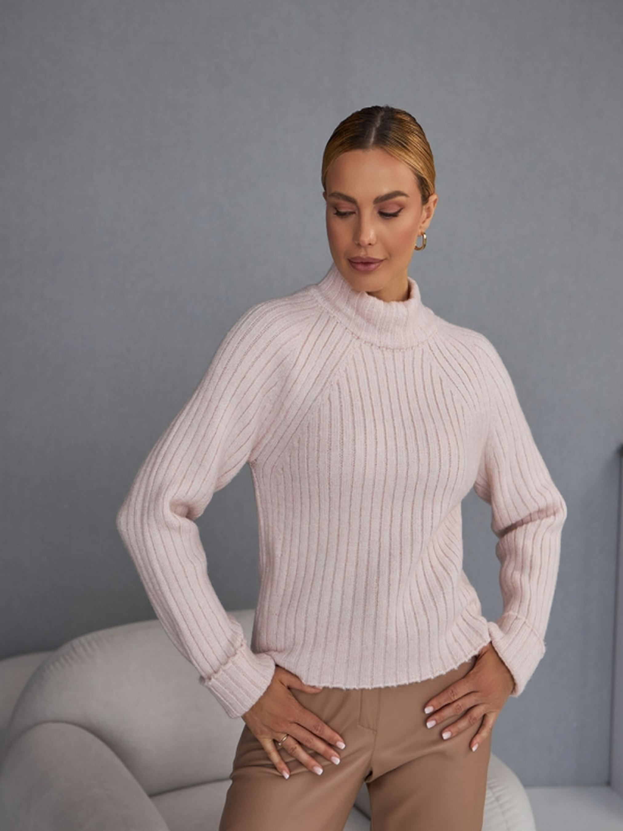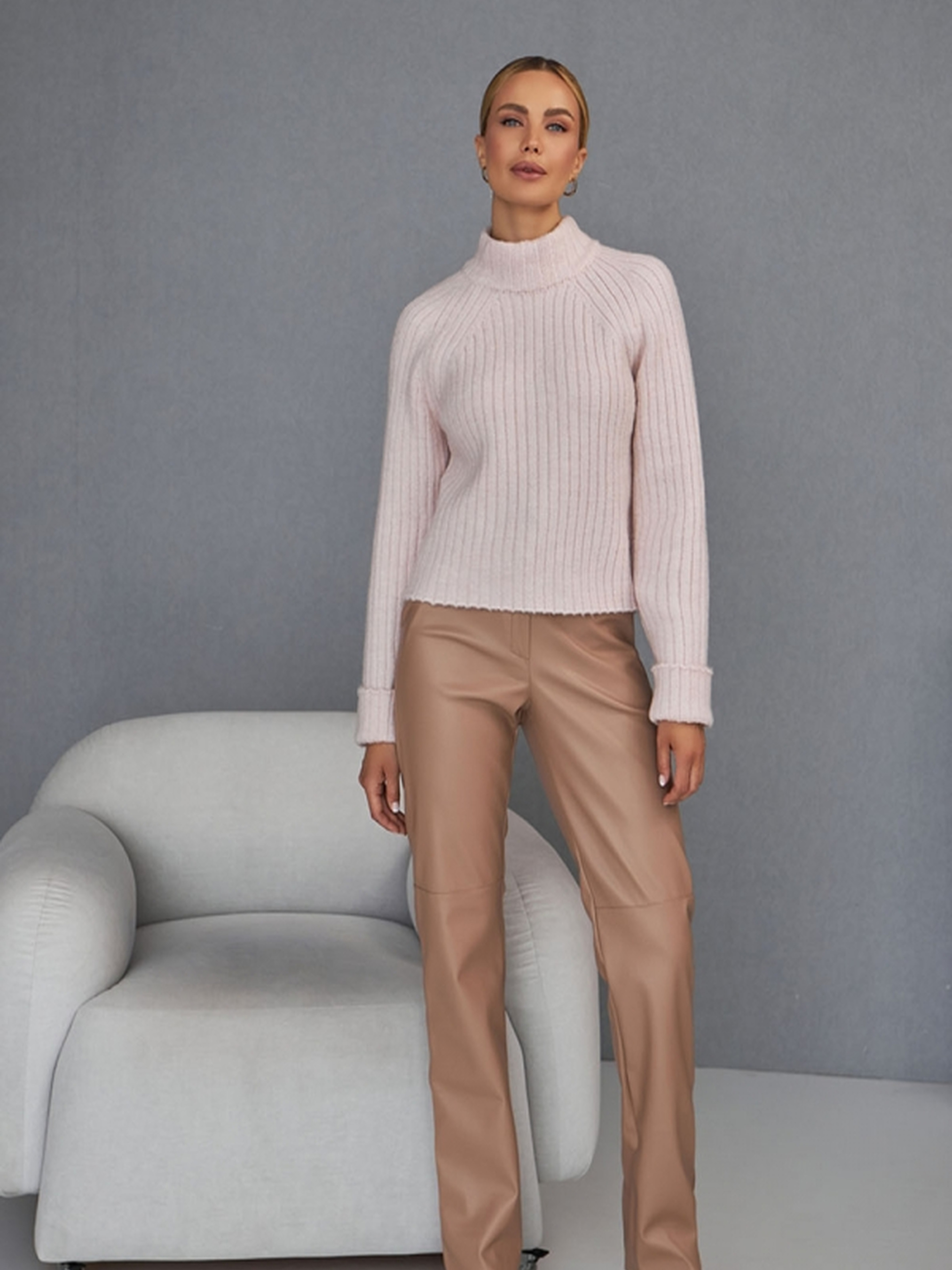 Укорочений жіночий светр із шерстю мериноса. Стильний і теплий укорочений светр із приємної на дотик пряжі з додаванням шерсті мериноса – ідеальний варіант для створення затишного та модного образу. Завдяки вертикальному в'язанню у широку резинку модель красиво сідає по фігурі. Характеристики:• Матеріал: тепла та м’яка пряжа з додаванням шерсті мериноса.• Дизайн: укорочений фасон, що чудово поєднується зі спідницями, джинсами та брюками із високою посадкою.• В’язка: широка резинка забезпечує гарну посадку та комфорт.• Комір: високий 7 см, додає елегантності та додаткового тепла.• Довжина светра: 53 см (+-2 см).• Ширина: в нерозтягнутому стані 43 см, у розтягнутому 50 см.• Довжина рукава: 76 см, подовжений рукав для стильного вигляду.• Висота пройми: 23 см. Жіночий укорочений светр із шерстю мериноса чудово підходить для осені та зими, зігріваючи у холодну погоду. Ідеальне доповнення до базового гардероба для стильних та комфортних образів.