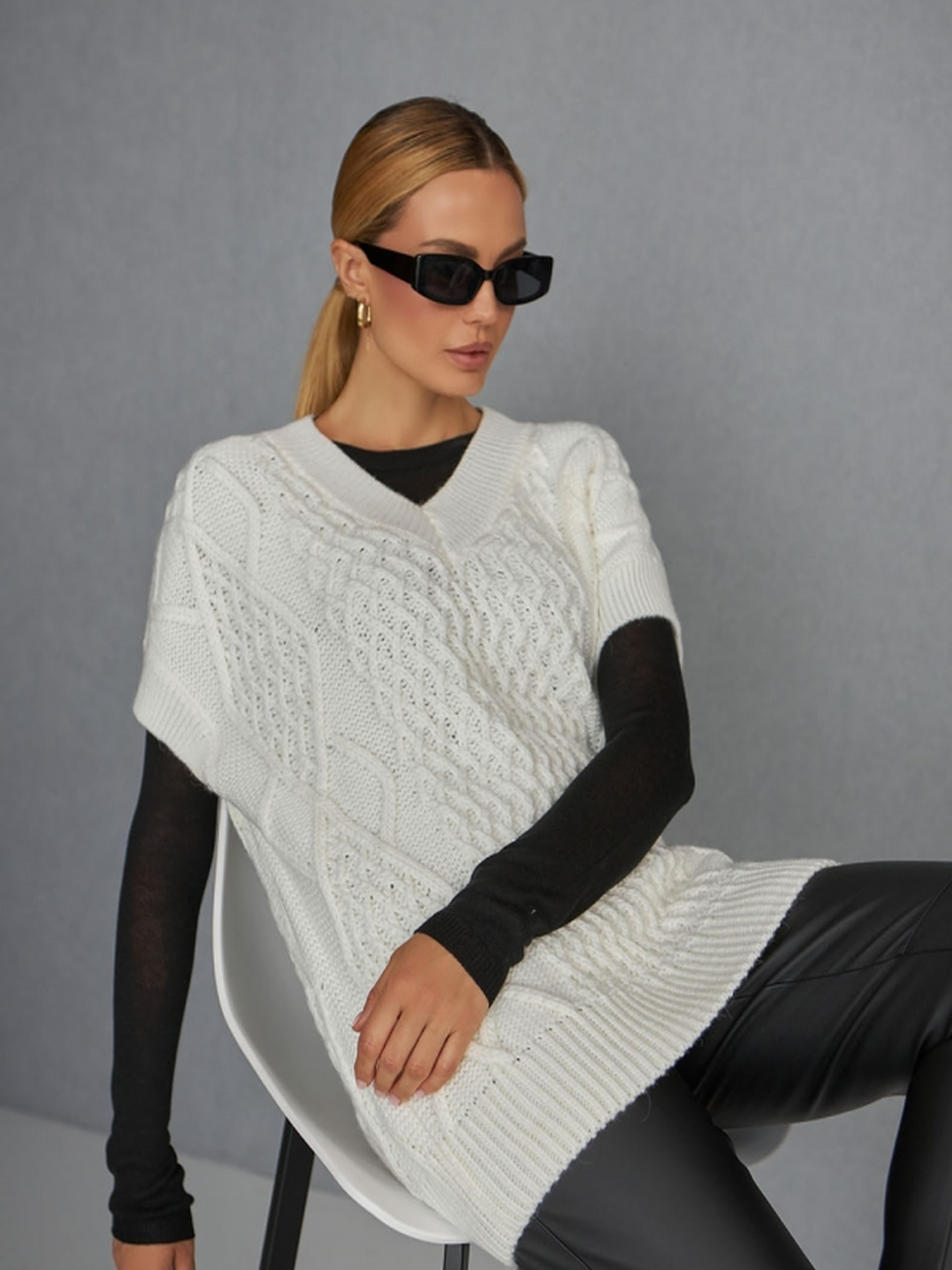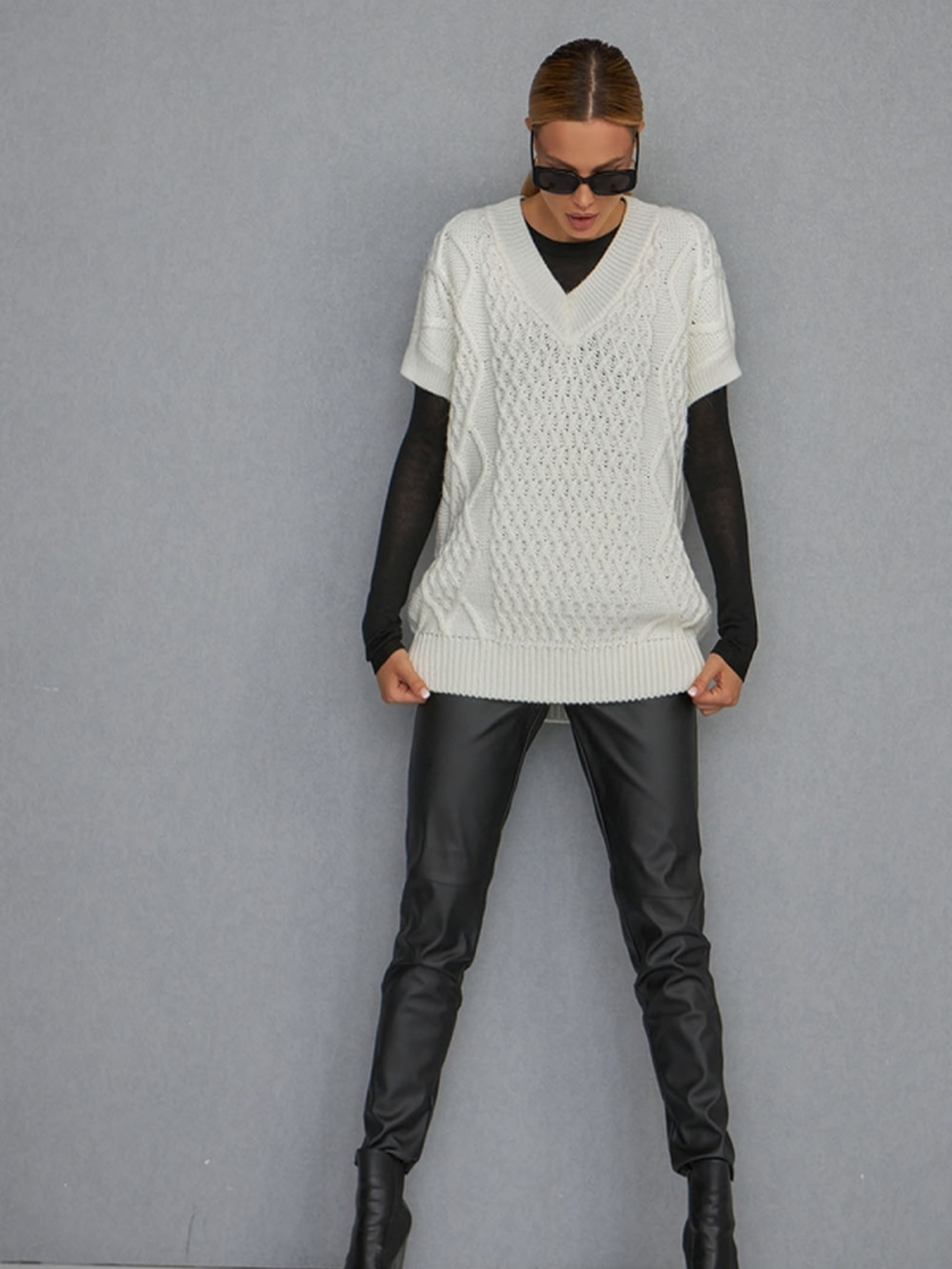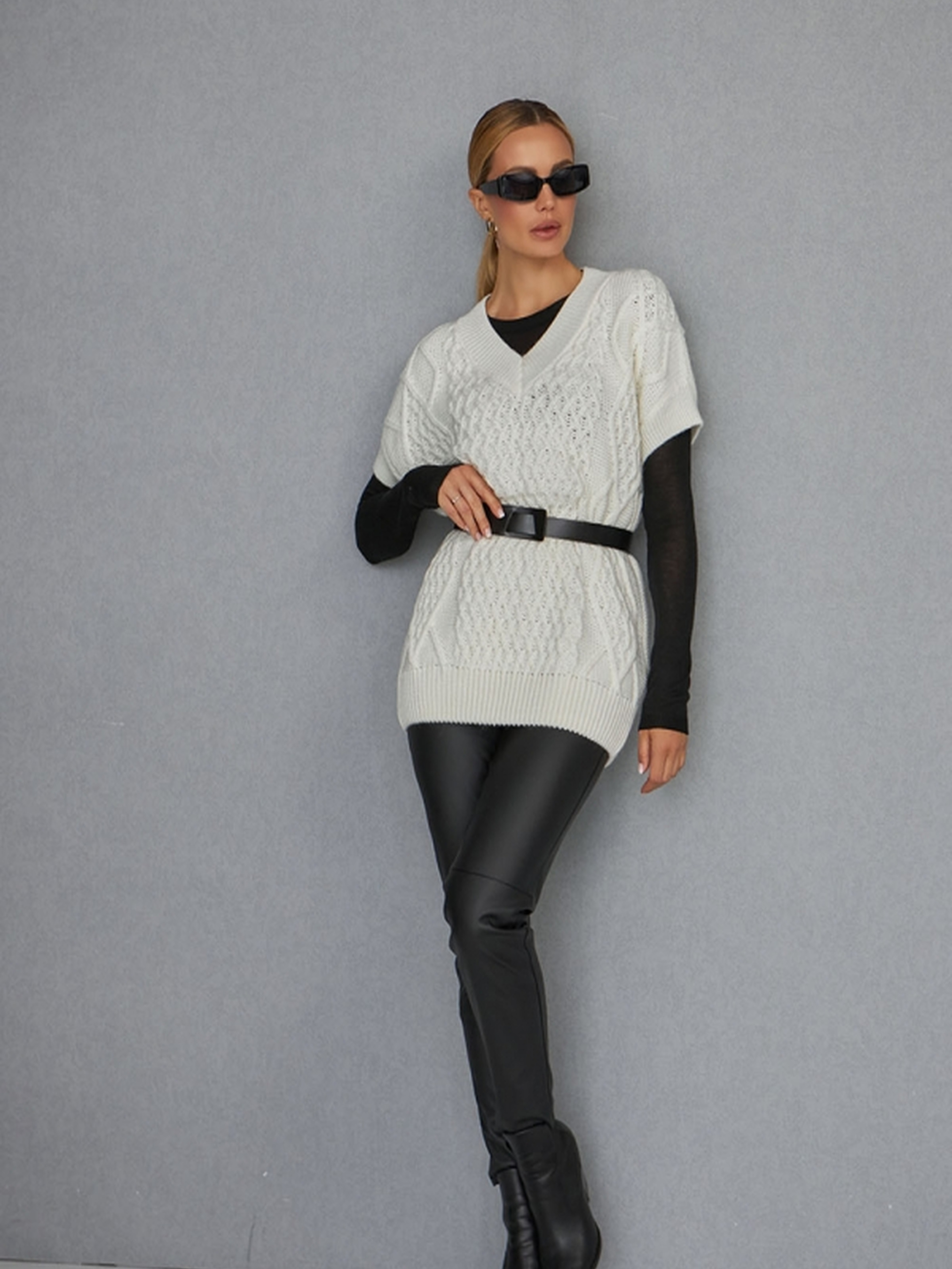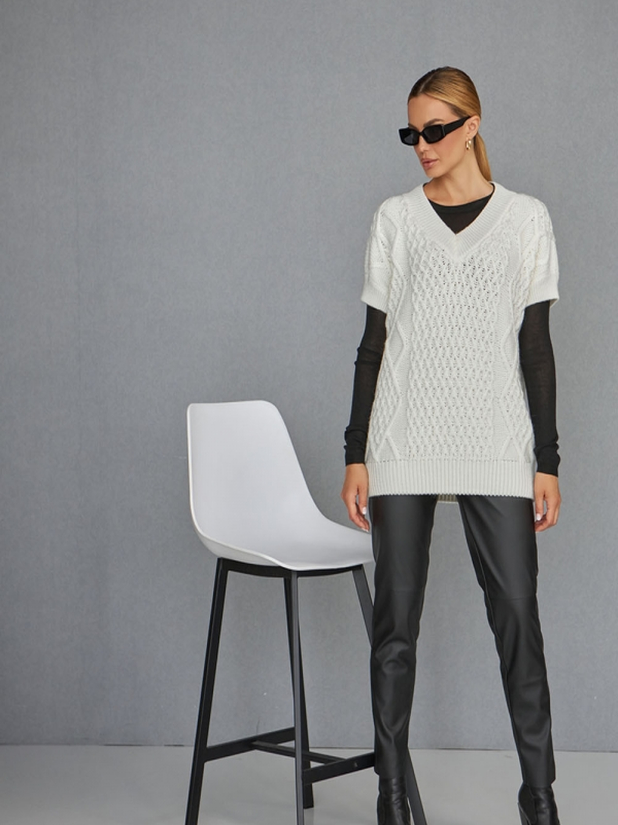 Стильний об'ємний жилет, виконаний з приємної на дотик напіввовняної пряжі середньої щільності, який можна носити як джемпер.• Затишна модель з закритими проймами та спущеною лінією плеча додає комфорту та легкості в носінні.• Високий V-подібний виріз горловини додає елегантності, а резинка на манжетах, окантовці горловини та по низу виробу підкреслює стиль.• Ідеально підходить для створення багатошарових образів на прохолодну погоду.• Відмінно поєднується з іншими елементами гардеробу, додаючи яскравий акцент до вашого вигляду. Заміри:• Довжина: 67 см (+- 2 см)• Ширина під проймою та у талії в спокійному нерозтягнутому стані: 59 см• Ширина в розтягнутому стані: 66 см• Ширина по низу в спокійному нерозтягнутому стані: 46 см• Ширина плеча: 20 см (+манжет-планка 6 см)• Висота пройми: 24 см• Глибина вирізу горловини: 18 см Цей жилет стане відмінним доповненням вашого гардеробу, додаючи елегантності та затишку в осінньо-зимові образи.