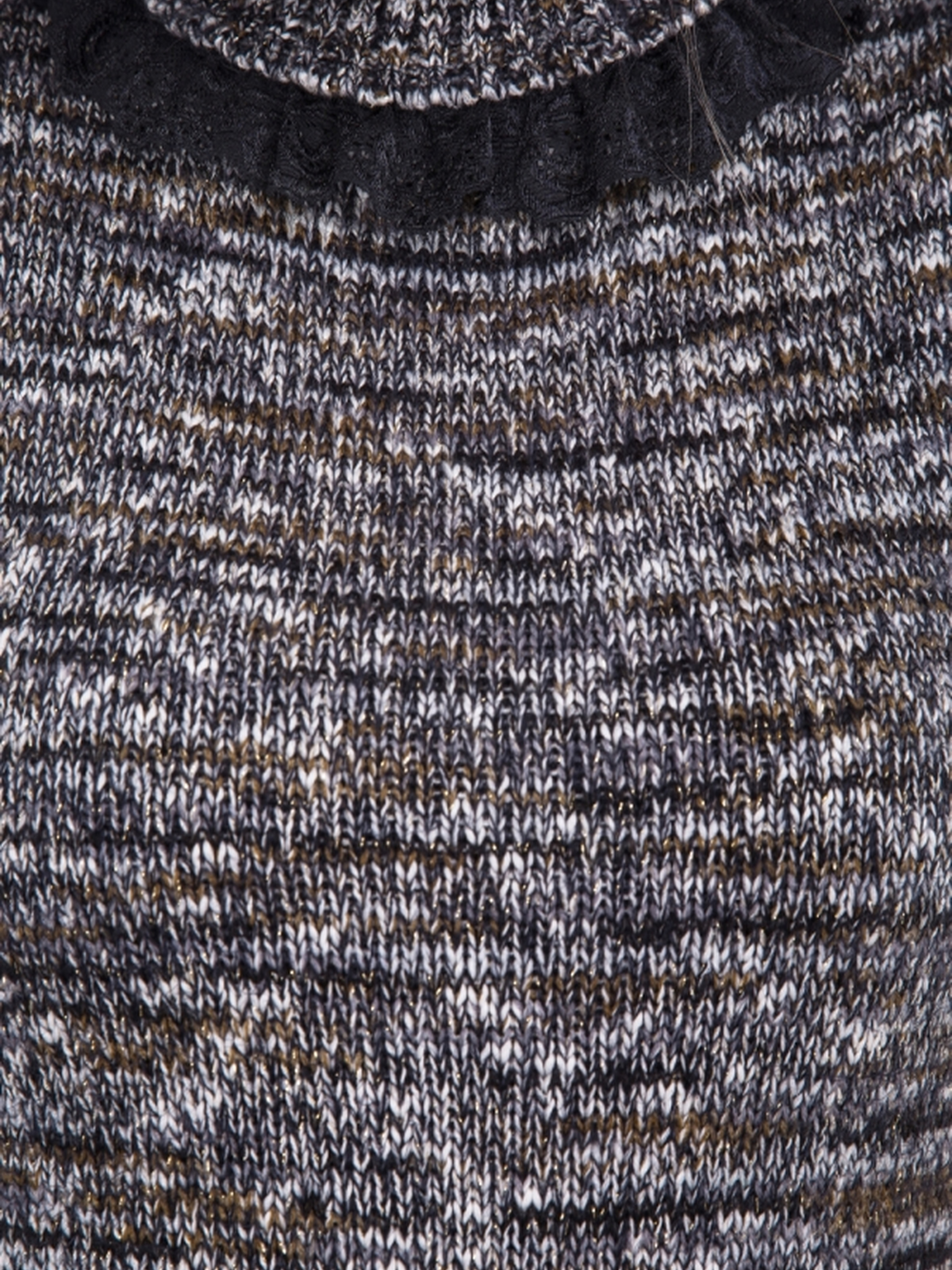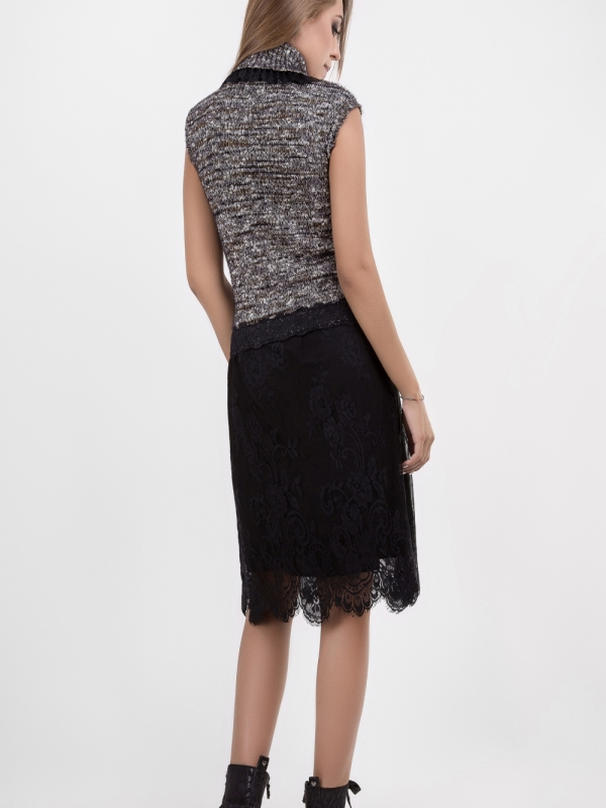 Цей незвичайний джемпер виконаний із сумішевої пряжі, що поєднує бавовну та мерехтливий люрекс. Багатобарвна меланжева пряжа, з якої виготовлений виріб, додає текстури та дозволяє легко комбінувати жилет з будь-якими однотонними елементами гардеробу. Високий комір-стійка з відворотом створює відчуття тепла та комфорту, а окантовка країв чорним мереживом додає романтичності образу. • Матеріал: сумішеві бавовна та люрекс • Довжина виробу: 54–57 см • Декор: чорне мереживо, високий комір-стійка Цей джемпер стане ідеальним доповненням для стильного та затишного образу на будь-який випадок.