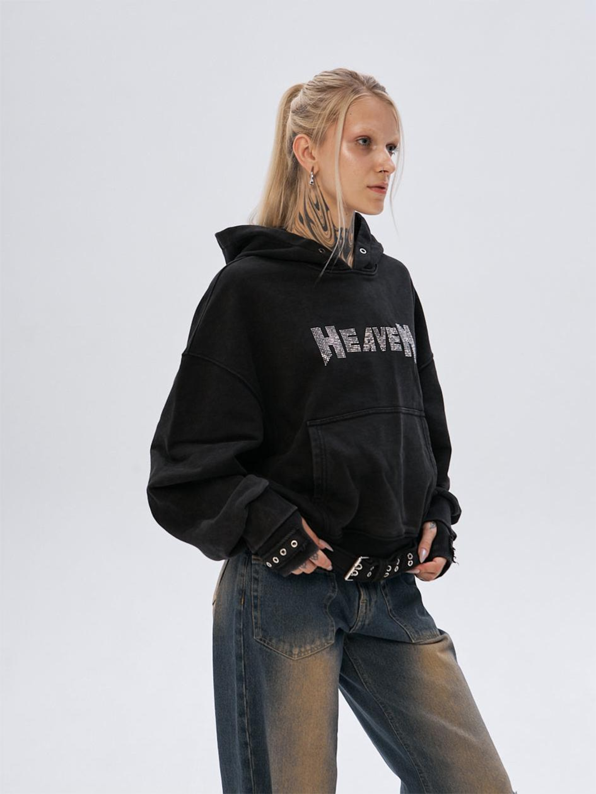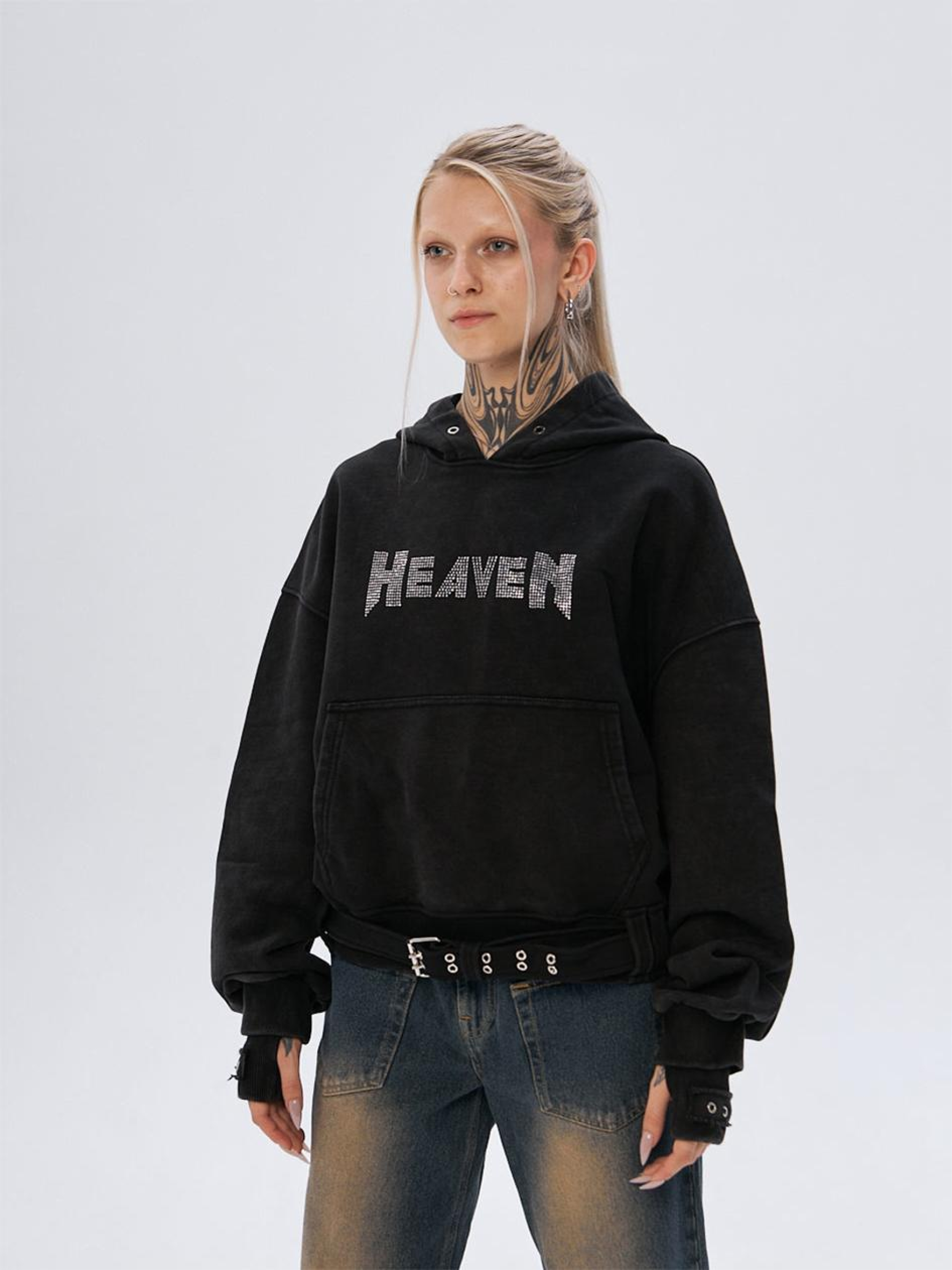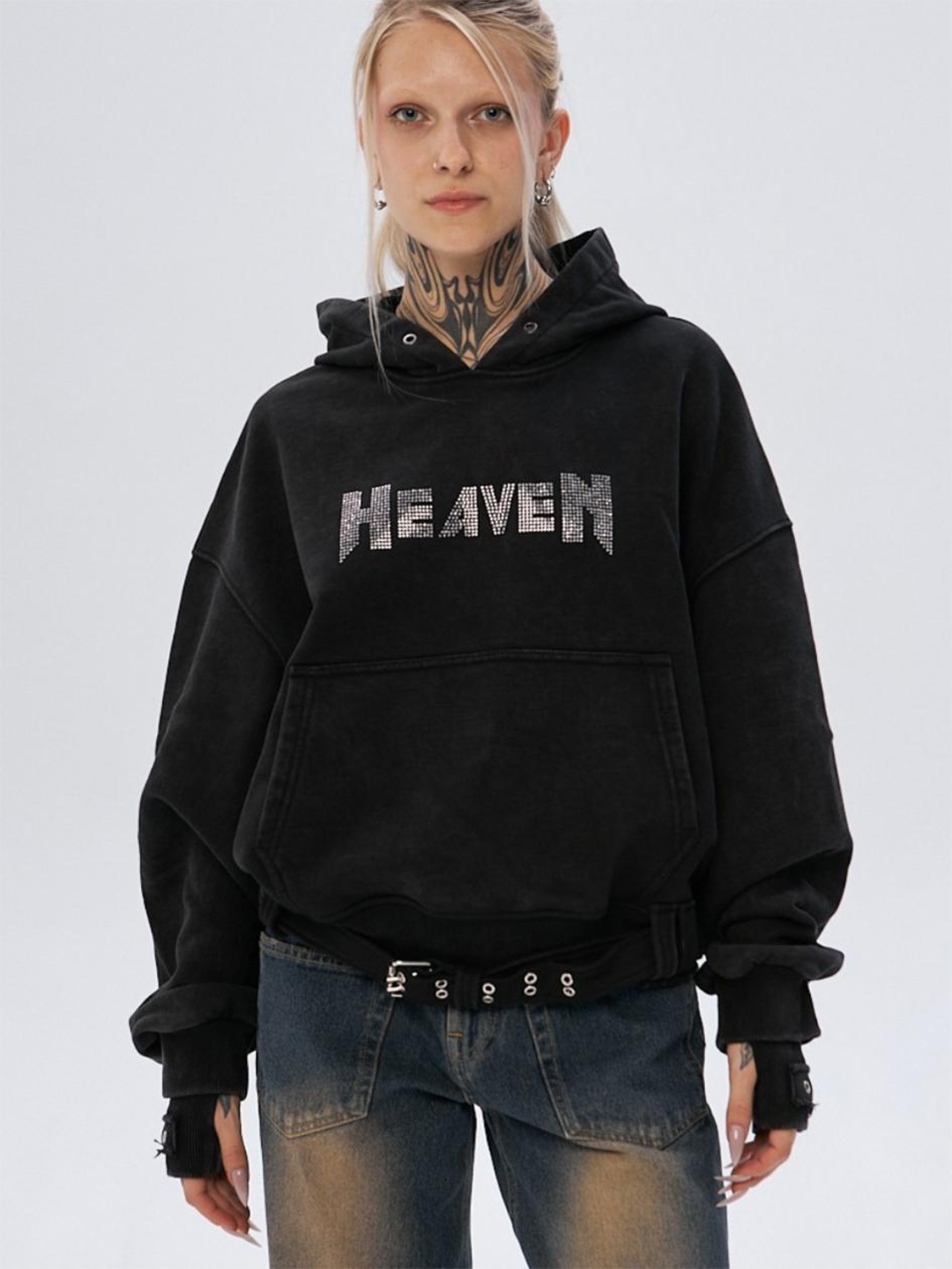 Склад тканини: 95% котон, 5% поліестер. Особливості матеріалів та фурнітури: Плотний котон — міцний і стійкий до зношування матеріал з високою дихаючою здатністю. Поліестер додає тканині стійкість до механічних пошкоджень і допомагає зберігати форму після прання, підвищуючи її довговічність Ключові особливості моделі: Худі з плотного котону об'ємного крою, виготовлене з використанням технології промислового прання для досягнення ефекту вицвілого кольору. Рукав з подвійним манжетом. Худі прикрашене багатьма декоративними елементами: пояс з металевою пряжкою по низу виробу, металеві люверси по всьому виробу та принт зі стразами з написом "HEAVEN". Супутні товари: Спідниця коротка SW-2421, Джинсові карго Вайд, Шкіряні карго Скін Рекомендації по догляду: Машинне прання при макс. 30 ºC Не можна використовувати відбілювач Прасування при макс. 120 ºC Хімчистка заборонена Можна сушити в сушарці за низької температури