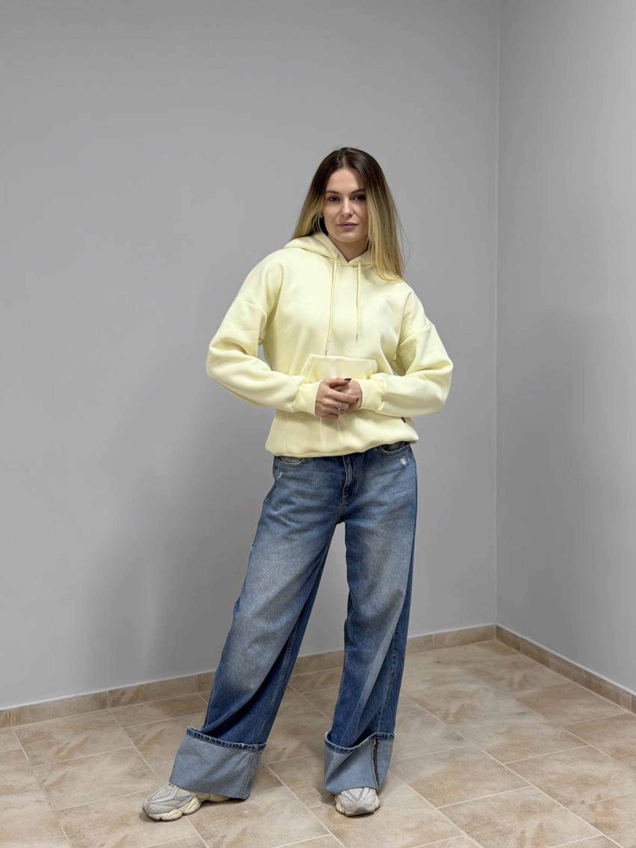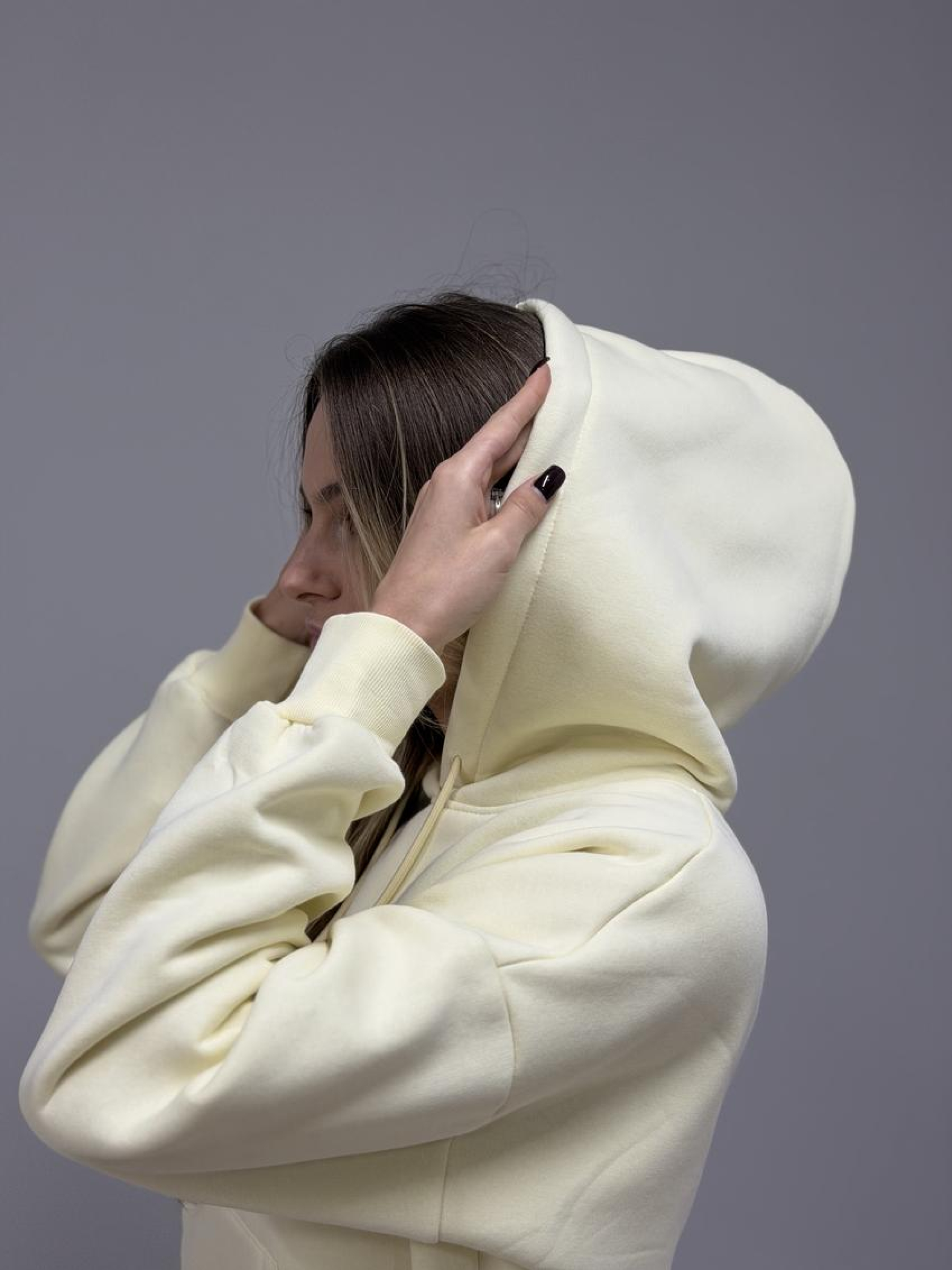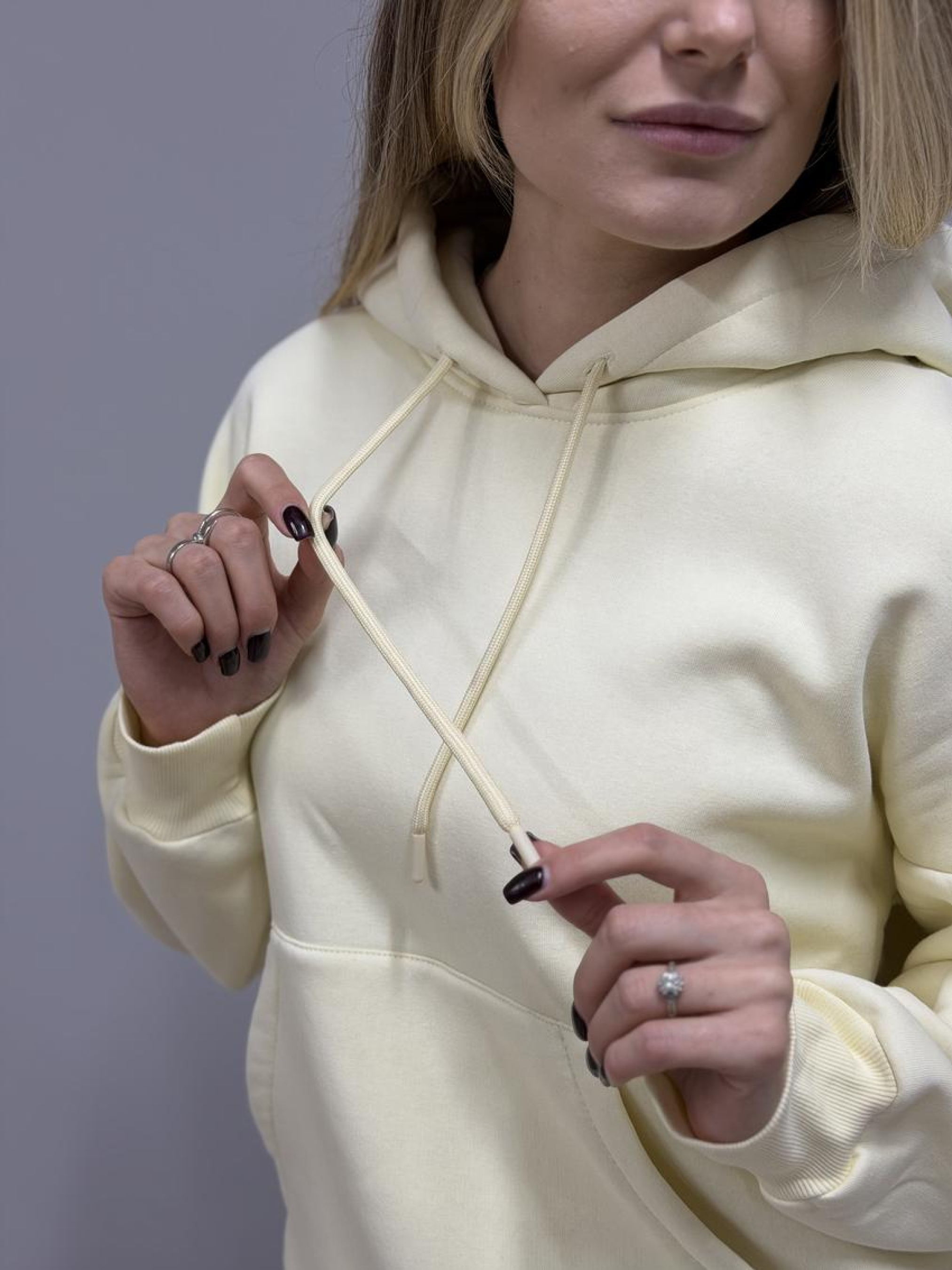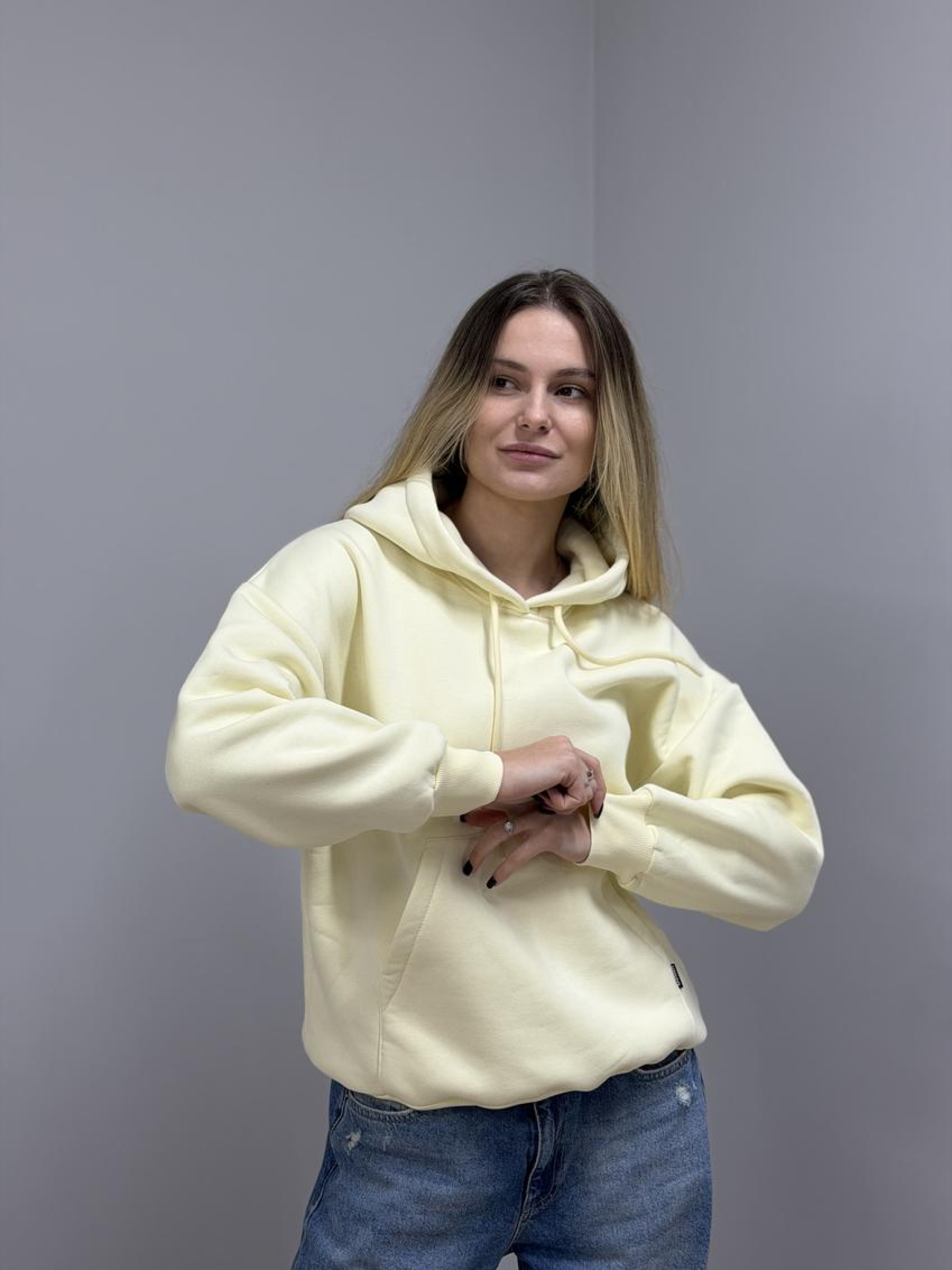 Худі жіноче з капюшоном і начосом Тепле й затишне худі для щоденних образів. М’який начос усередині зігріває, а щільний трикотаж тримає форму та зберігає акуратний вигляд після численних прань. Переваги М’який теплий начос ізсередини — комфорт у прохолодну погоду. Щільний трикотаж (футер/фліс) не просвічує та стійкий до кошлатання. Капюшон на кулісці — захист від вітру й регулювання посадки. Зручна кишеня «кенгуру» для телефону та дрібниць. Еластичні манжети та нижня резинка формують охайний силует. Акуратні закріпки та міцні шви — довговічність у носінні. Базові універсальні кольори — легко поєднувати з гардеробом. Деталі крою Комфортна жіноча посадка, вільна лінія плеча та достатня довжина для тепла й свободи рухів. Склад і матеріал Бавовна/поліестер (точні пропорції та щільність зазначені на ярличку партії). Усередині — м’який начос для додаткового тепла та приємного дотику до шкіри. Догляд Прання при 30 °C у делікатному режимі, вивернувши навиворіт. Не використовувати відбілювачі та агресивні засоби. Сушити подалі від прямих джерел тепла; машинна сушка — щадний режим. Прасувати на низькій температурі через тканину, оминаючи принти.