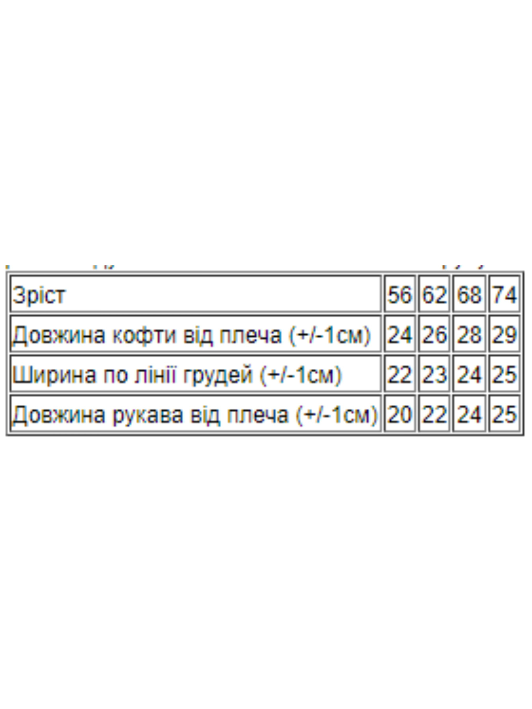 Полотно: начос принтований Склад полотна: 100% бавовна Зріст: 56-74 Класична ясельна кофточка з набивного начоса. Прати при температурі не більше 30 ° C дає усадку на 1-2 см. Тканина з якої був виконаний пошив чудово зігріває і зберігає тепло. Продукція бренду відрізняється європейськими стандартами якості і відшивається тільки з сертифікованої сировини. Весь одяг вироблений фабрикою строго відповідає розмірній сітці. На бірочці вказано орієнтовний зріст дитини а в таблиці - реальні виміри які зробили наші менеджери. Приємних Вам покупок! P.S. У догляді рекомендуємо дотримуватися наступних правил: прання НАВИВОРІТ при температурі 30 градусів (при пранні в більш гарячій воді виріб може дати усадку на 1-3 см.) Бажано - ручна не рекомендується сильно вичавлювати і скручувати прасувати на виворіт