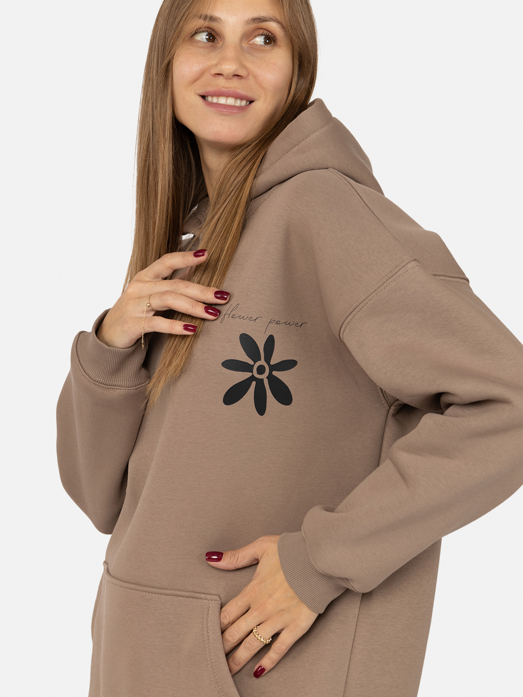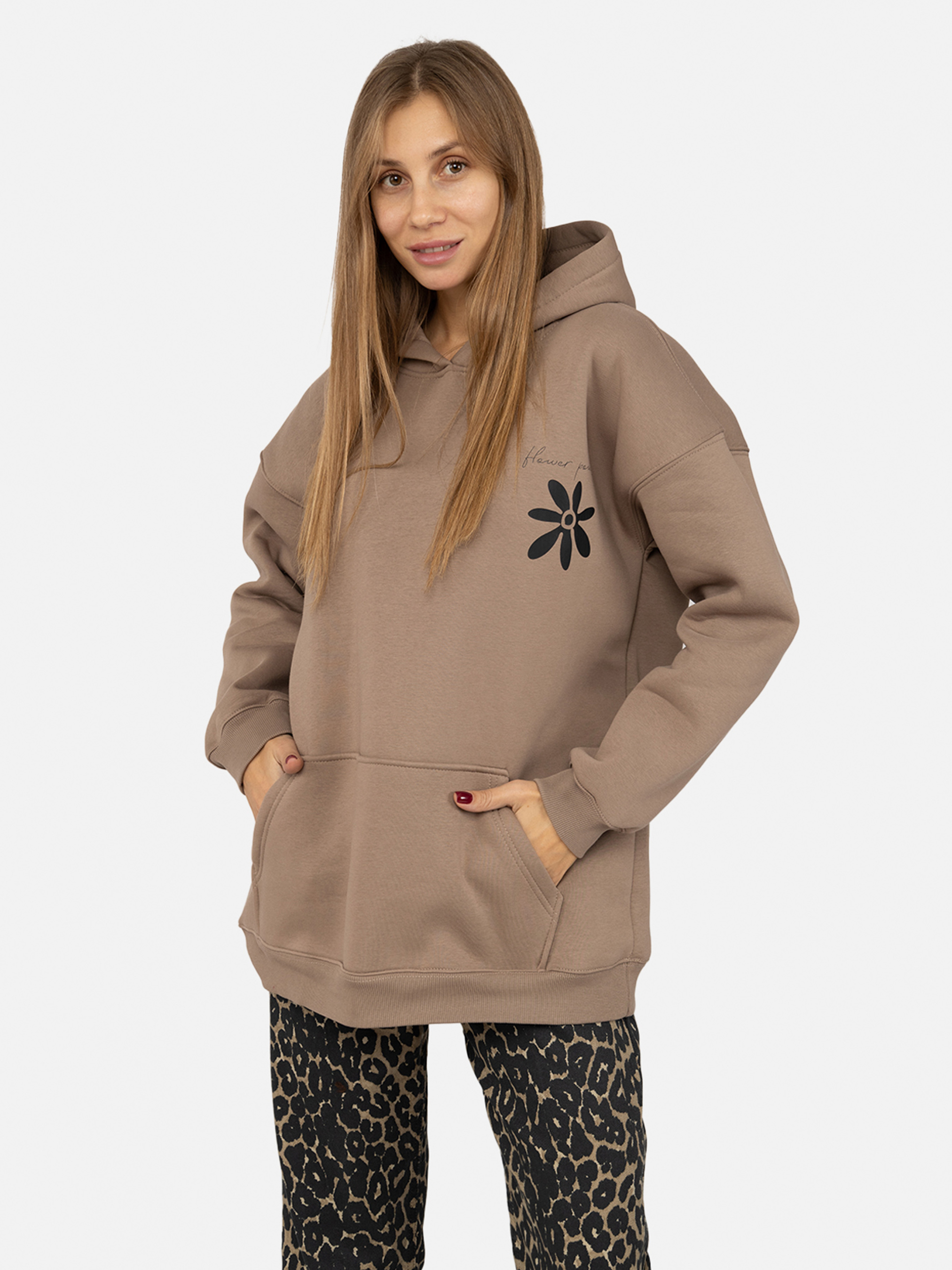 Жіночий худі – це зручна та стильна річ вашого гардеробу для повсякденного носіння. Виготовлений з високоякісних матеріалів, що дозволить рухатися вільно і легко. Каптур захистить від прохолодної погоди. Особливості худі: Колір: коричневий, з декоративним принтом. Матеріал виготовлення: футер. Склад: 65 % бавовна, 35 % поліестер. Худі має каптур та наскрізну кишеню спереду. З еластичними манжетами на рукавах та резинкою знизу. Довжина: середня. Крій худі: оверсайз. Сезон: зима. Параметри моделі: Зріст: 170 сантиметрів. Розмір на моделі: М / український розмір: 46. Країна виробник: Україна.