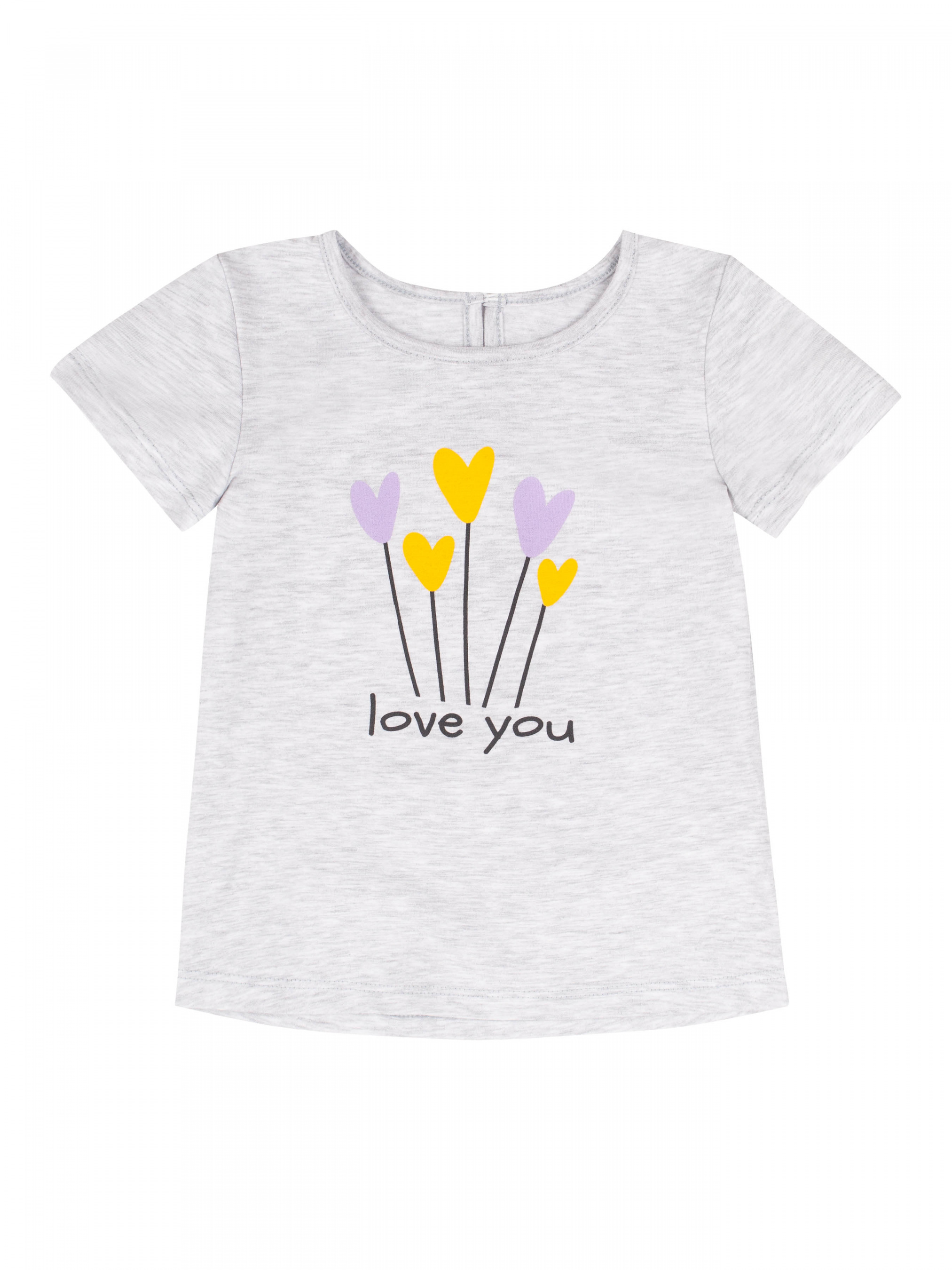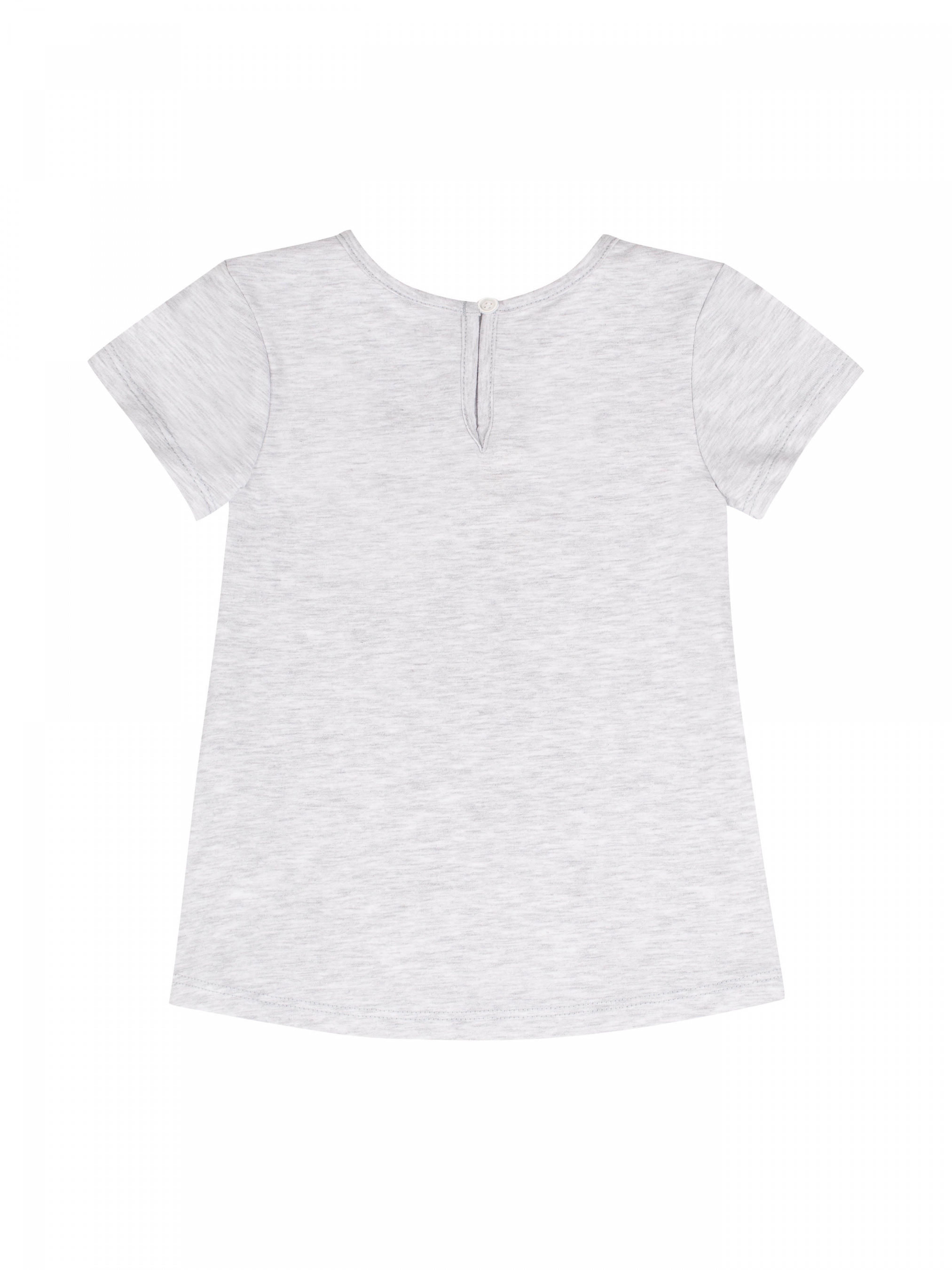 Футболка з коротким рукавом для дівчинки. Застібається ззаду на ґудзик. Тканина еластична, меланж. Спереду лаконічний принт.