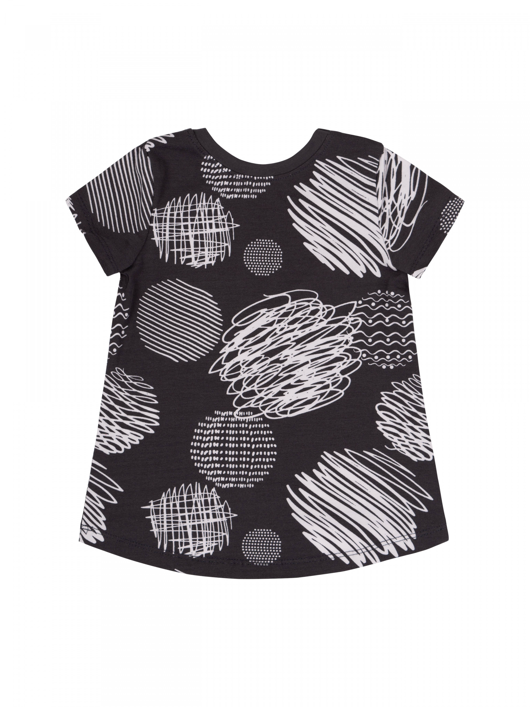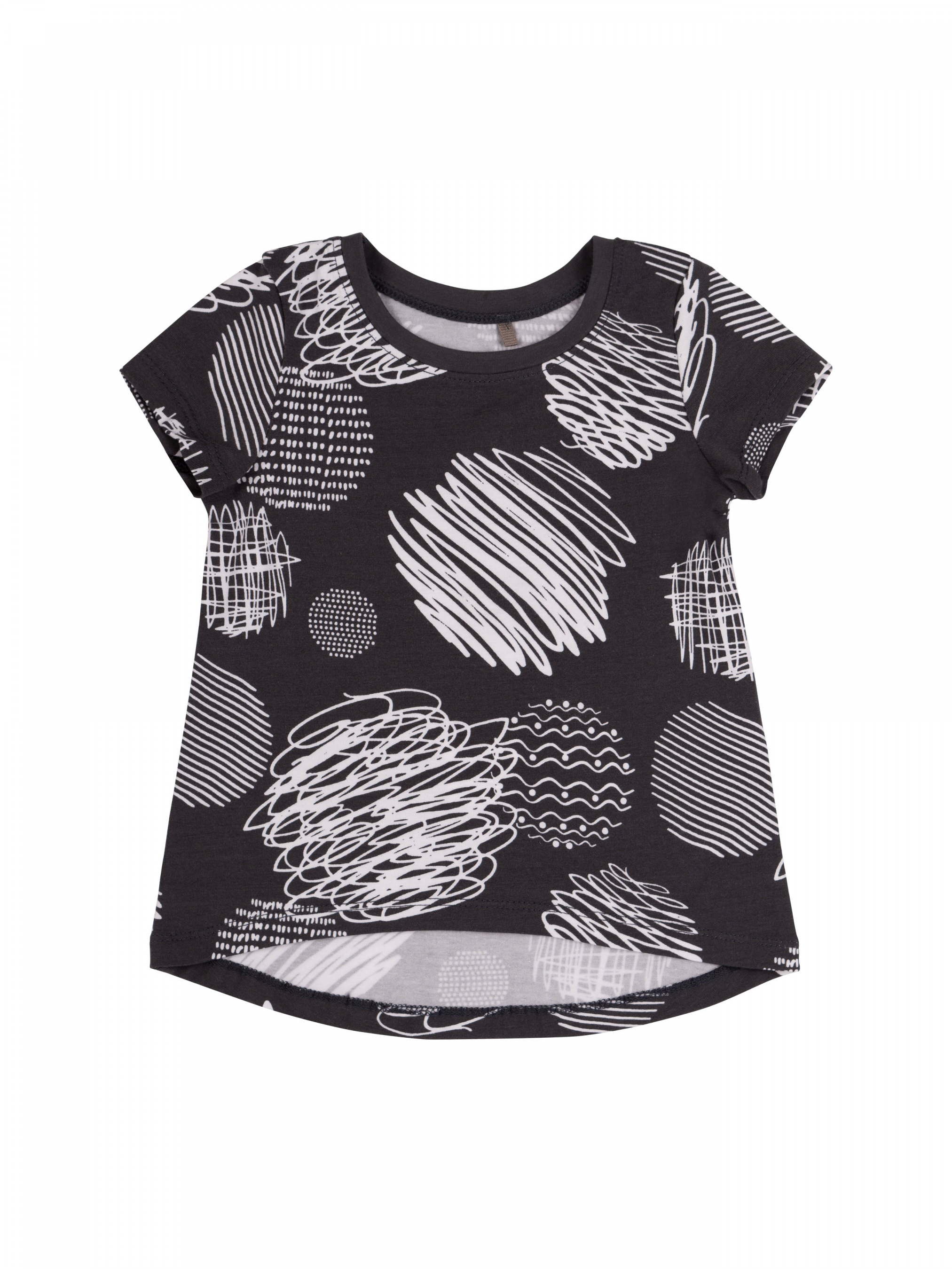 Футболка з коротким рукавом для дівчинки. Модель вільного крою, спинка подовжена. Тканина еластична, в малюнок.