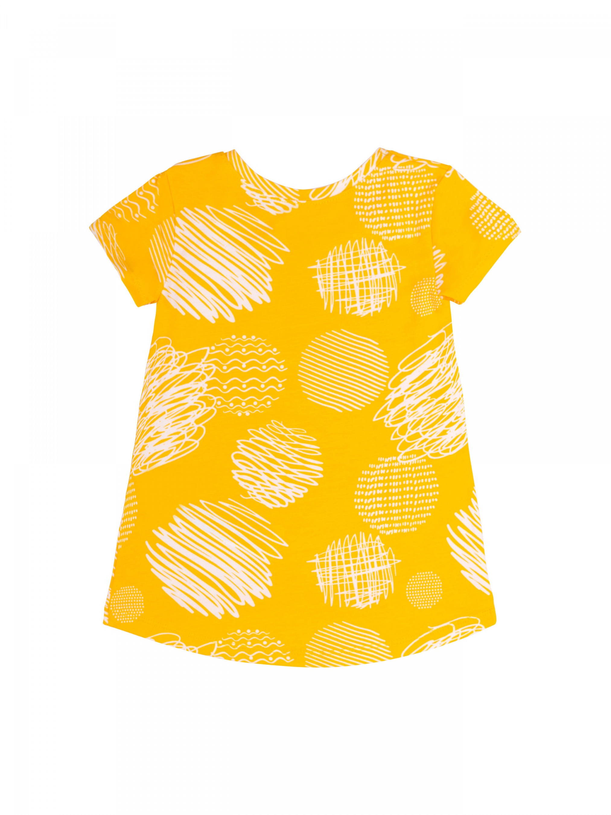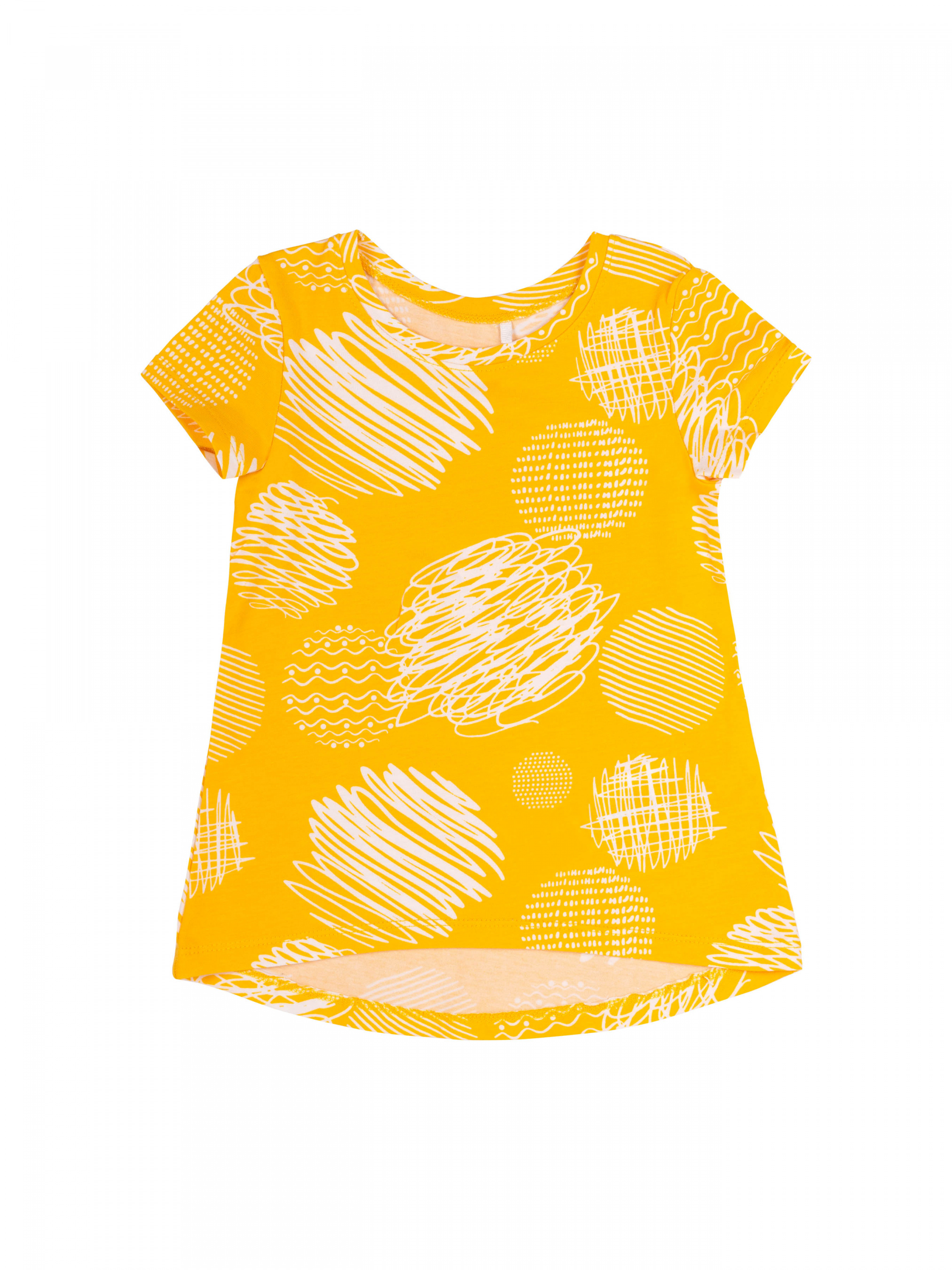 Футболка з коротким рукавом для дівчинки. Модель вільного крою, спинка подовжена. Тканина еластична, в малюнок.