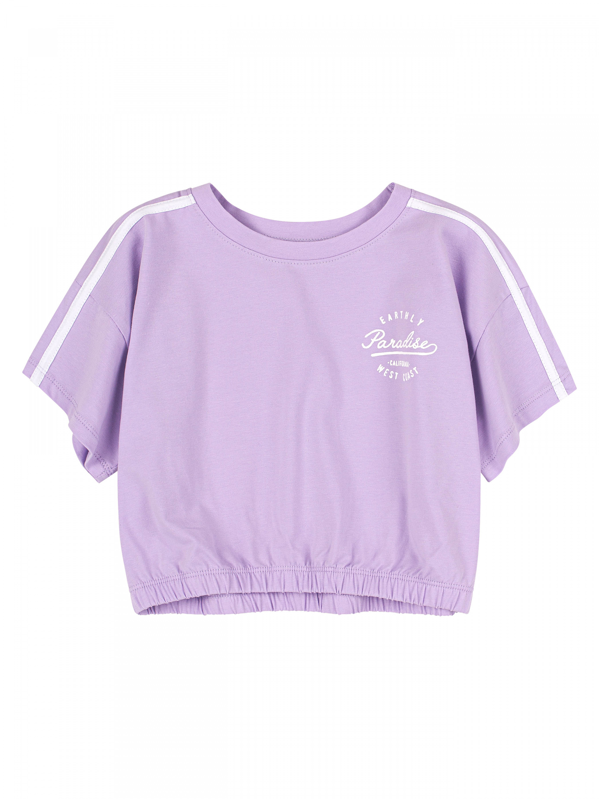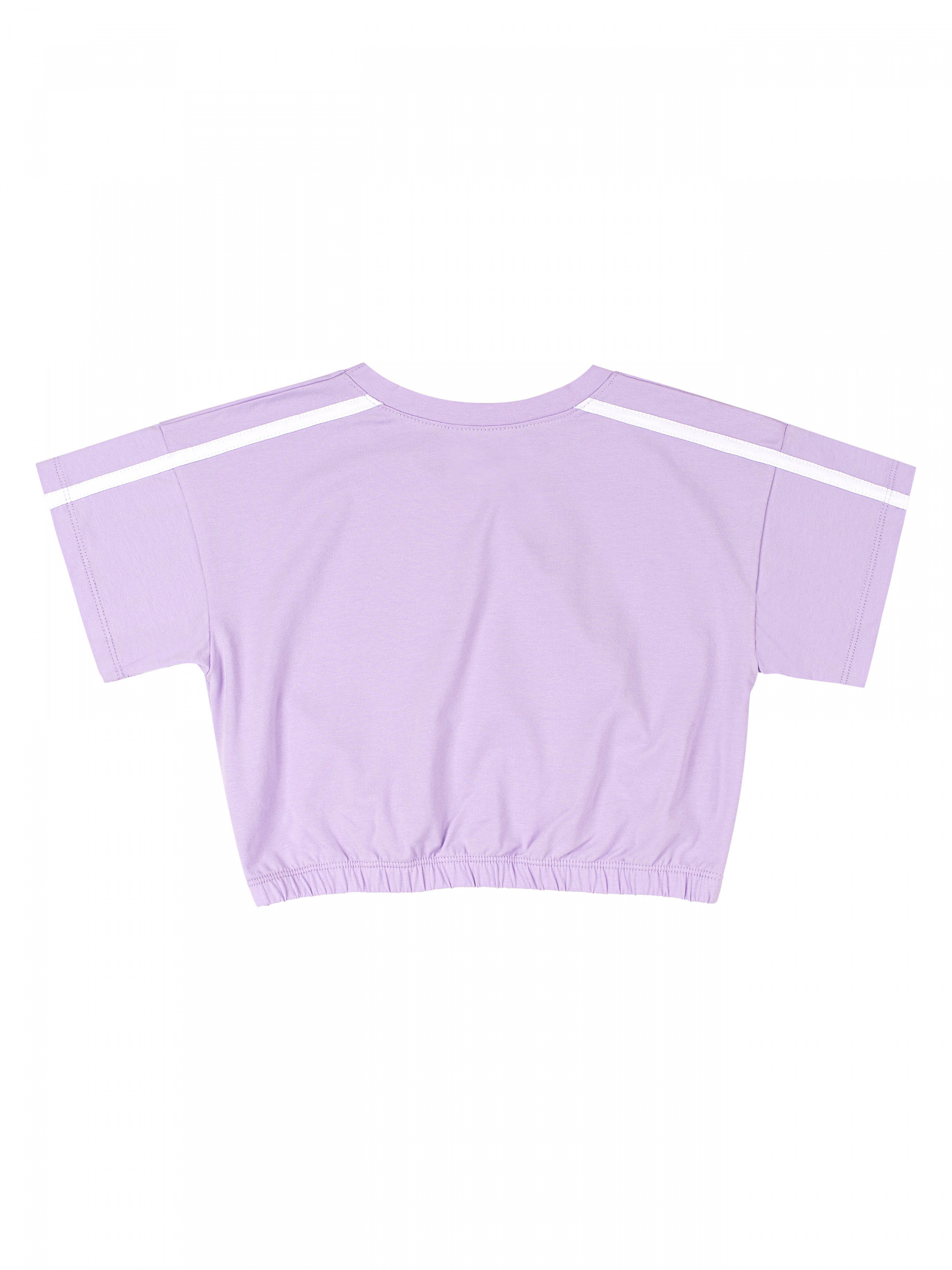 Футболка для дівчинки. Крій вільний, модель вкорочена. Низ на резинці. На рукаві лампас білого кольору. Тканина еластична, однотонна.