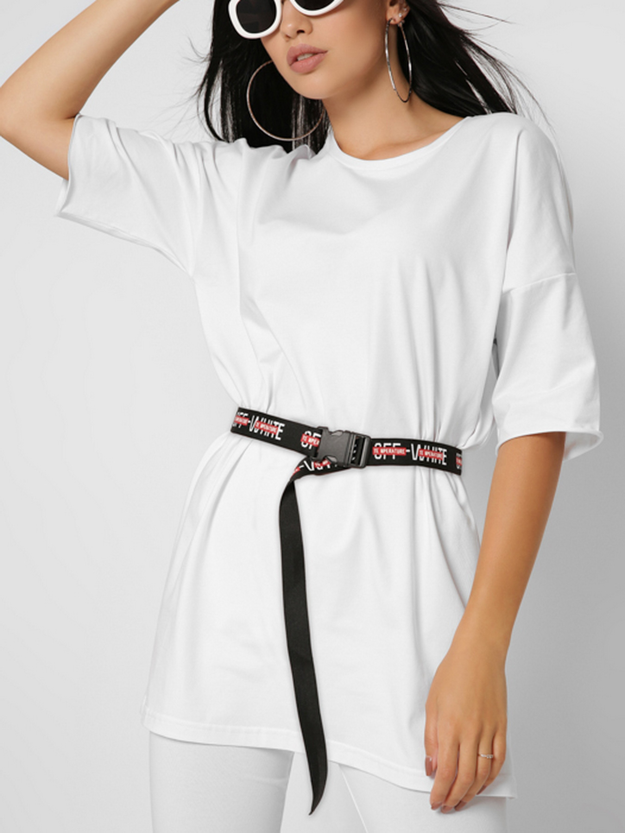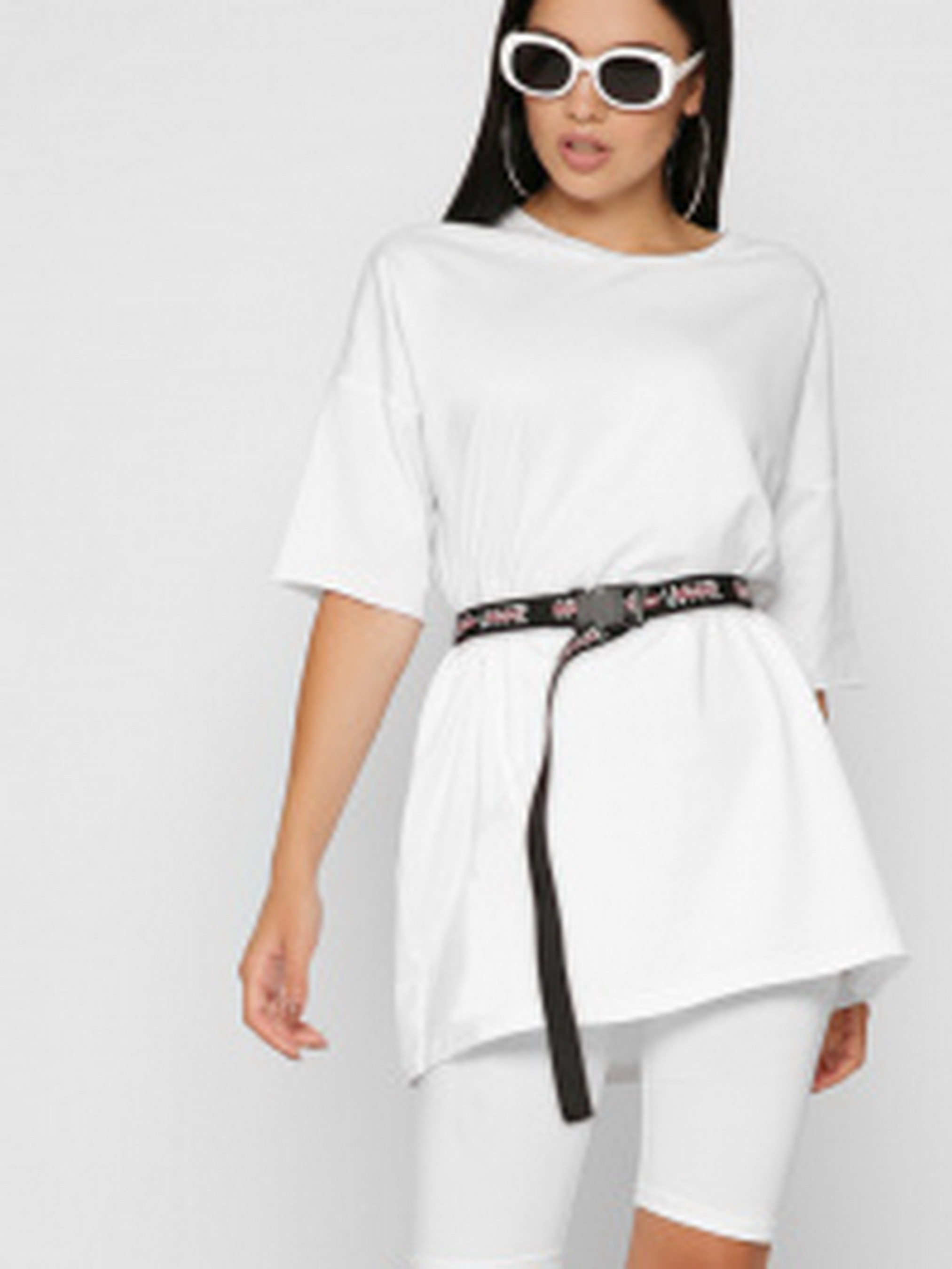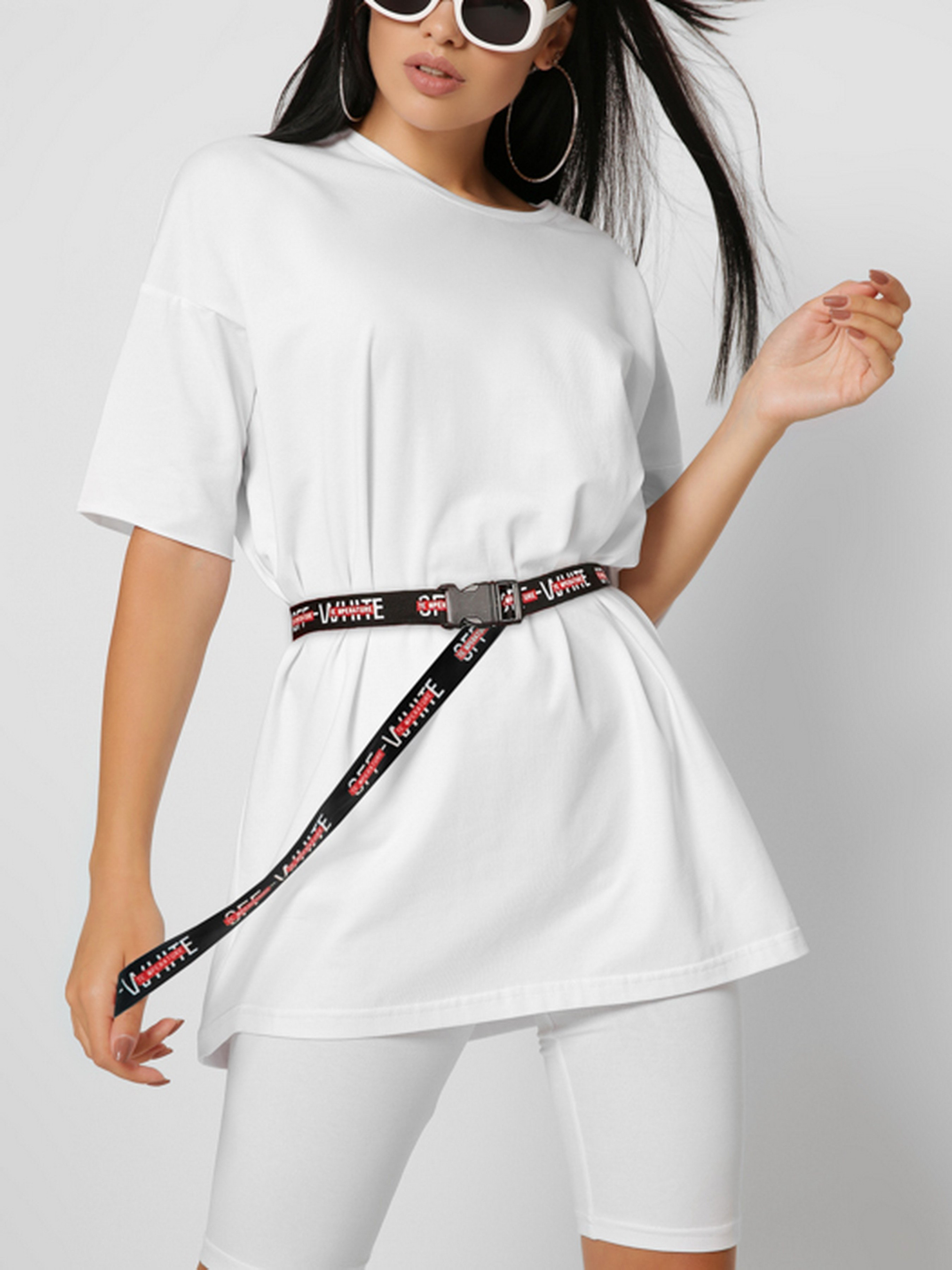 Однотонна жіноча футболка. Модель фасону oversize з подовженим рукавом і круглим вирізом. У комплекті контрастний пояс з написом Off-White. Створіть стильний комплект з цієї футболки і велосіпедок в тон.