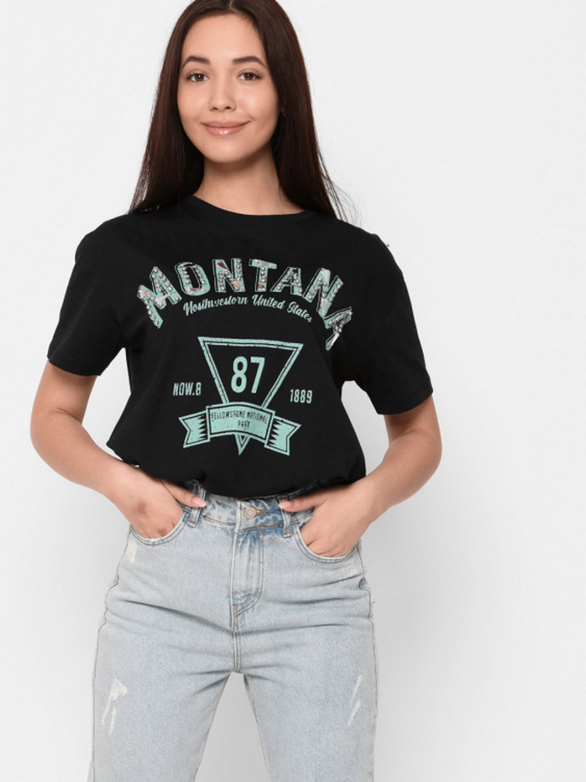 Стильна жіноча футболка вільного фасону. Модель з м'якого і приємного до тіла матеріалу. Короткі рукави і круглий виріз. Спереду контрастний принт з написом «Monatana» прикрашеної бісерінкамі.